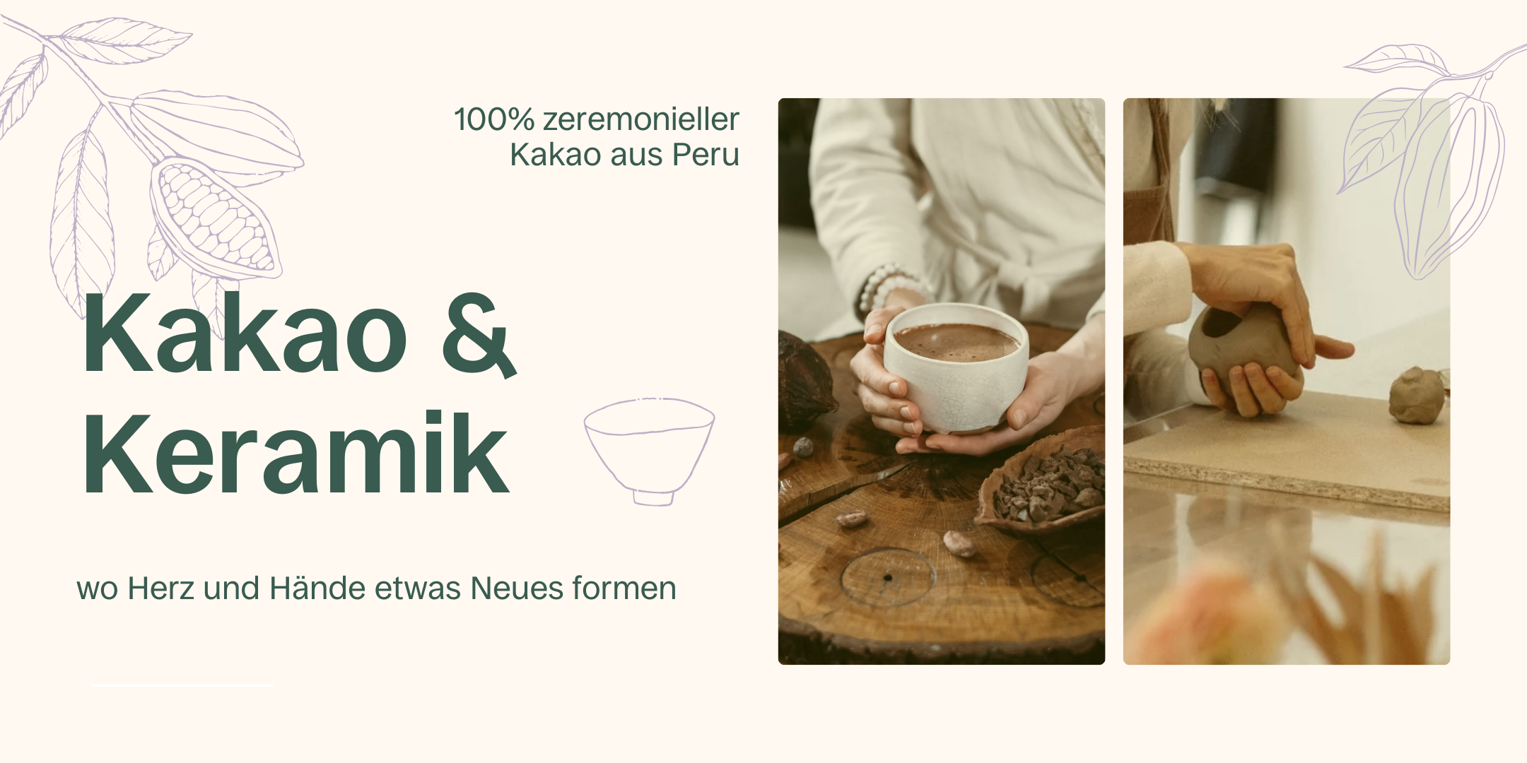 Gönn dir eine kreative Auszeit: Bei *Kakao & Keramik* erwarten dich eine herzöffnende Kakaozeremonie mit 100 % Rohkakao aus Peru und achtsames Töpfern unter Anleitung von Anna Steinschaden und Sarah Hartleib. Forme deinen eigenen Keramikbecher, genieße Tee & Snacks und komm ganz bei dir an. Inklusive Keramikstück, Achtsamkeitsimpulse und Wohlfühl-Goodiebag.