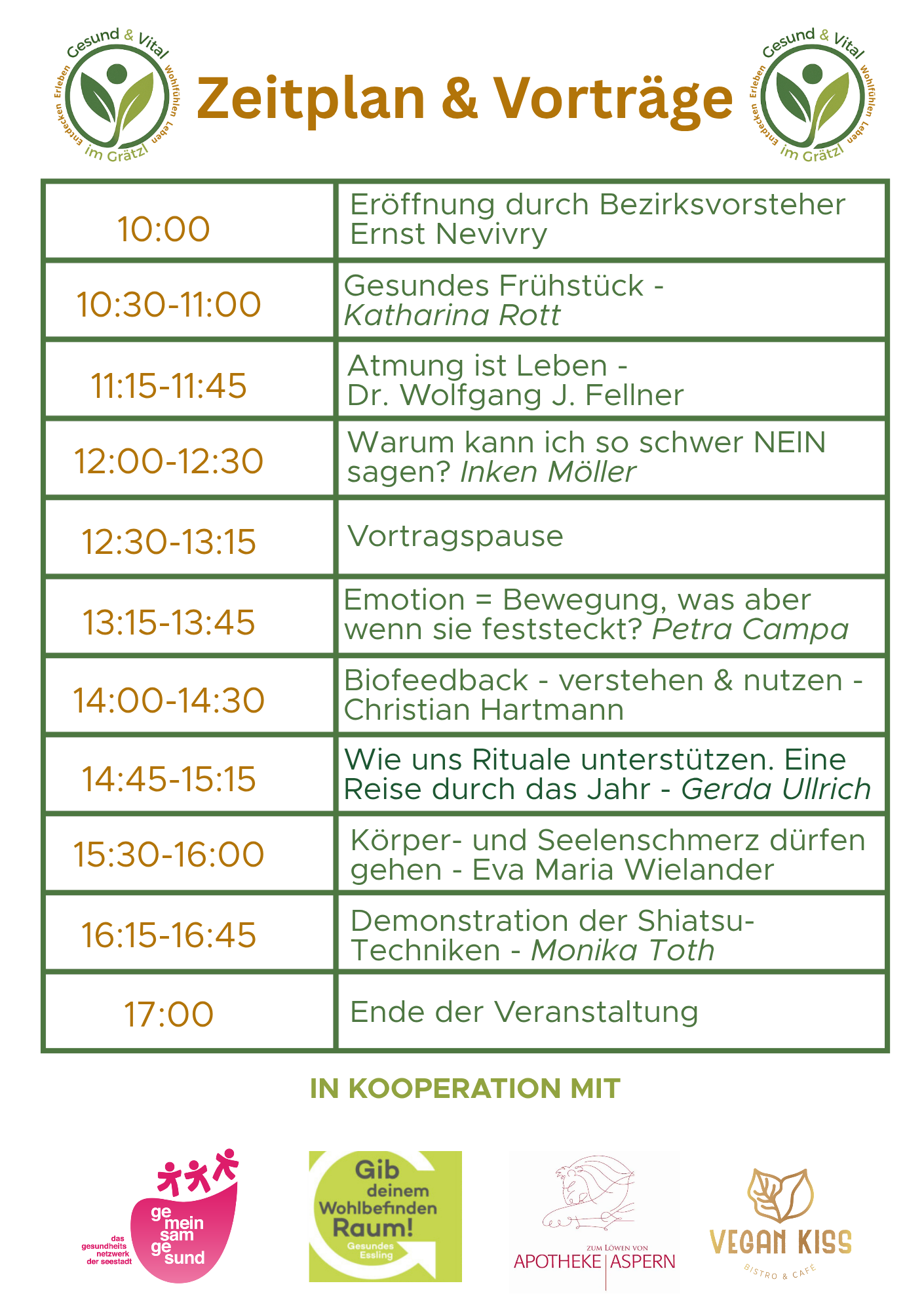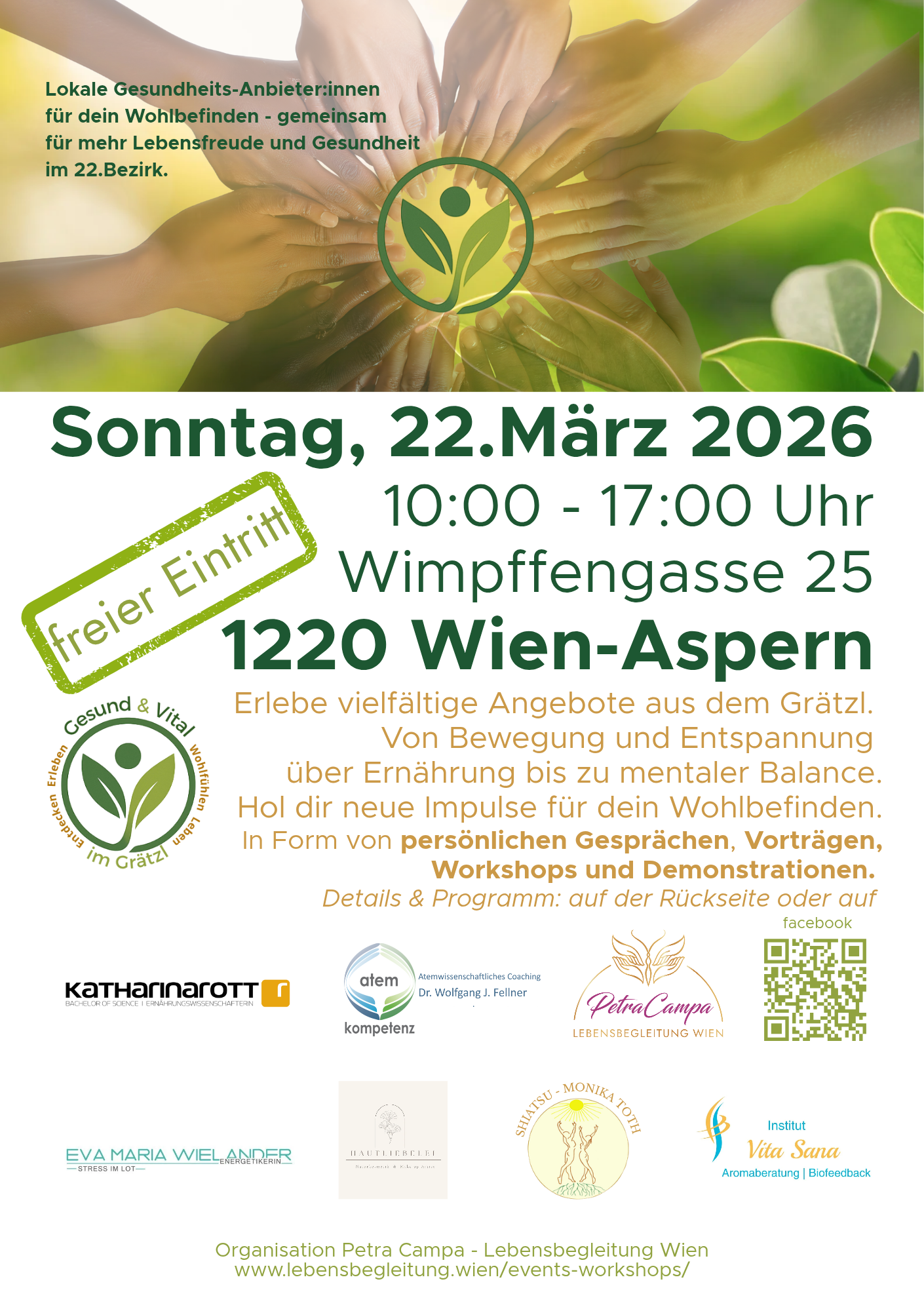 "Gesund & Vital im Grätzl" ist eine kostenfreie Gesundheits- und Wohlfühlveranstaltung mit Fokus auf ganzheitliches Wohlbefinden - direkt aus dem Grätzl, für das Grätzl.