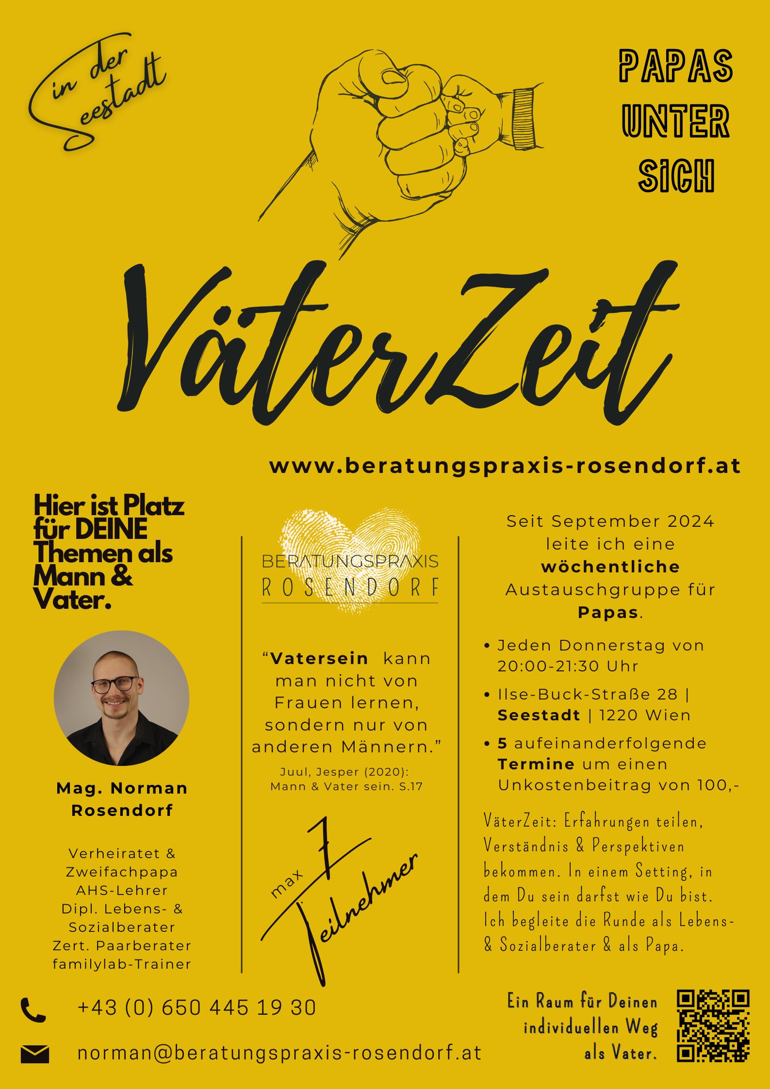 Seit über einem Jahr leitet mein Mann Norman eine Austauschrunde für Papas (VäterZeit) in der Seestadt, also freu ich mich sehr darauf ab Mitte Februar ein ergänzendes Angebot für Mamas anbieten zu können. Für Fragen oder Anmeldungen, melde dich sehr gern bei mir!