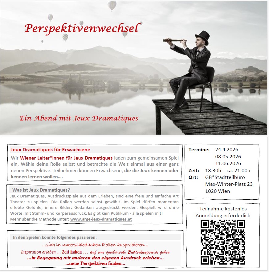 Du spielst gern Theater möchtest aber keine Texte auswendig lernen? Du hast nur wenig Zeit und kannst deshalb nicht zu Proben kommen? Kein Problem! Hier ist was du suchst- Jeux Dramatiques! Spontan in eine selbstgewählte Rolle schlüpfen und sofort spielen. Gemeinsam mit dein Mitspielenden die Geschichte entwickeln und erleben. Überraschungen erleben und Erkenntnisse gewinnen! Die Termine können unabhängig voneinander besucht werden! Die Teilnahme ist kostenlos! Anmeldung erforderlich! (über den QR Code möglich oder direkt hier!