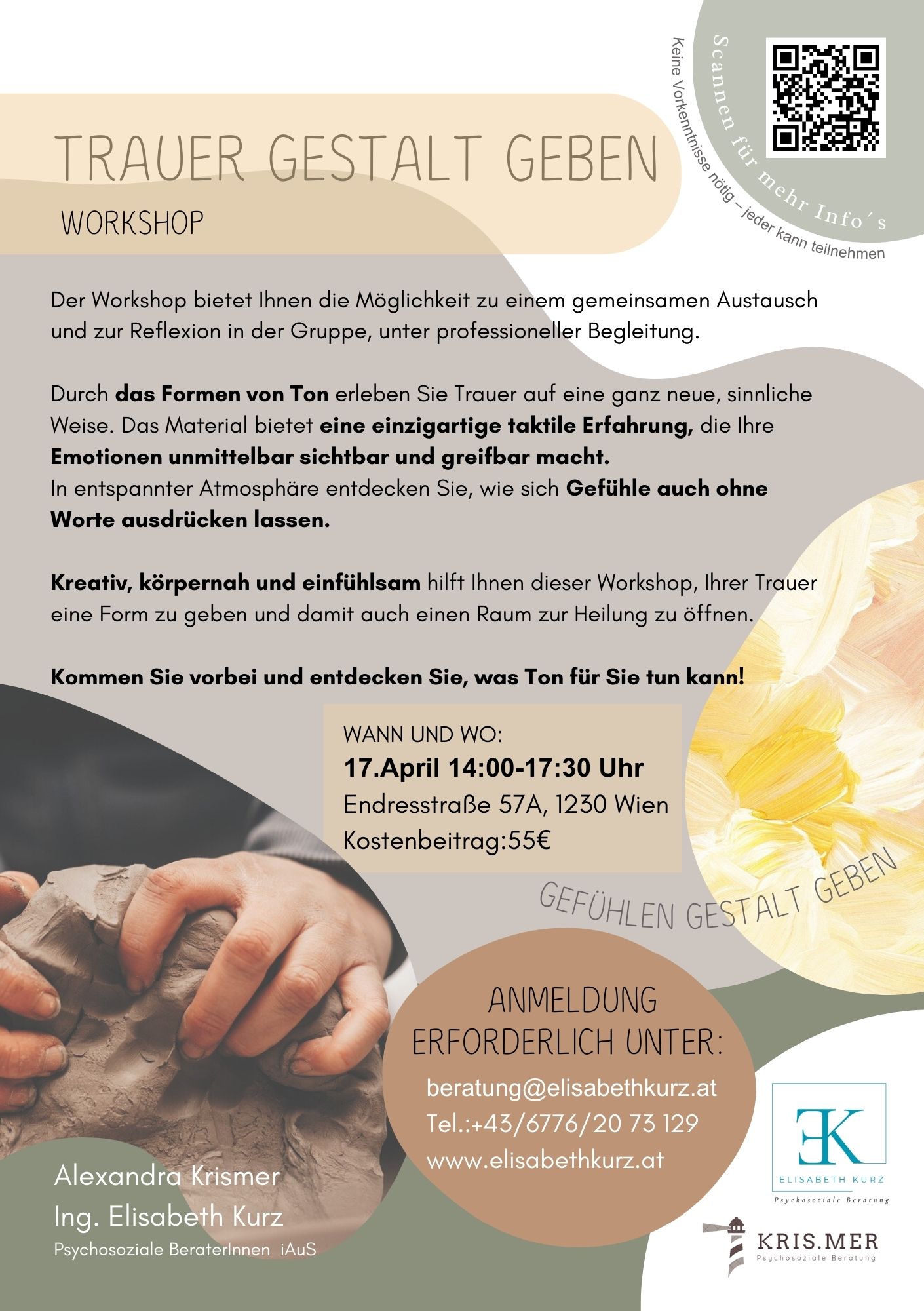 Kreativ, körpernah und einfühlsam hilft Ihnen dieser Workshop, Ihrer Trauer eine Form zu geben und damit auch einen Raum zur Heilung zu öffnen.