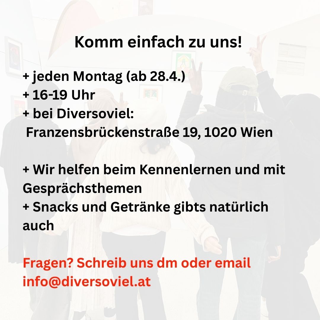 Dann komm zu den SPRECHSTUNDEN girls bei Diversoviel. Jeden Montag 16-19 Uhr in der Franzensbrückenstraße 19, 1020 Wien. Das ist die Gelegenheit für Austausch, neue Begegnungen und Empowerment!