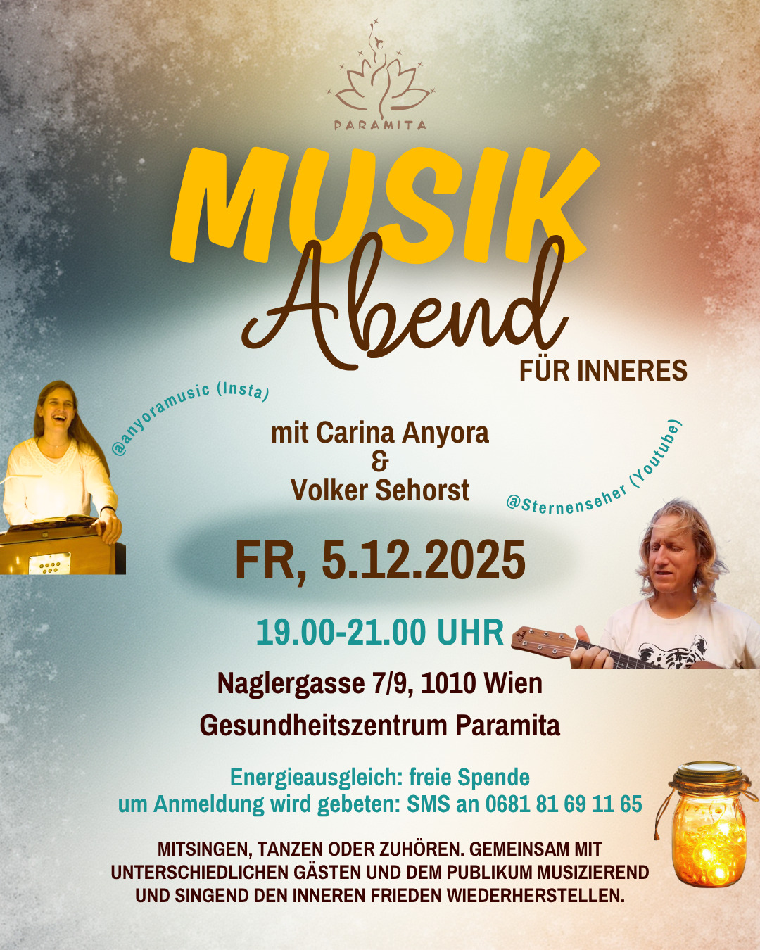 Wir starten mit interaktiven Vorträgen über Tibetische Medizin und Astrologie, Schönheit durch gesunde Haut sowie einer Energetischen Überraschung. Ab 19.00 wird dann gemeinsam hochkarätig besetzt musiziert. Carina & Volker laden diesmal Sofie Royer & Martin Lust sowie das gesamte Publikum zum Mitsingen und instrumentalisieren ein. Schließlich runden das Programm kulinarische Leckereien und Punsch ab. Wir freuen uns auf Dein Kommen!
