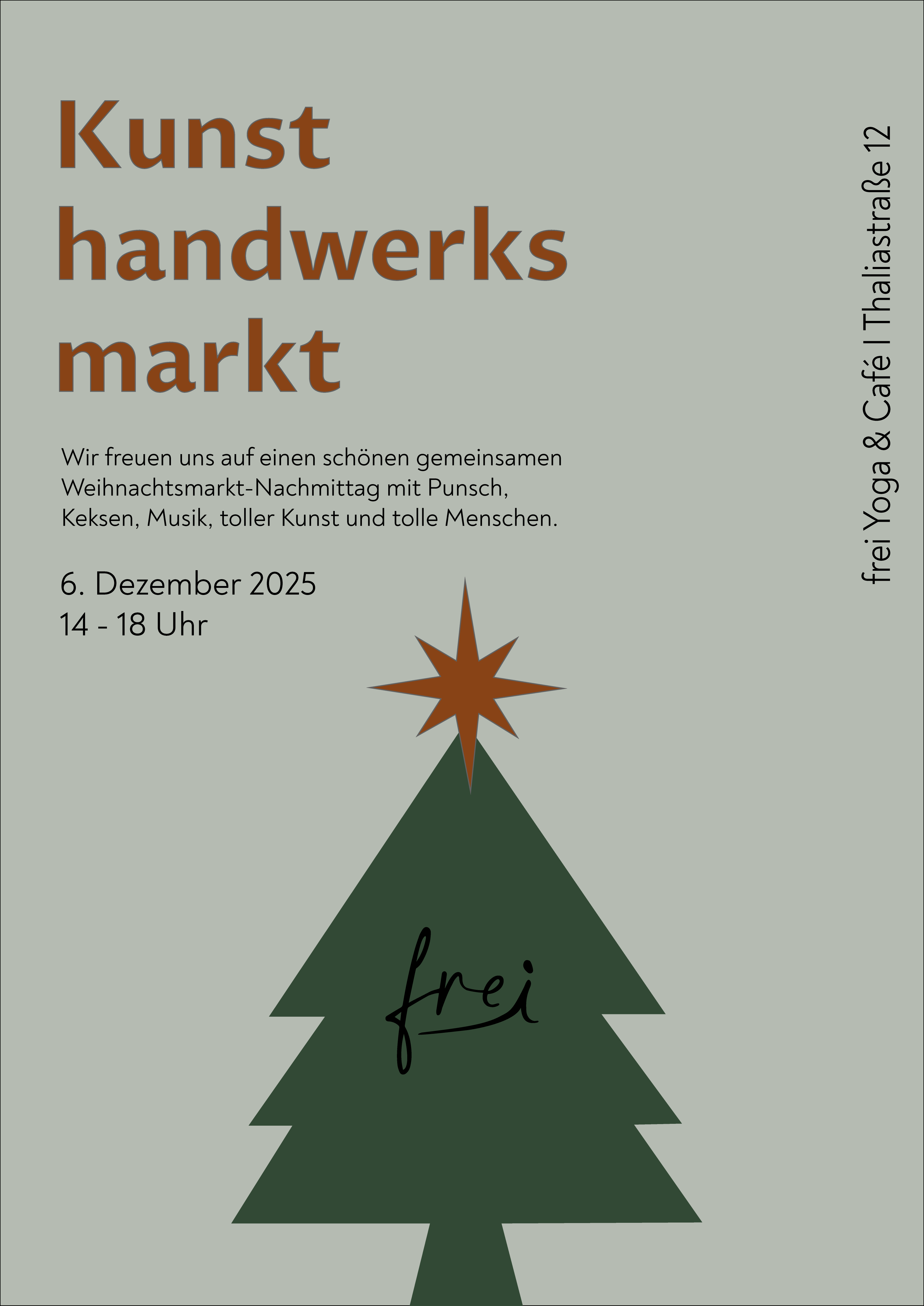 Kunsthandwerks-Weihnachtsmarkt im frei Yoga & Café Samstag 06.12.2025 I 14.00-18.00 Wir freuen uns auf einen schönen gemeinsamen Weihnachtsmarkt-Nachmittag mit Punsch, Keksen, Musik, toller Kunst und tollen Menschen. Mehr Infos über die Austeller*innen findet ihr auf instagram: