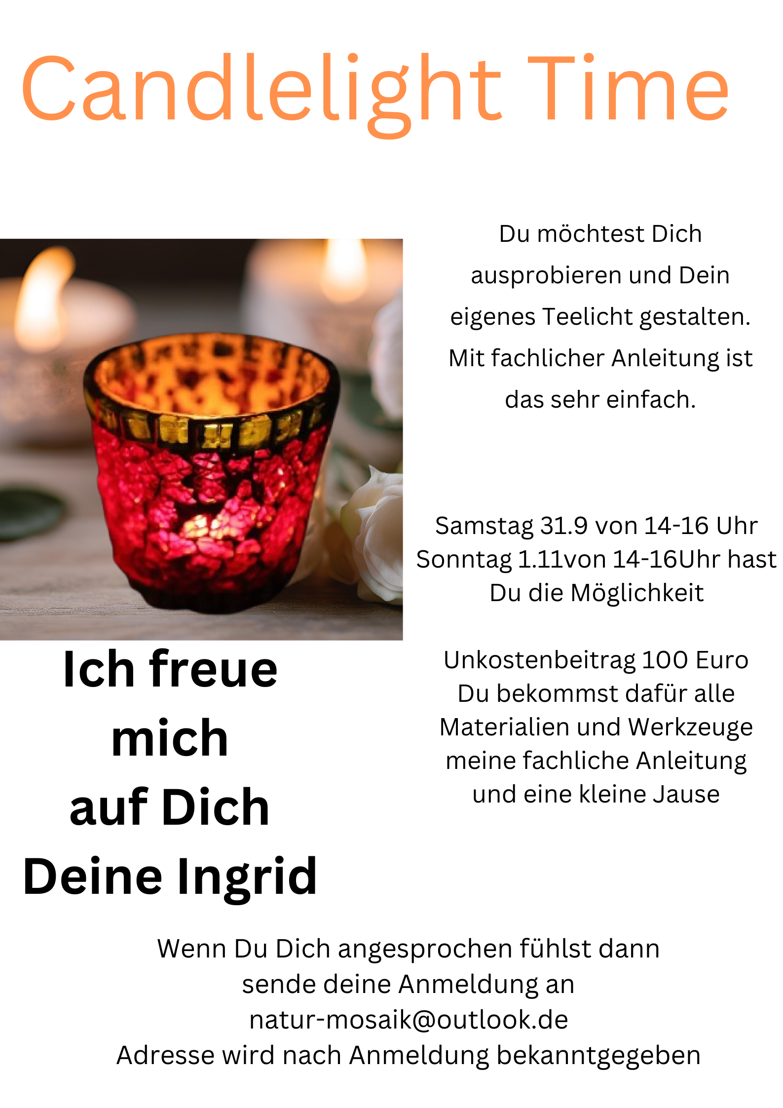 Du wolltest dich kreativ ausprobieren, hier hast du die Möglichkeit schon immer In diesem Workskshop lernst du wie du aus Mosaiksteinen dein eigenes Teelicht kreierst. Vom kleben bis Verfugen ist alles dabei.