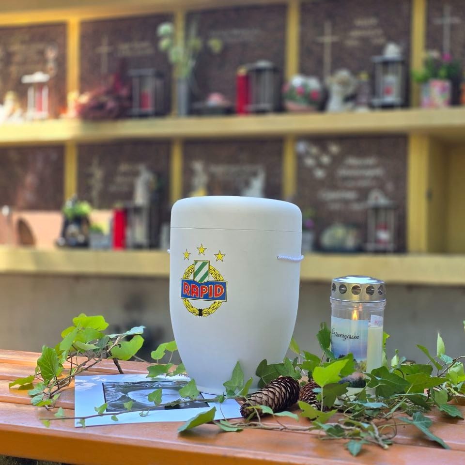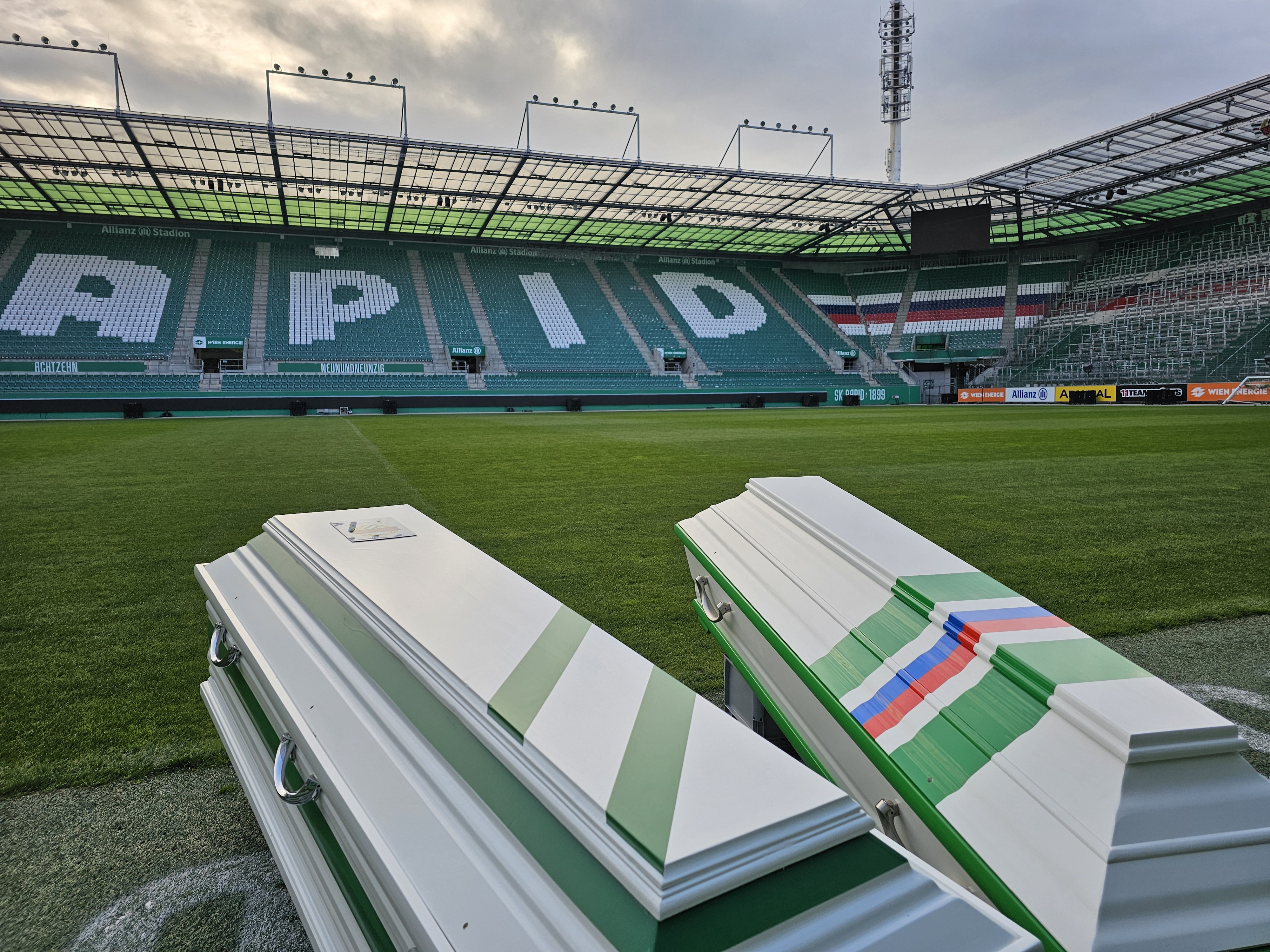 Aufgrund einer Lizenzvereinbarung ist es uns exklusiv gestattet, dass Rapid Wappen zu verwenden und dadurch ganz spezielle Abschiede für Rapid Fans in die Tat umzusetzen.