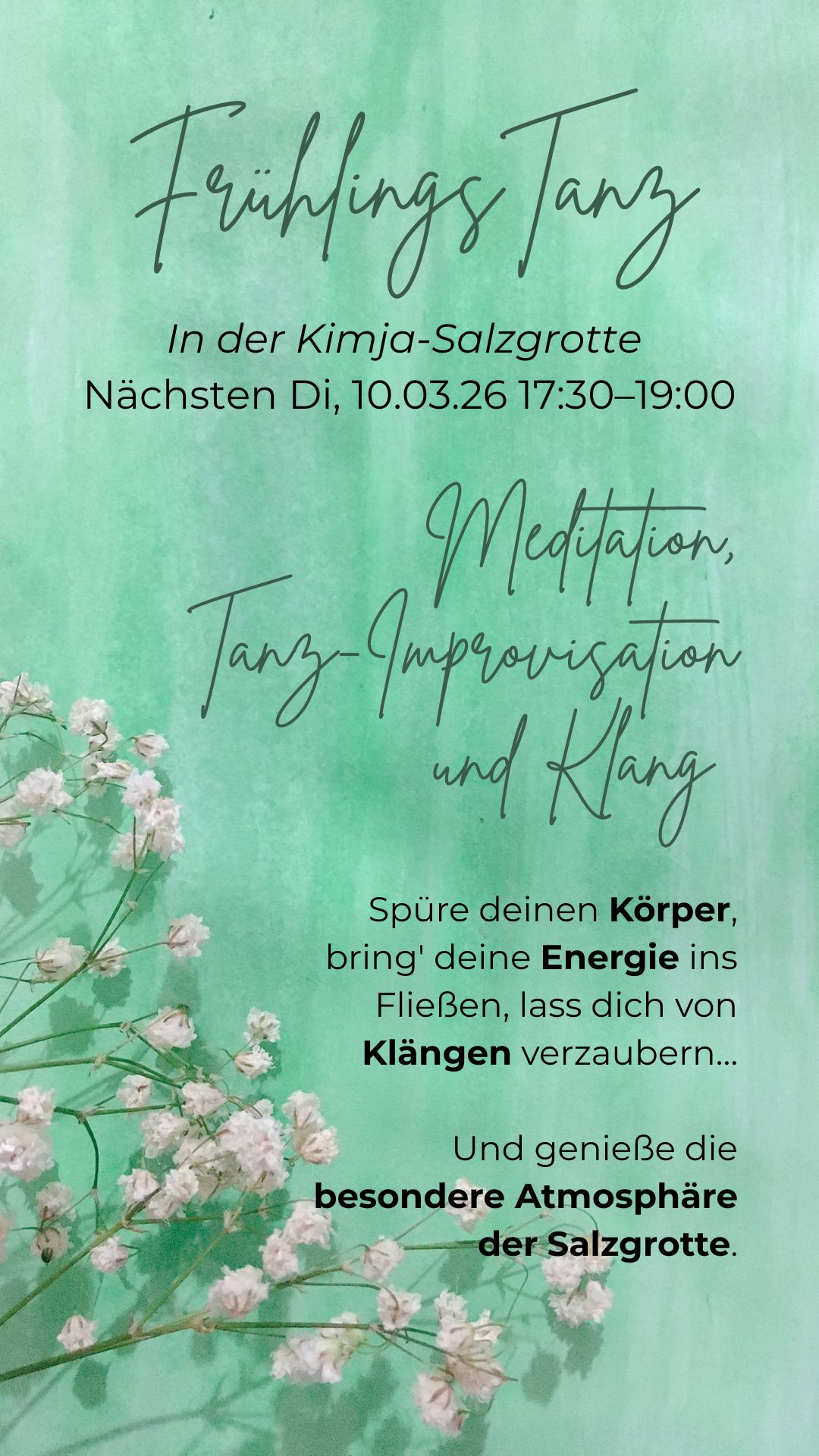 Eine feine Kombination aus Tanz-Improvisation, Klängen und Meditation, in der besonderen und Kraft spendenden Atmosphäre der Salzgrotte.