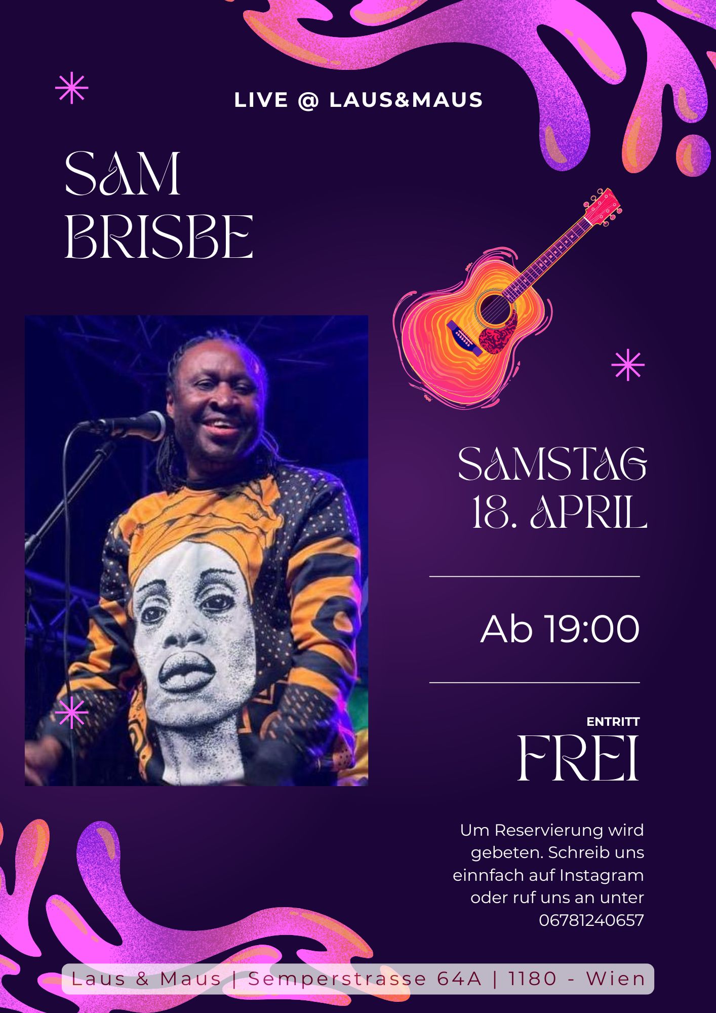 Wir freuen uns sehr Sam Brisbe am Samstag den 18.04.2026 bei uns im Laus&Maus begrüßen zu dürfen.