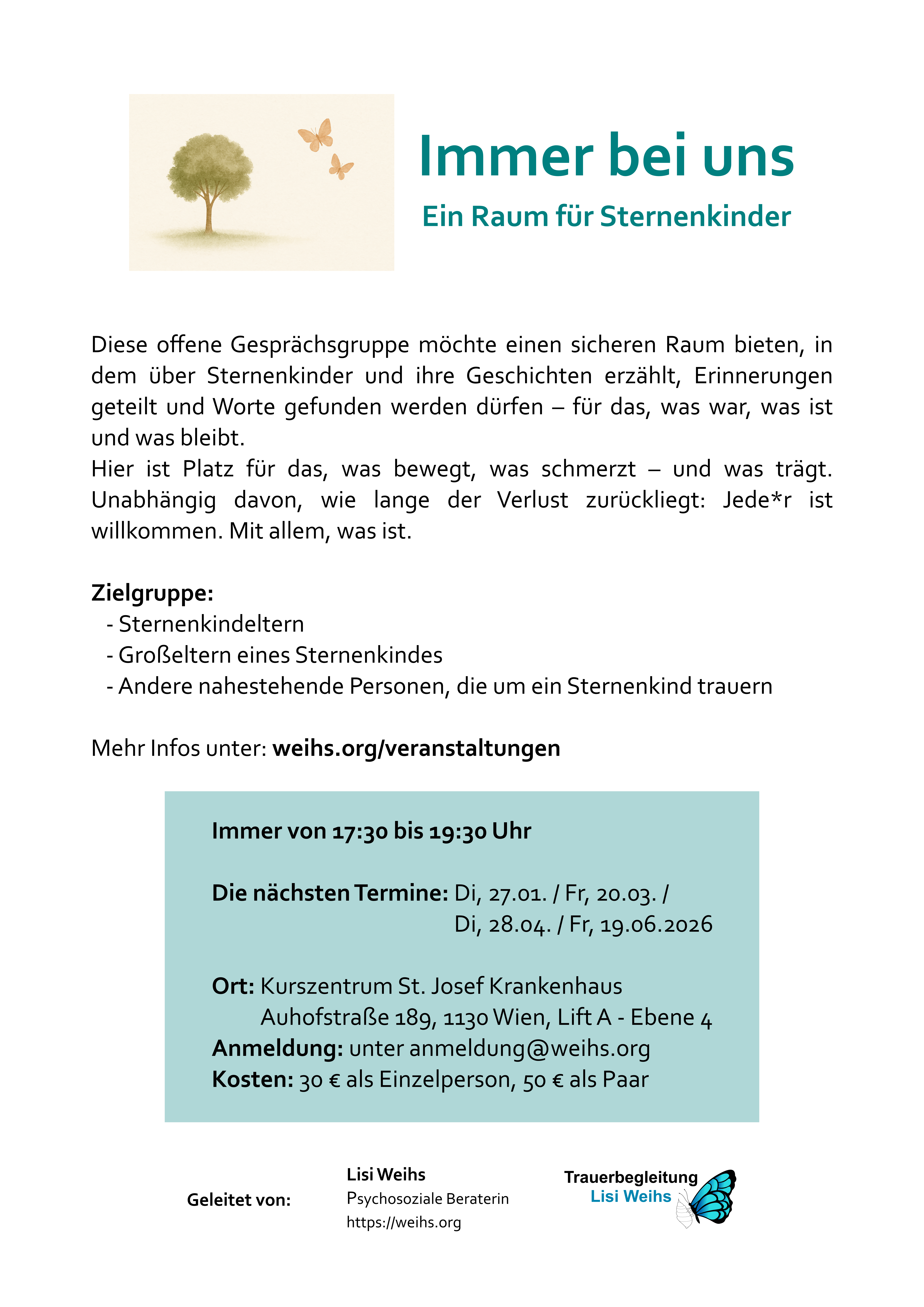 Diese offene Gesprächsgruppe möchte einen sicheren Raum bieten, in dem über Sternenkinder und ihre Geschichten erzählt, Erinnerungen geteilt und Worte gefunden werden dürfen – für das, was war, was ist und was bleibt. Hier ist Platz für das, was bewegt, was schmerzt – und was trägt. Unabhängig davon, wie lange der Verlust zurückliegt: Jede*r ist willkommen. Mit allem, was ist.