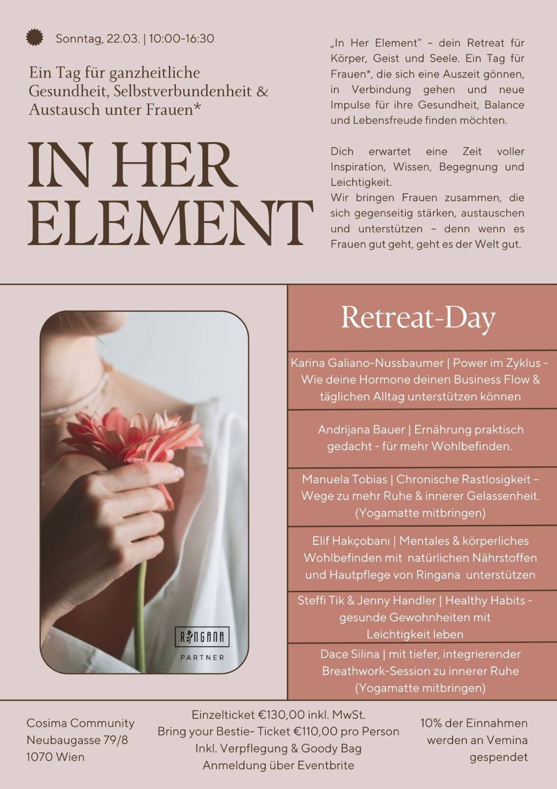 Ein Tag für ganzheitliche Gesundheit, Selbstverbundenheit & Austausch unter Frauen. "IN HER ELEMENT" ist ein Tag für Frauen, die sich eine Auszeit gönnen & neue Impulse für ihre Gesundheit, innere Balance & Lebensfreude finden möchten. Dich erwarten inspirierende Vorträge & Workshops unterschiedlicher Anbieterinnen aus dem Gesundheits-, Ernährungs- sowie Coaching- und Trainingsbereich. THEMEN: - Power im Zyklus – wie deine Hormone deinen Business Flow & täglichen Alltag unterstützen können (Karina Galiano-Nussbaumer) - Ernährung praktisch gedacht – für mehr Wohlbefinden (Andrijana Bauer) - Chronische Rastlosigkeit – Wege zu mehr innerer Ruhe & Gelassenheit (Manuela Tobias) - Mentales & körperliches Wohlbefinden mit natürlichen Nährstoffen und Hautpflege von Ringana unterstützen (Elif Hakçobani) - Healthy Habits – gesunde Gewohnheiten mit Leichtigkeit leben (Steffi Tik & Jenny Handler) - mit tiefer, integrierender Breathwork-Session zu innerer Ruhe (Dace Silina) KOSTEN: Einzelticket: 130 Euro inkl. MwSt. Bring your Besti-Ticket: 110 Euro p.P. ANMELDUNG: über Everbrite: https://www.eventbrite.at/e/in-her-element-tickets-1869522274449?aff=oddtdtcreator