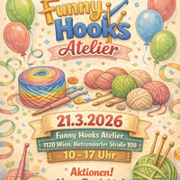 Am 17. März wird das Funny Hooks Atelier ein Jahr alt – und das möchte ich mit euch am 21.3.2026 feiern! 🧶💛