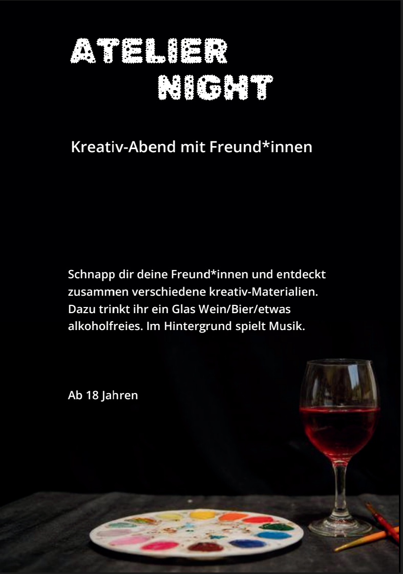 Schnapp dir deine Freund*innen und entdeckt zusammen verschiedene kreativ-Materialien. Dazu trinkt ihr ein Glas Wein/Bier/etwas alkoholfreies. Im Hintergrund läuft Musik.
