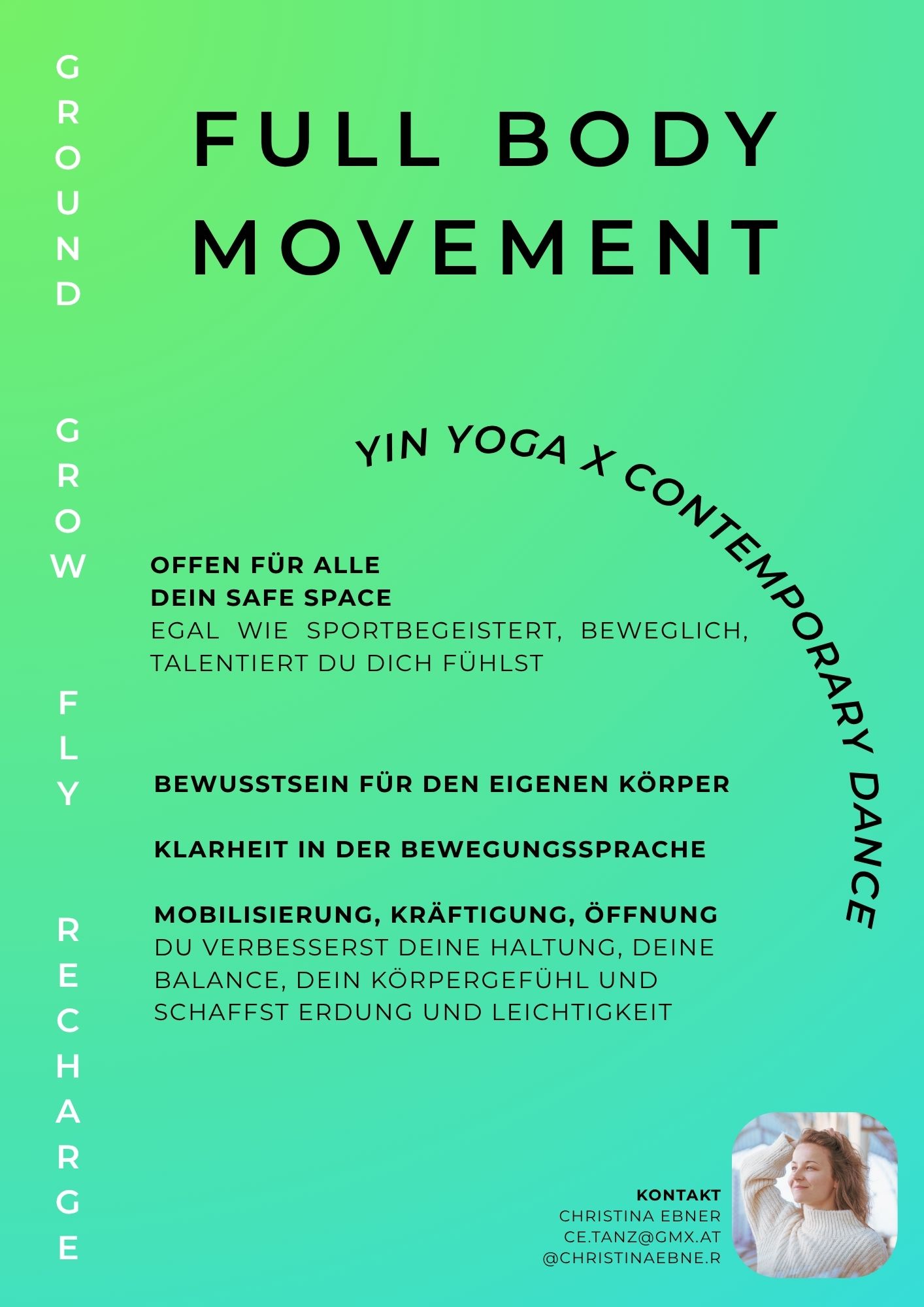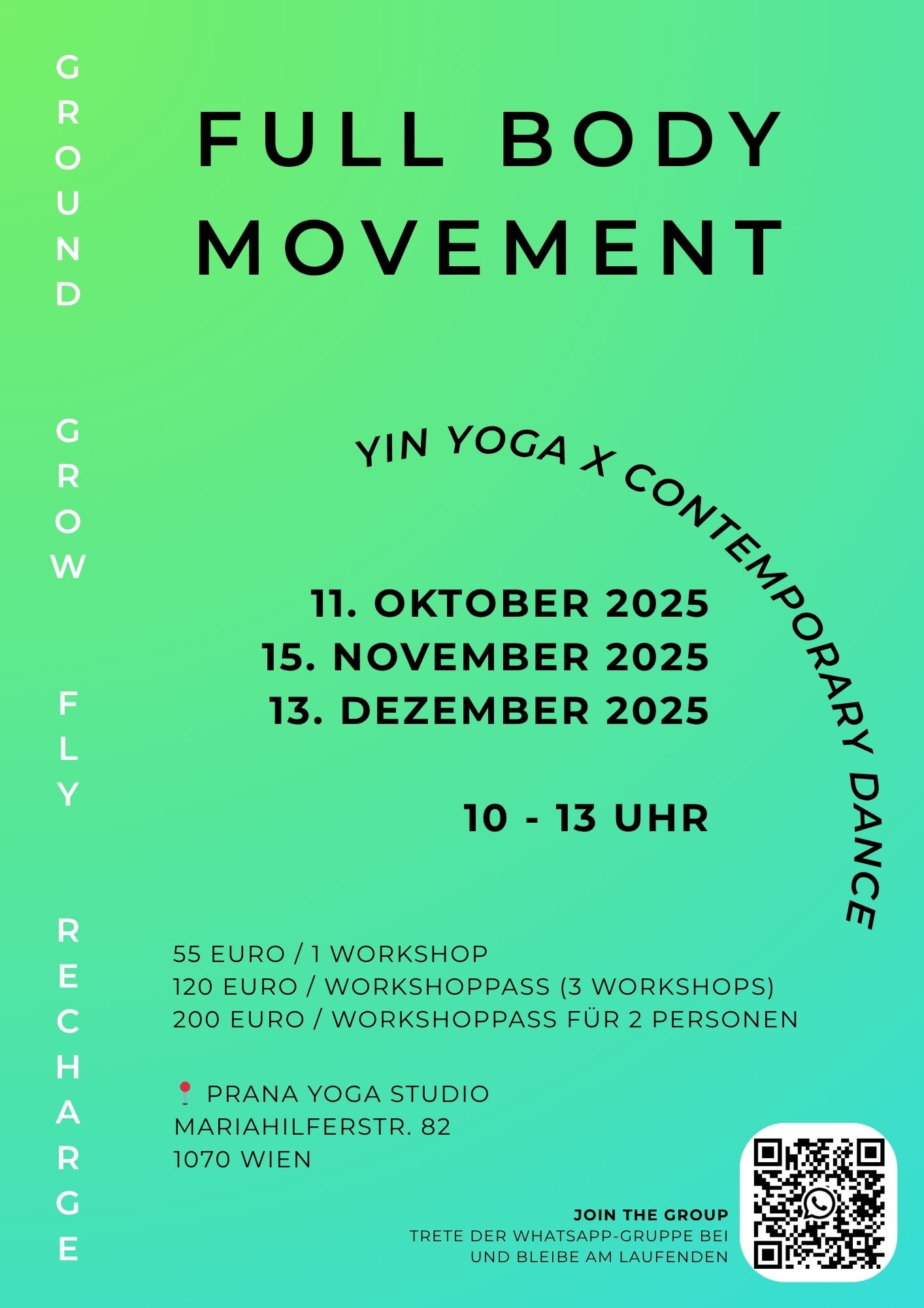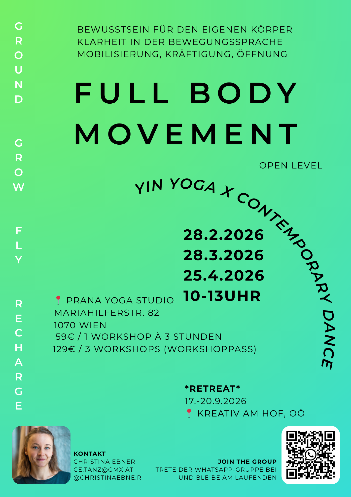 In meiner Arbeit verbinde ich Yin Yoga mit Zeitgenössischem Tanz. Einmal monatlich biete ich unter dem Titel "Full Body Movement" einen Workshop in Wien an, auch Einzeltrainings sind möglich. Unregelmäßig leite ich Workshops außerhalb von Wien und einmal jährlich findet ein Tanz & Yoga-Retreat statt. Mein Angebot richtig sich an alle Interessierten, unabhängig von Vorerfahrungen bzw. Vorkenntnissen.