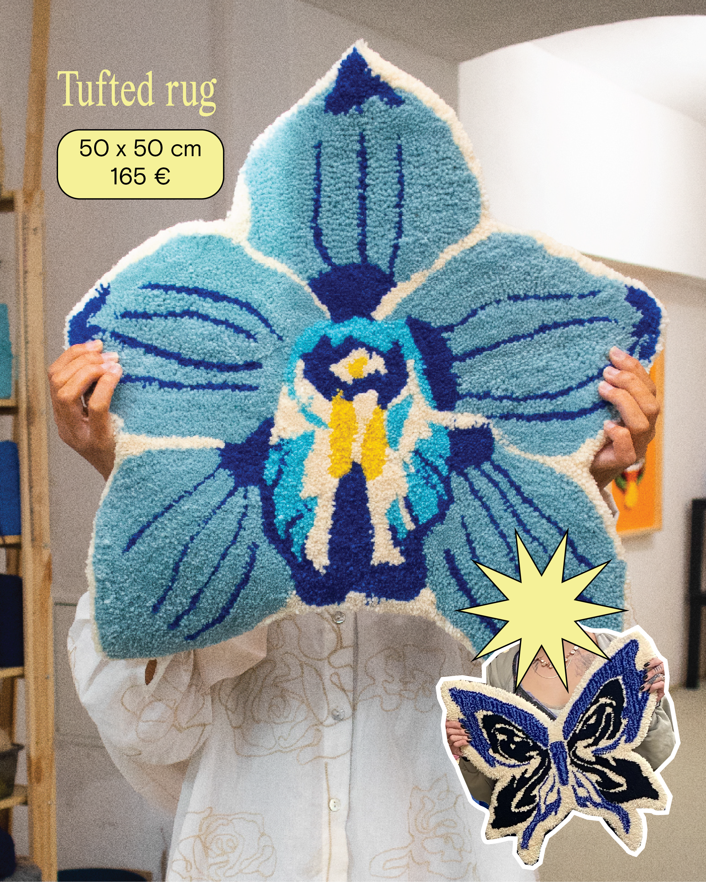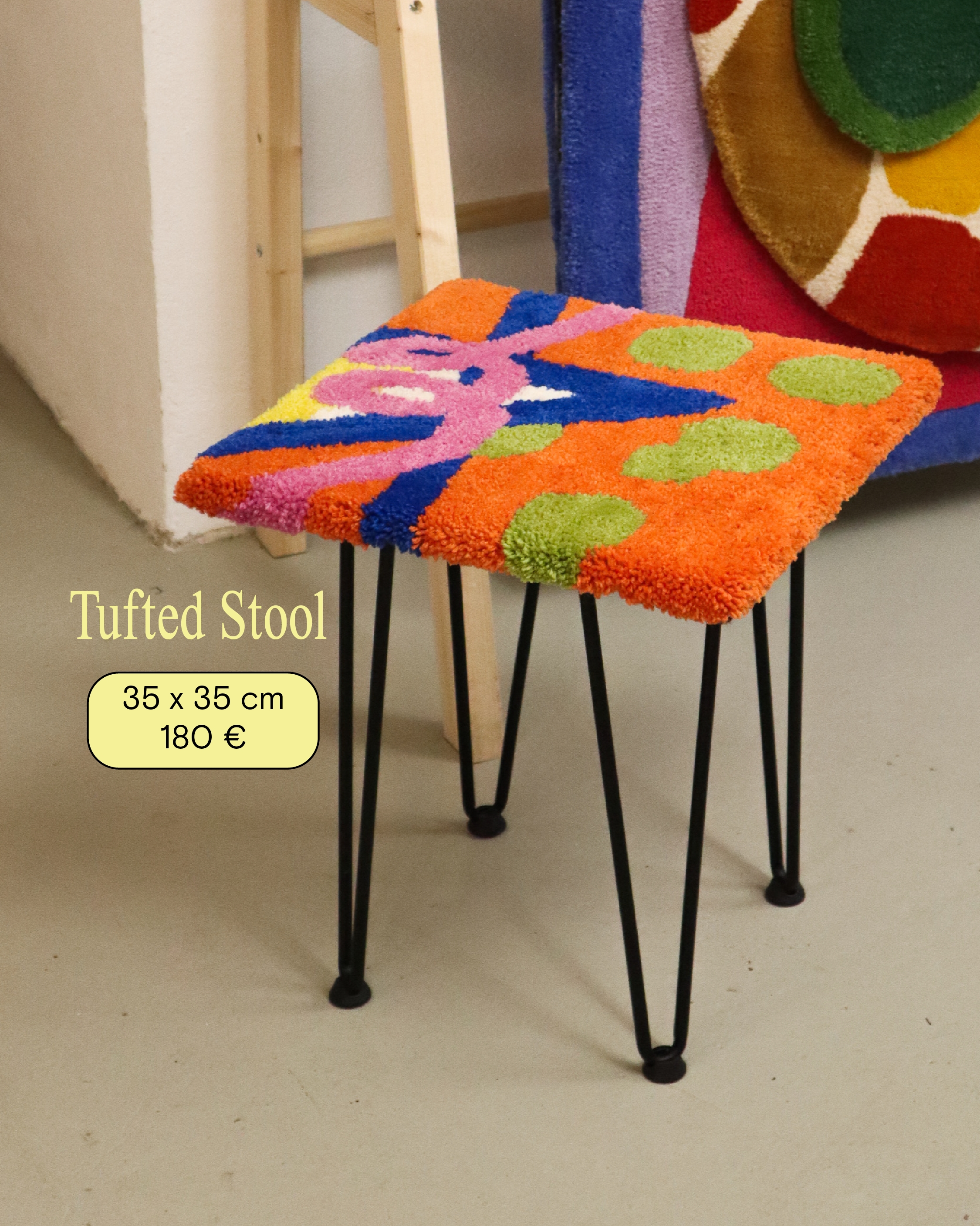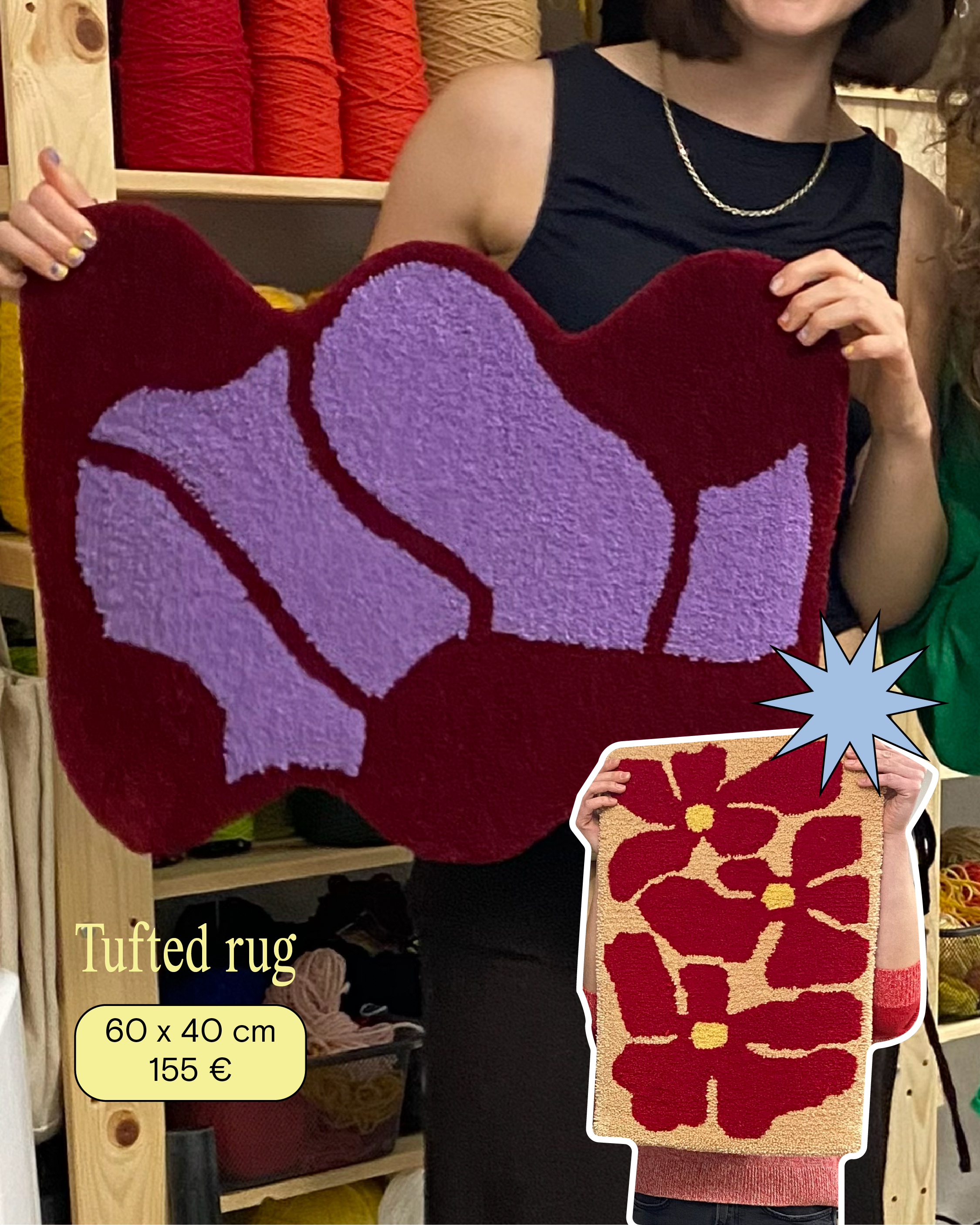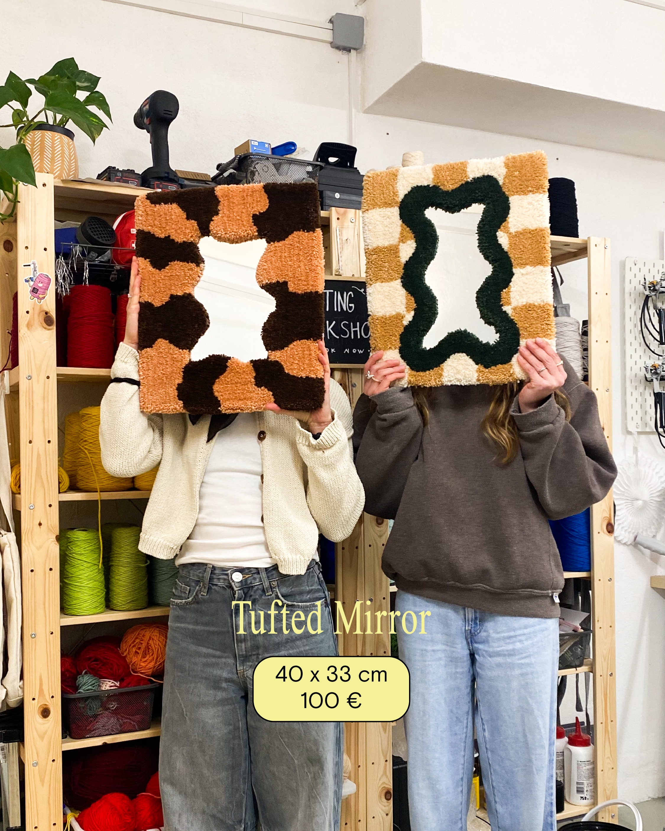 Tuft your own design! you can do either a Rug (40x60cm, 50x50cm, 70x70cm), a Stool (35x35cm), or a Mirror Frame (40x33cm, includes mirror).