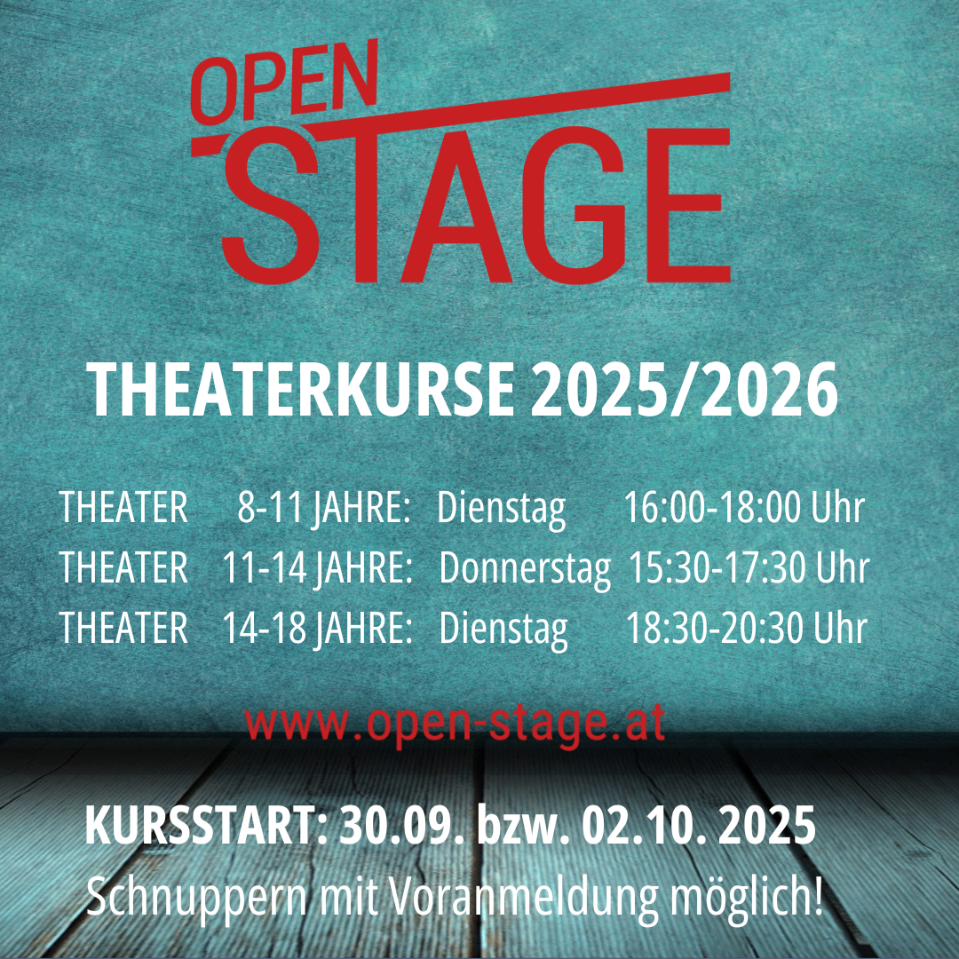 Mit Leichtigkeit, Spaß und Freude am Spielen, wollen wir deine Kreativität beflügeln, an einer für dich passenden Rolle arbeiten und letztendlich im Juni 2026 ein eigenes Theaterstück auf die Bühne bringen! Im Vordergrund unserer Kurse steht die Arbeit im Ensemble, die Freude am Spiel und am gemeinsamen Kreieren. Theater Spielen macht uns stark und mutig und bereitet großen Spaß! Vorhang auf – Bühne frei! Egal ob Rampensau oder Theateranfänger*in – Du bist herzlich willkommen! Das sind unsere OPEN STAGE THEATERKURSE 2025/2026 THEATER 8 -11 JAHRE: Dienstag 16:00 – 18:00 Uhr THEATER 11-14 JAHRE: Donnerstag 15:30 – 17:30 Uhr THEATER 14-18 JAHRE: Dienstag 18:30 – 20:30 Uhr