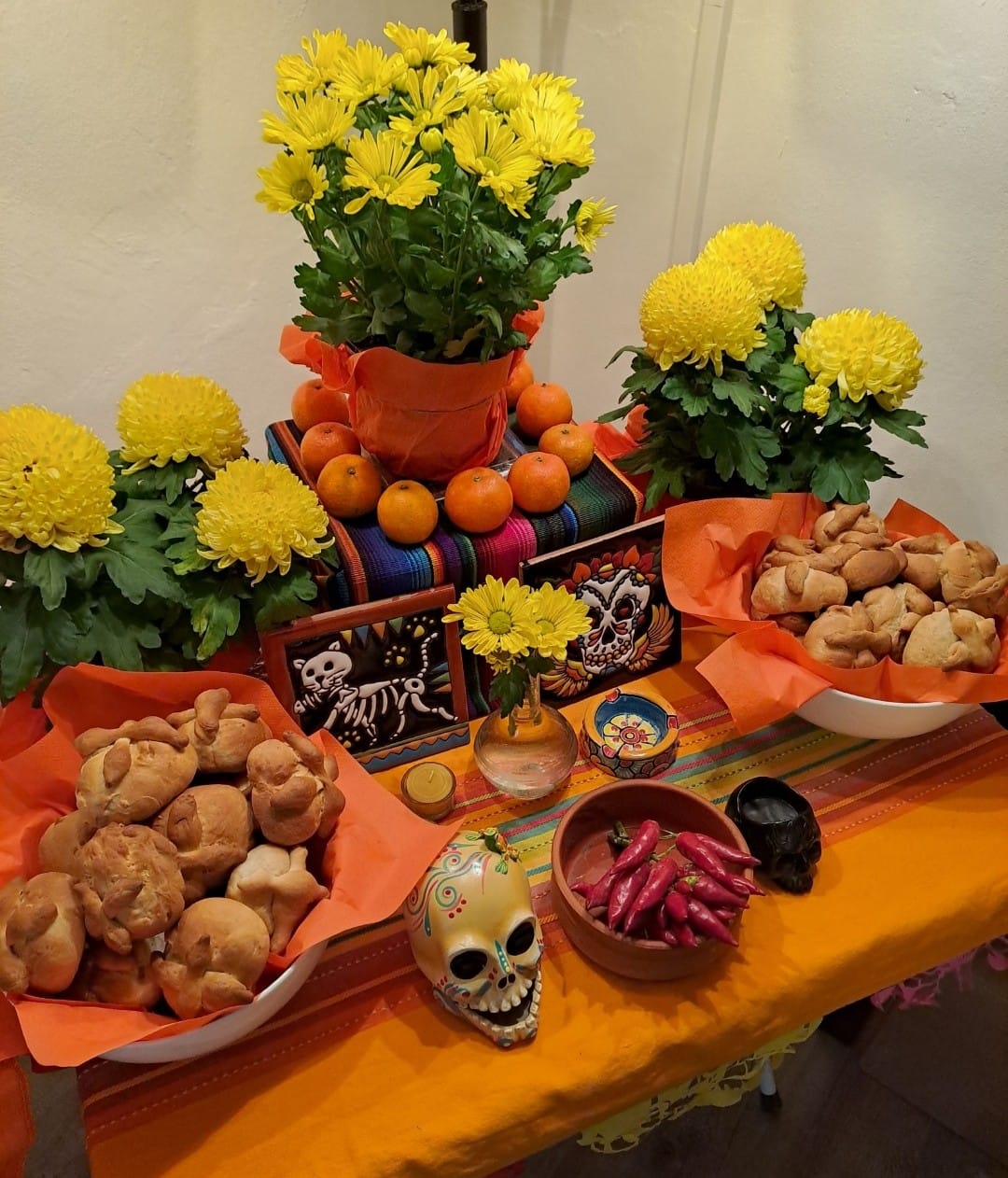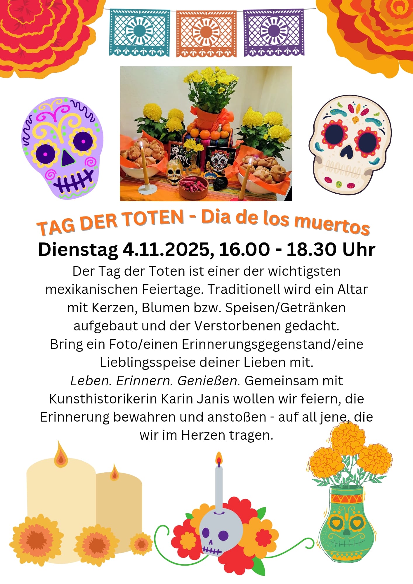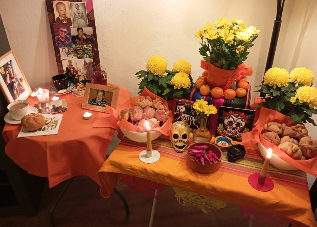 Der Tag der Toten ist einer der wichtigsten mexikanischen Feiertage. Traditionell wird ein Altar mit Kerzen, Blumen bzw. Speisen/Getränken aufgebaut und der Verstorbenen gedacht.