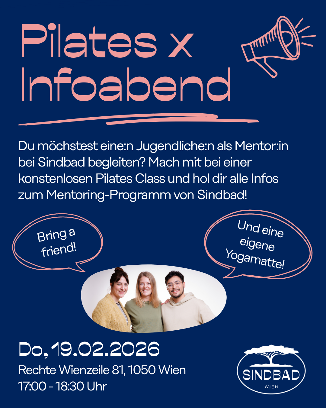 Neugierig? Schnapp dir eine:n Freund:in, pack deine Yogamatte ein, power dich mit uns beim Pilates aus und werde Sindbad-Mentor:in.