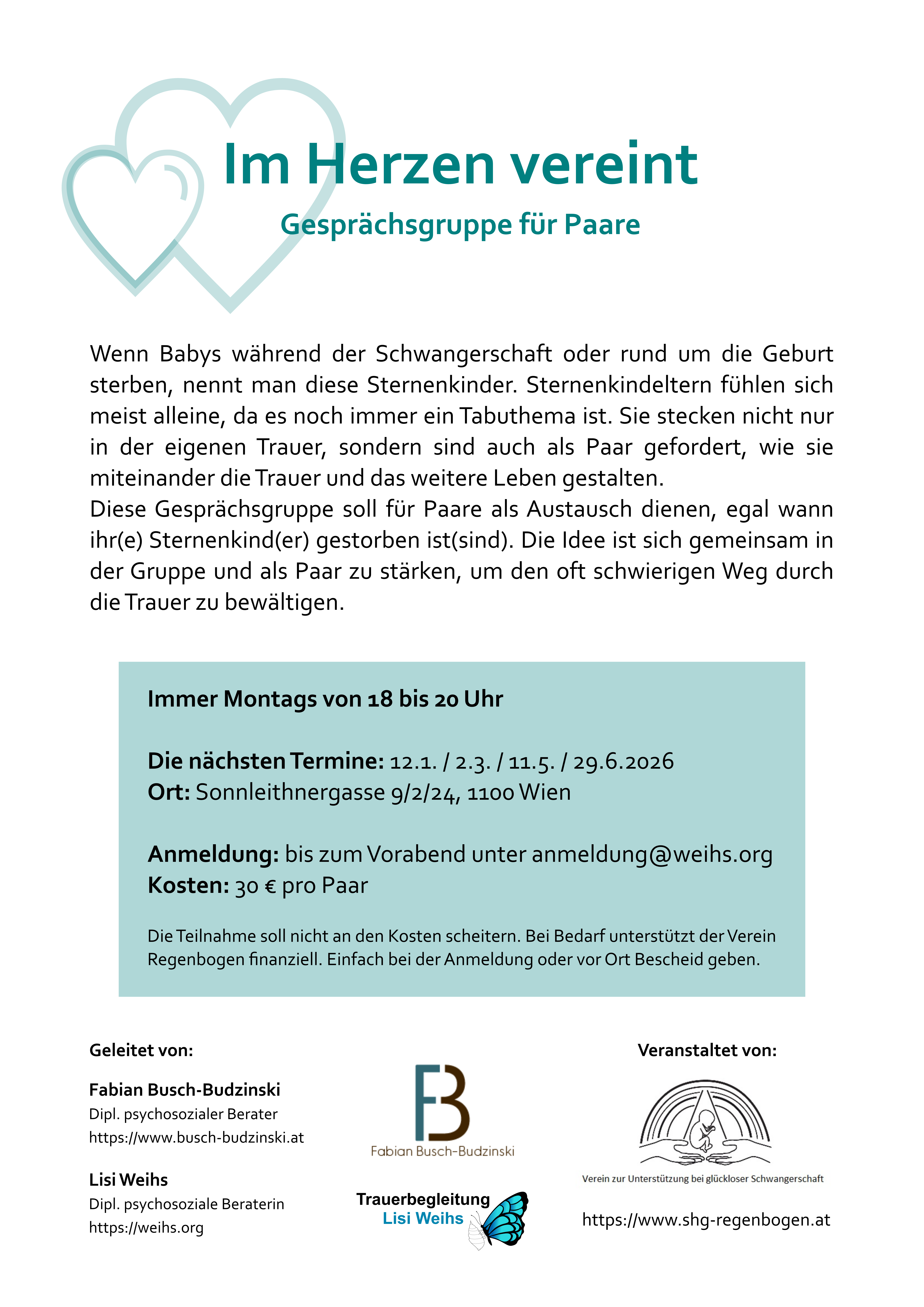 Wenn Babys während der Schwangerschaft oder rund um die Geburt sterben, nennt man diese Sternenkinder. Sternenkindeltern fühlen sich meist alleine, da es noch immer ein Tabuthema ist. Sie stecken nicht nur in der eigenen Trauer, sondern sind auch als Paar gefordert, wie sie miteinander die Trauer und das weitere Leben gestalten. Diese Gesprächsgruppe soll für Paare als Austausch dienen, egal wann ihr(e) Sternenkind(er) gestorben ist(sind). Die Idee ist sich gemeinsam in der Gruppe und als Paar zu stärken, um den oft schwierigen Weg durch die Trauer zu bewältigen. Die nächsten Termine: Mo, 12.1.2026 von 18:00 - 20:00 Mo, 2.3.2026 von 18:00 - 20:00 Mo, 11.5.2026 von 18:00 - 20:00 Mo, 29.6.2026 von 18:00 - 20:00 Ort: Sonnleithnergasse 9/2/24, 1100 Wien Anmeldung: bis zum Vorabend unter anmeldung@weihs.org Kosten: 30 € pro Paar (Die Teilnahme soll nicht an den Kosten scheitern. Bei Bedarf unterstützt der Verein Regenbogen finanziell. Einfach bei der Anmeldung oder vor Ort Bescheid geben.) Ich leite die Gesprächsgruppe gemeinsam mit meinem Kollegen Fabian Busch-Budzinski.
