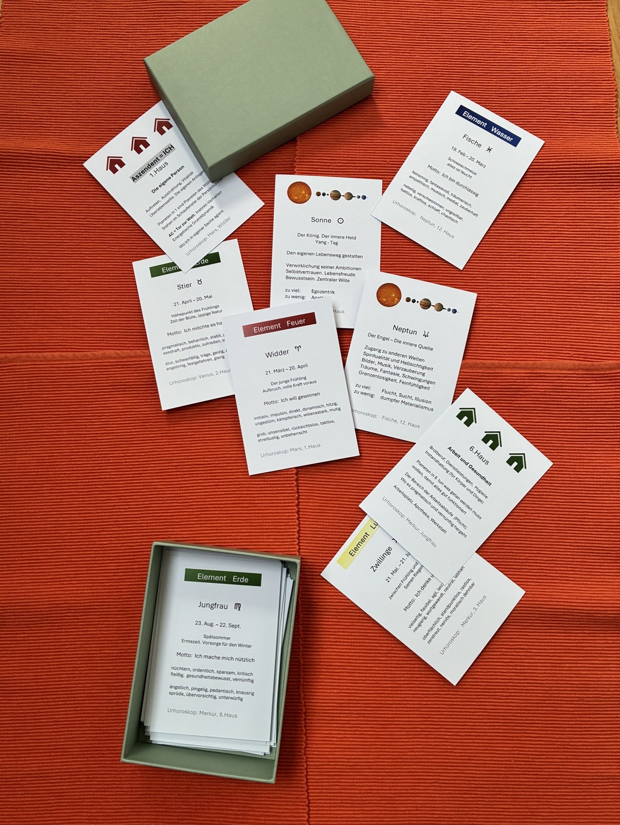 Jeder Teilnehmer bekommt von mir eine ausgedruckte Horoskopzeichnung und ein kleines Charakterprofil. Auf Wunsch auch gerne eine Übersetzungsliste für die astrologischen Symbole. Mit Hilfe von Lernkarten kann sich jeder selber am Kombinieren versuchen.