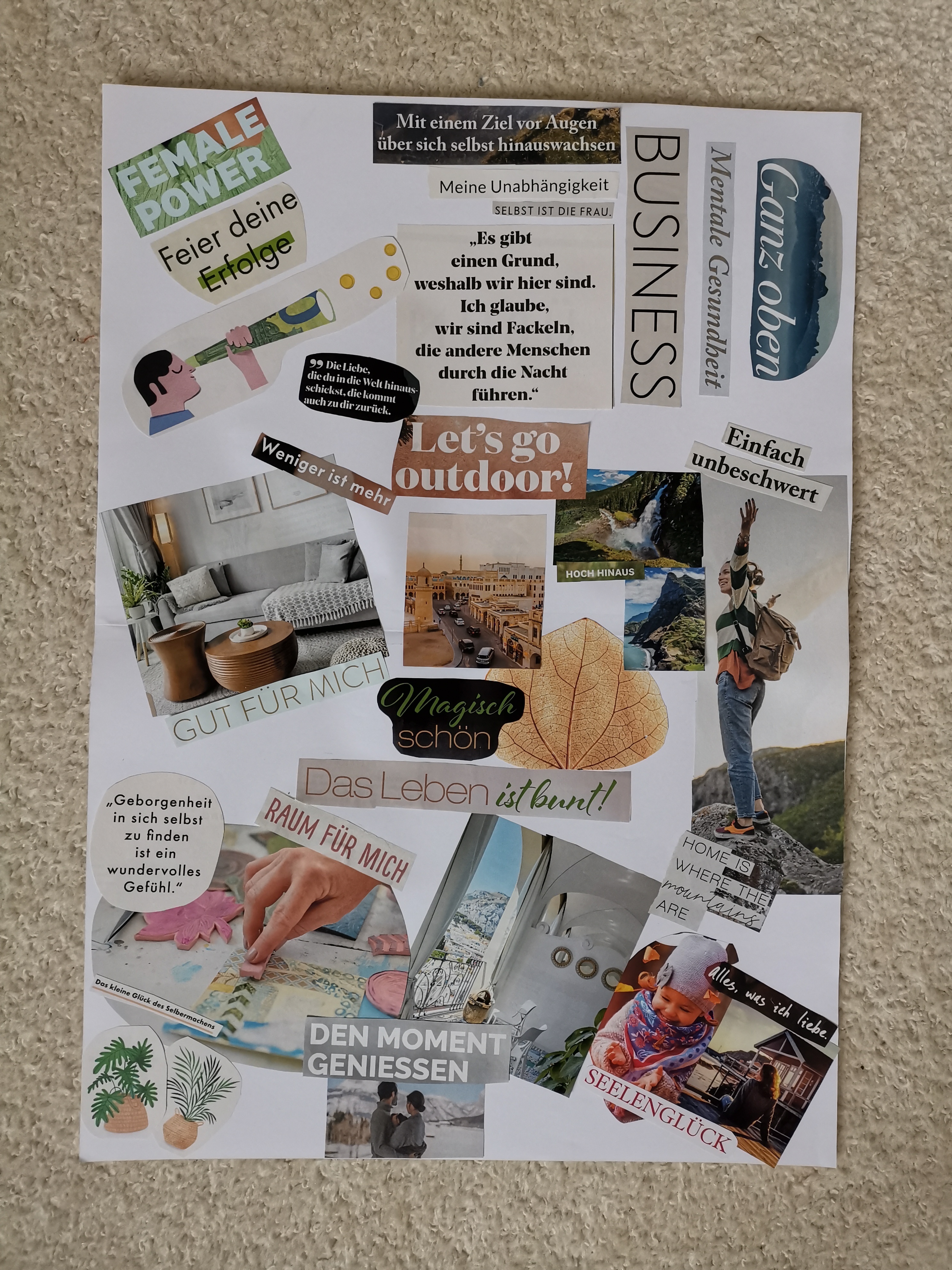 Ich begleite dich durch den Prozess und am Ende des Workshops hältst du dein ganz persönliches Visionboard in Händen.