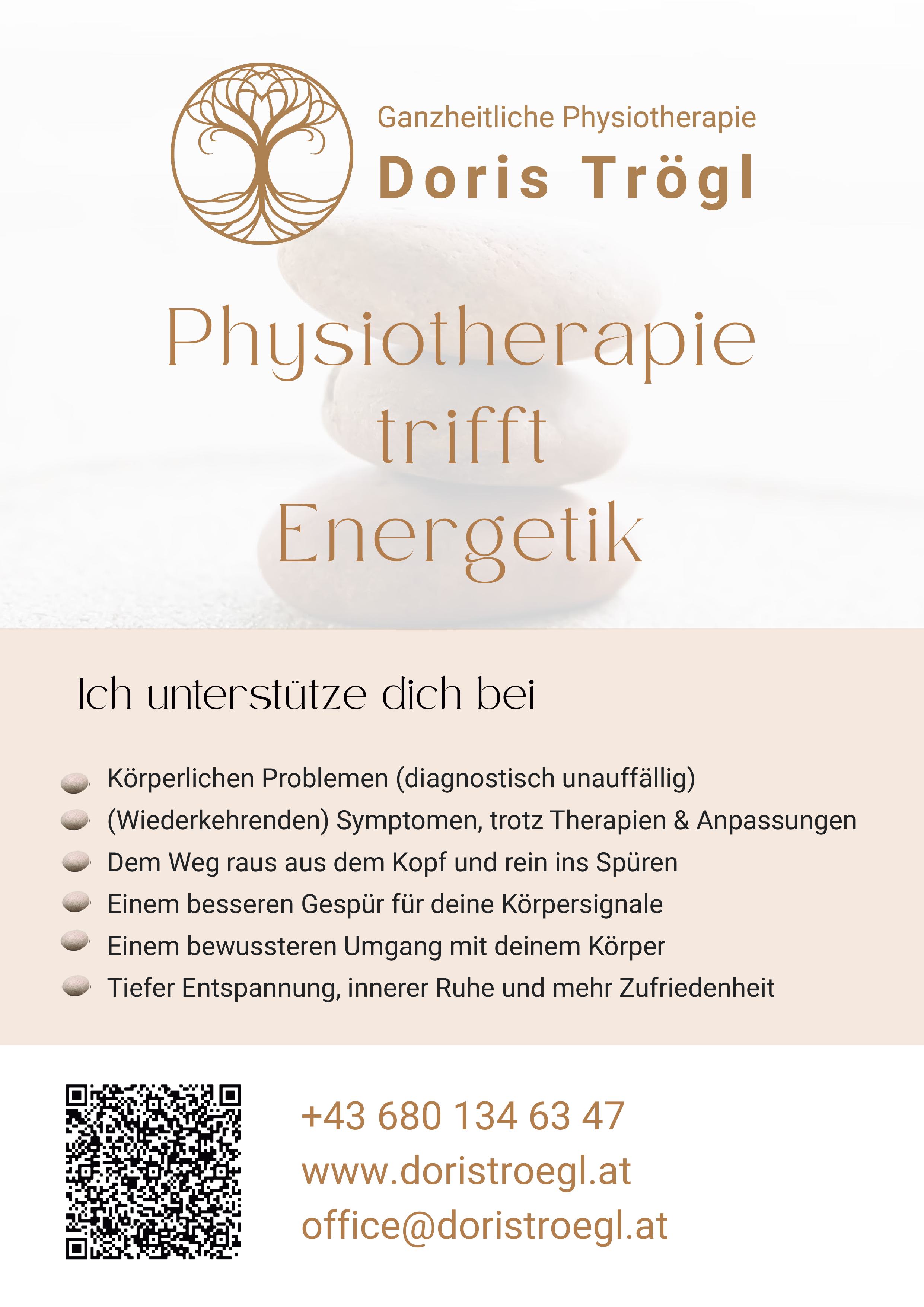 Ich biete dir auf Basis meiner physiotherapeutischen Kenntnisse und langjährigen Erfahrungen in der Physiotherapie und meinem Zugang zu Hellsinnen (hellhören, hellsehen, hellfühlen, hellwissen, Intuition) eine Reise zu deinem Unterbewusstsein. Ich verfolge einen möglichst ganzheitlichen Ansatz. Dazu nehme ich mir Zeit für ein ausführliches Erstgespräch und einer körperlichen Befundung, um dann auch gemeinsame Therapieziele festzulegen.