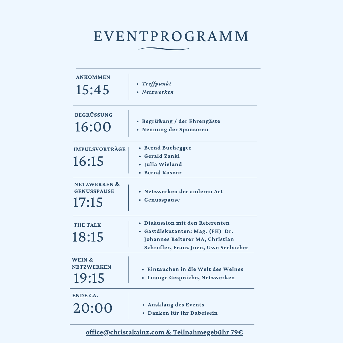 Wir bieten 4 hervorragende Impulsvorträge von Experten, eine spannende THE TALK Runde mit weiteren interessanten Experten:innen, Lounge Gespräche für den Austausch - Q&A- sowie einen kulinarischen Rahmen - Kaffee & Süßes, Wein & Snacks.