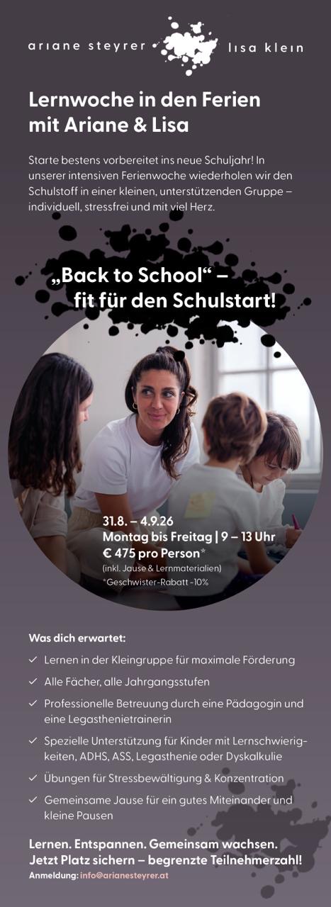 Starte bestens vorbereitet ins neue Schuljahr! In unserer intensiven Ferienwoche wiederholen wir den Schulstoff in einer kleinen, unterstützenden Gruppe - individuell, stressfrei und mit viel Herz.