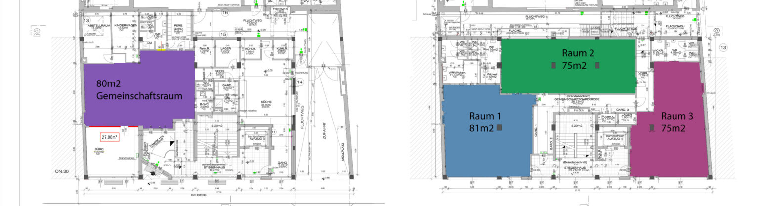 Eine Fläche von 540 m² auf zwei Ebenen: Gemeinschaftsraum, Gemeinschaftsbüro, Küche und drei Mehrzweckräume.