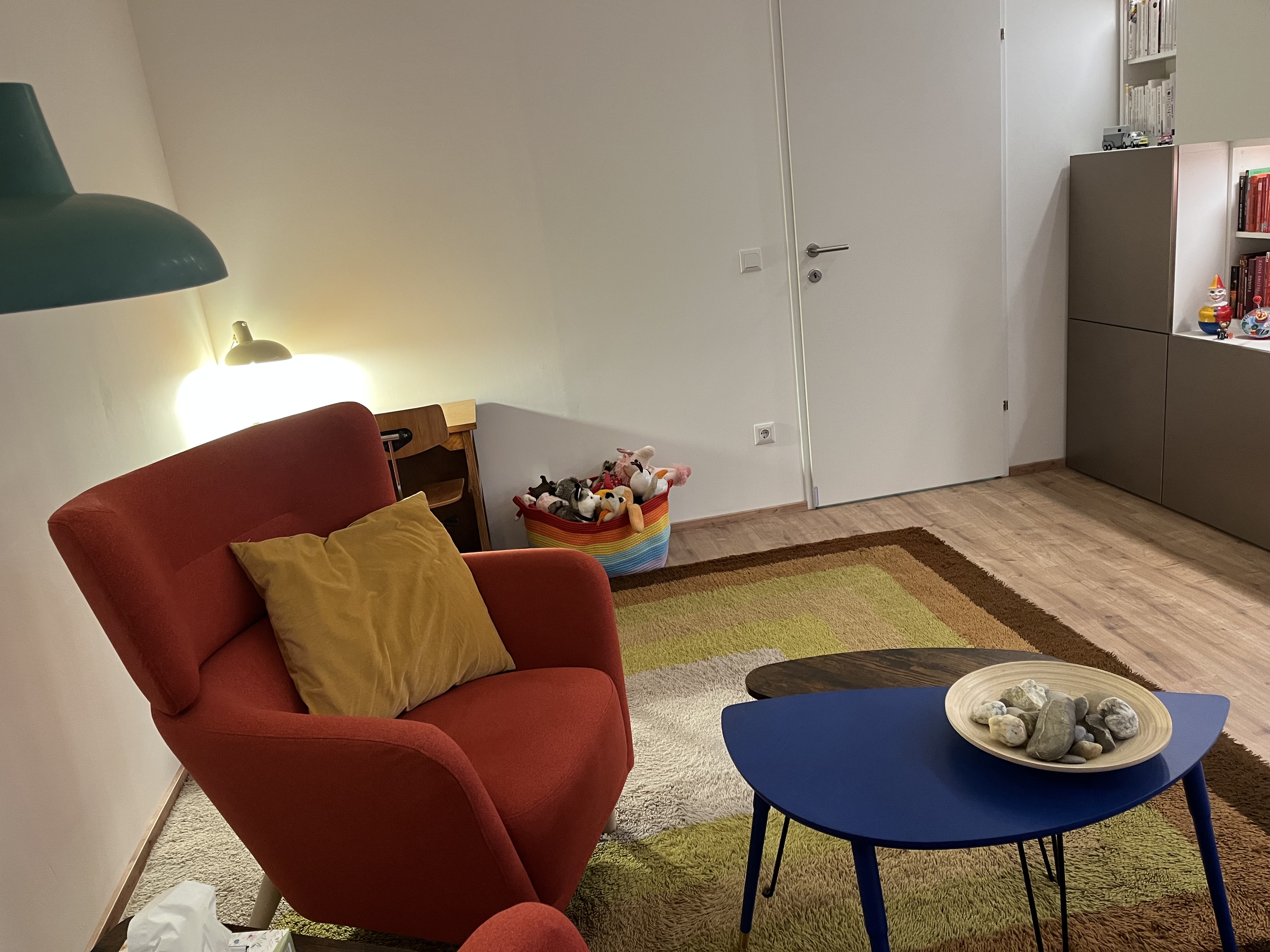 Der Raum ist hell und bietet ausreichend Platz für Einzelsetting, wie auch Paarsitzungen. Der Raum ist für Therapie, Diagnostik, Beratung, sowie Coaching ausgestattet.