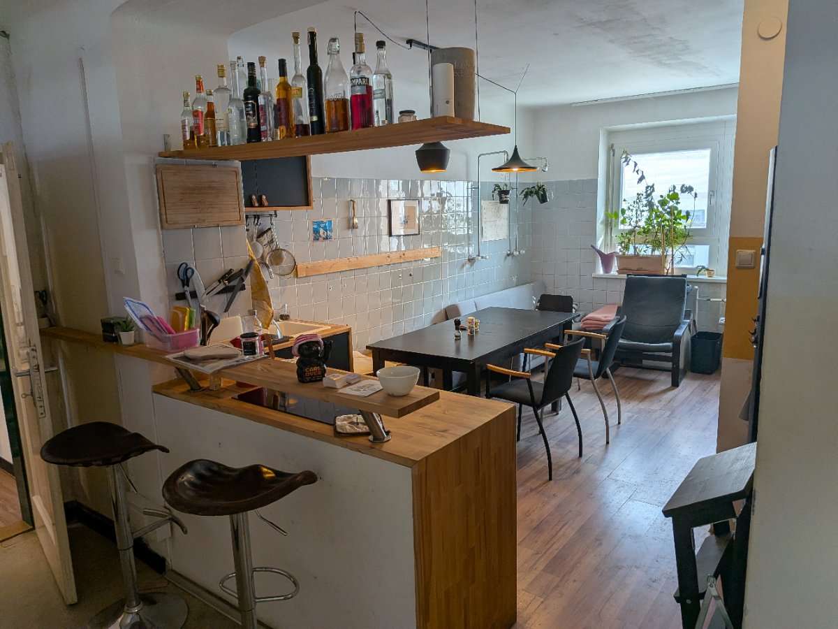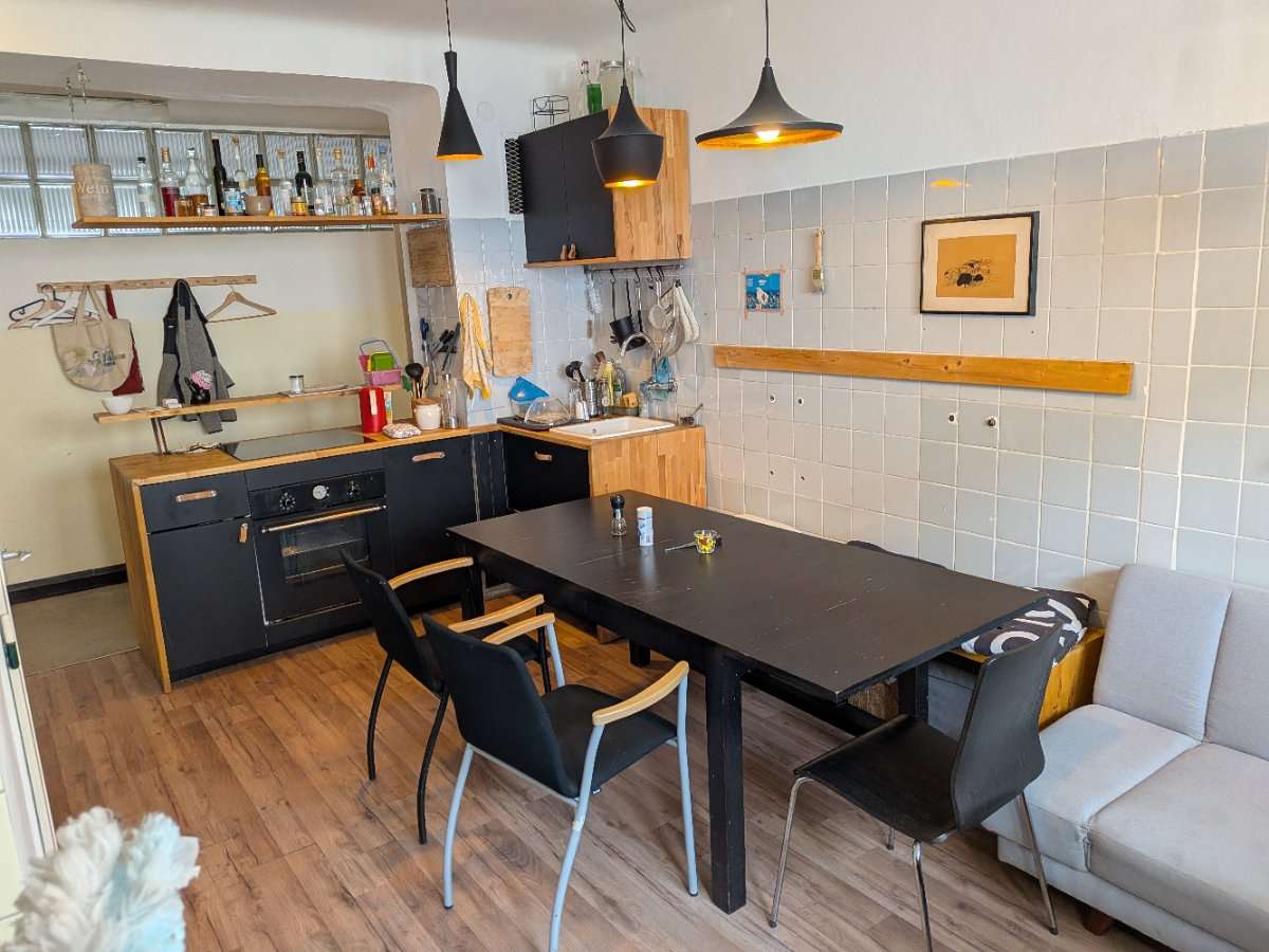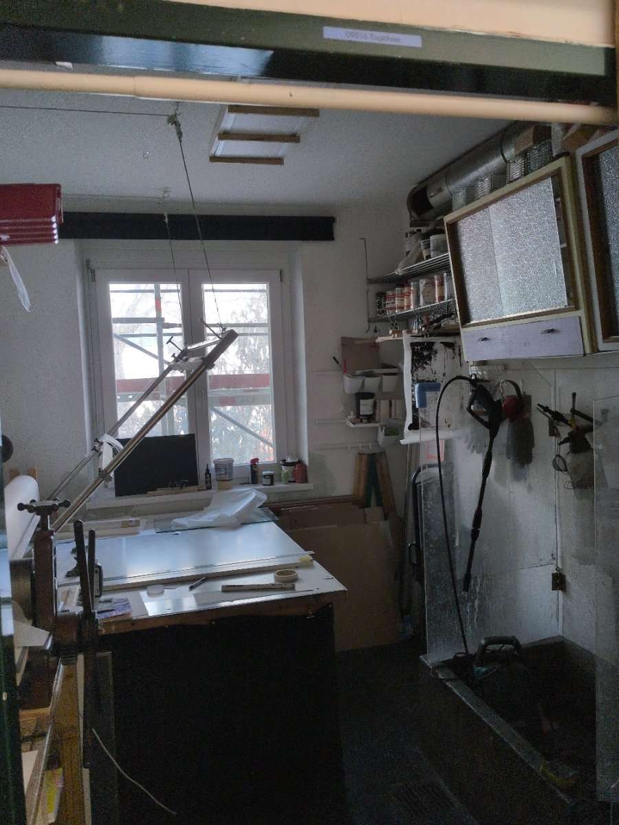 - im ersten Stock haben wir einen Siebdruckraum, eine große Wohnküche mit Esstisch und einer Couchecke.