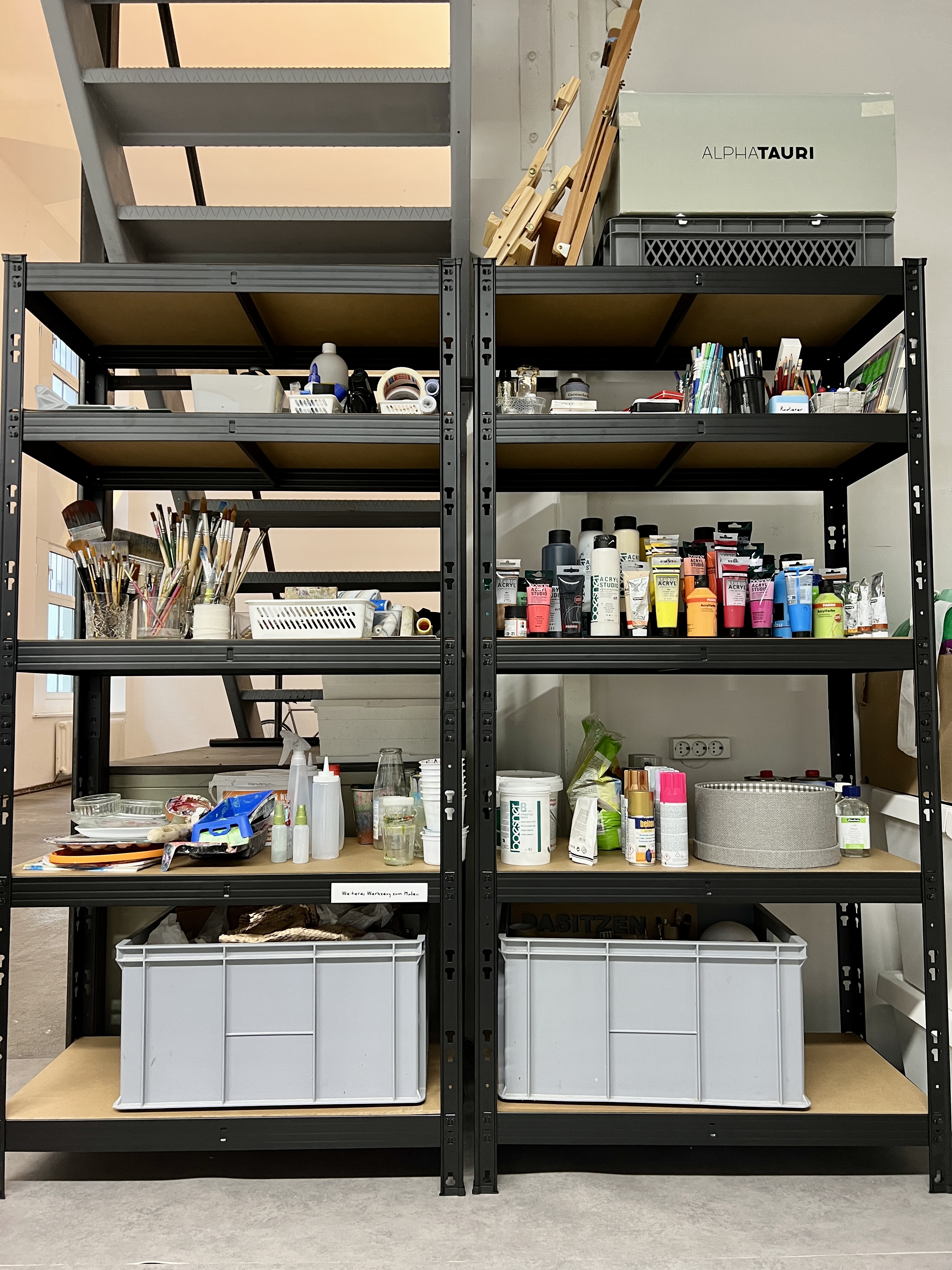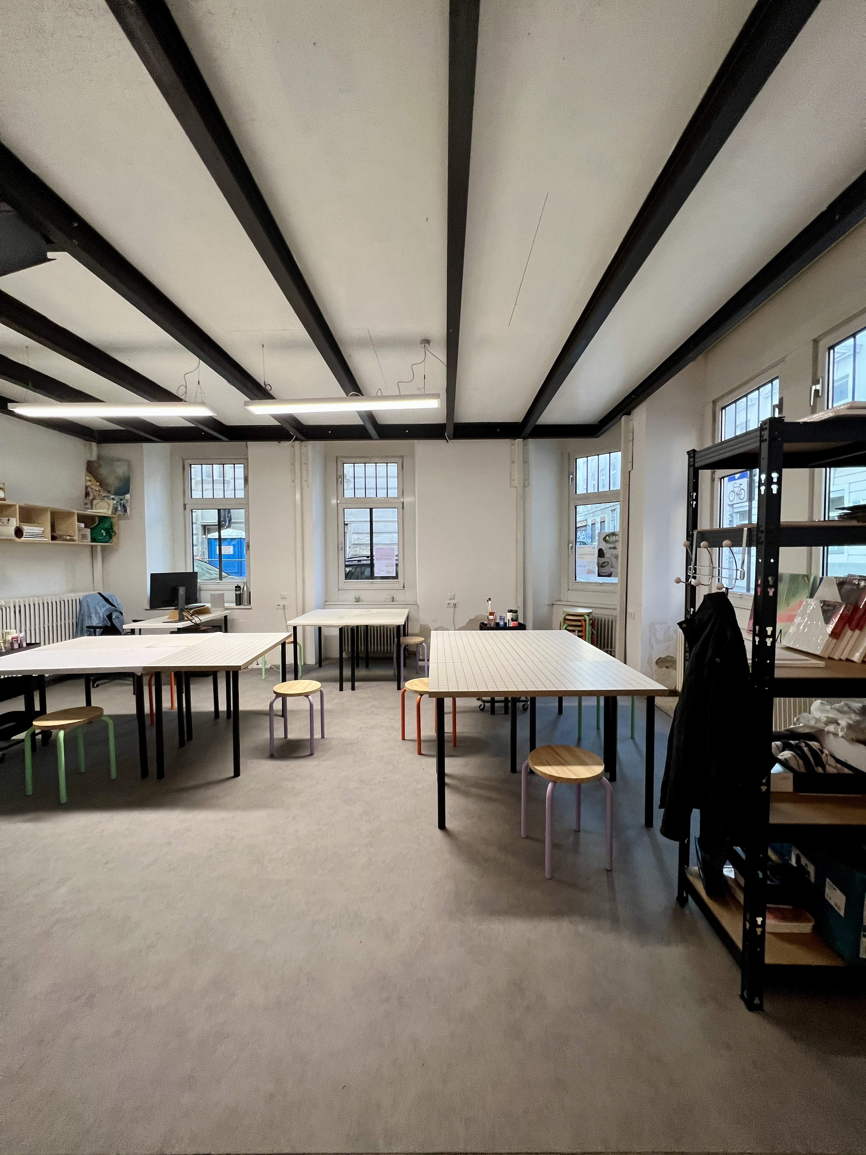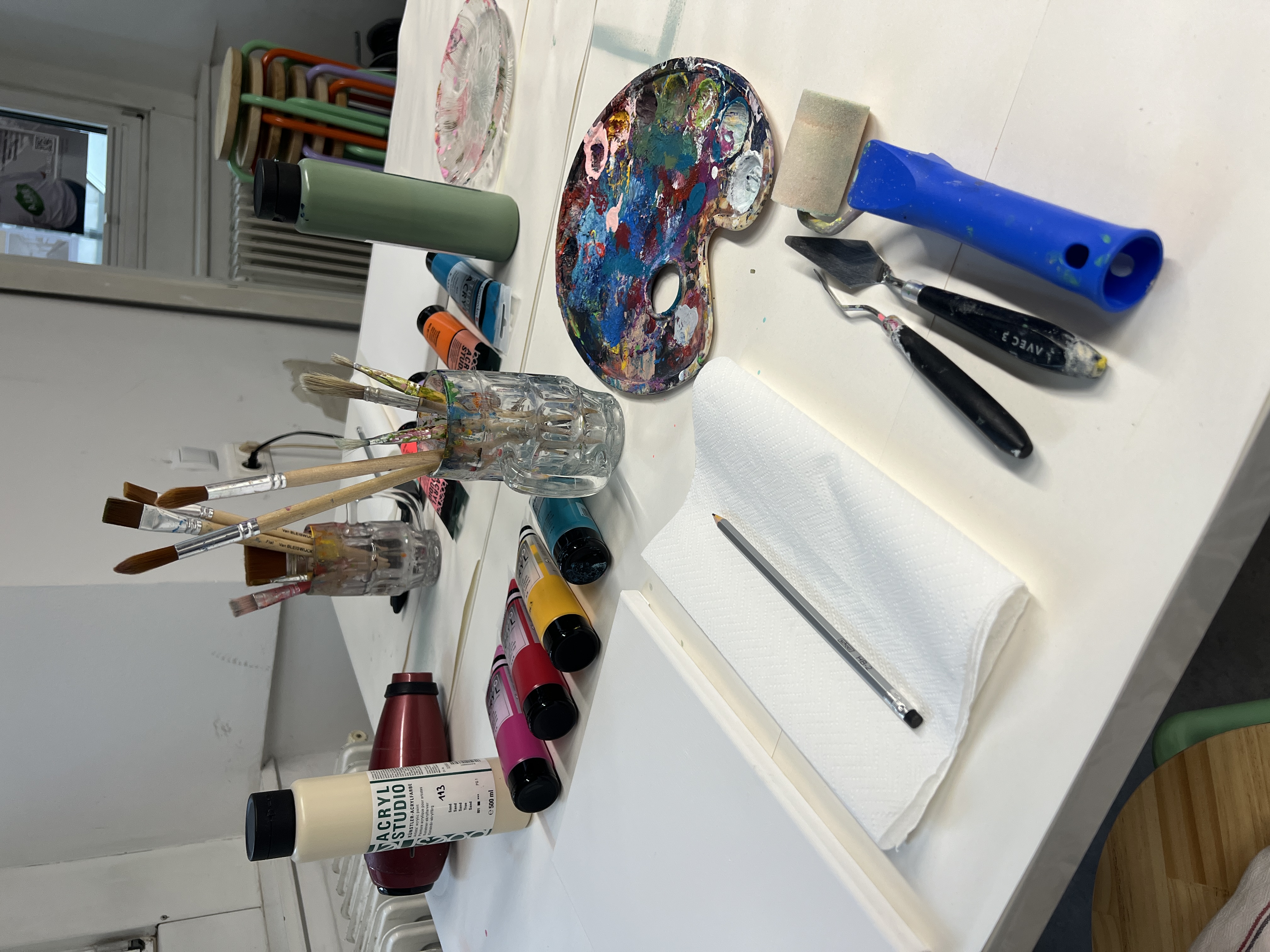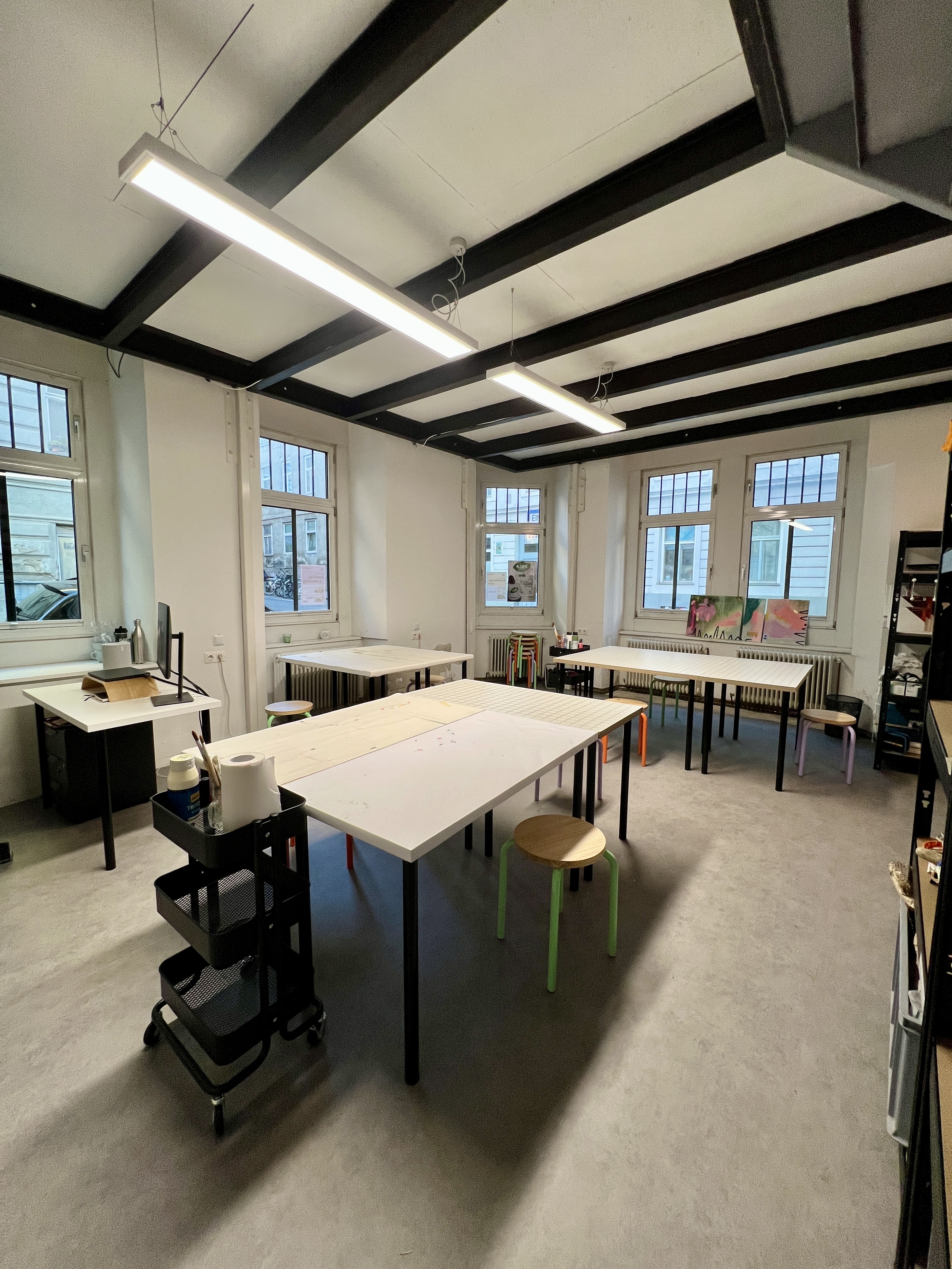 Wenn du einen Platz im A.Lab buchst, dann hast du deinen eigenen Arbeitsplatz für dich in einem voll ausgestatteten Kunstatelier inklusive Material je nach Buchungsart.