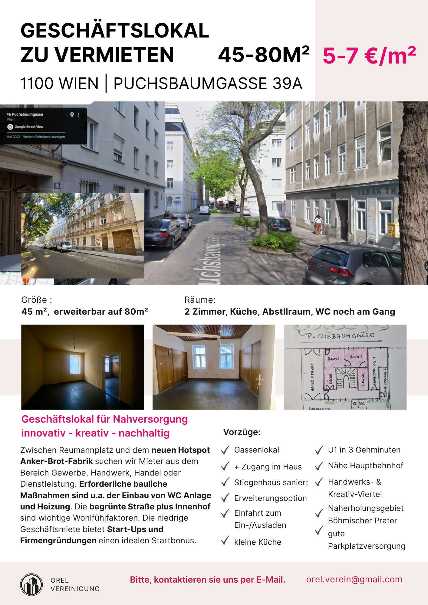 Zwischen Reumannplatz und dem neuen Hotspot Anker-Brot-Fabrik suchen wir Mieter aus dem Bereich Gewerbe, Handwerk, Handel oder Dienstleistung. Erforderliche bauliche Maßnahmen sind u.a. der Einbau von WC Anlage und Heizung. Die begrünte Straße plus Innenhof sind wichtige Wohlfühlfaktoren. Die niedrige Geschäftsmiete bietet Start-Ups und Firmengründungen einen idealen Startbonus.