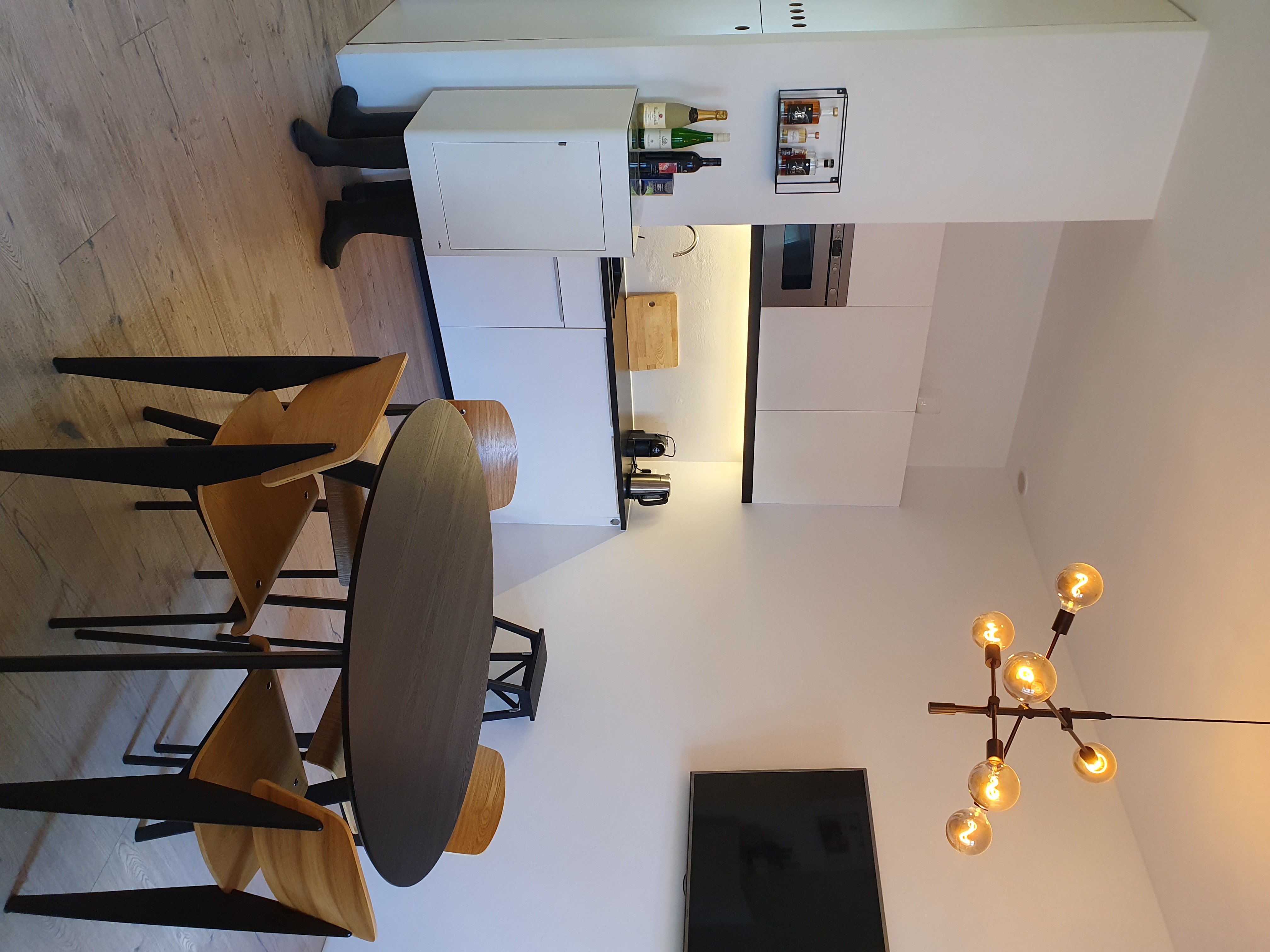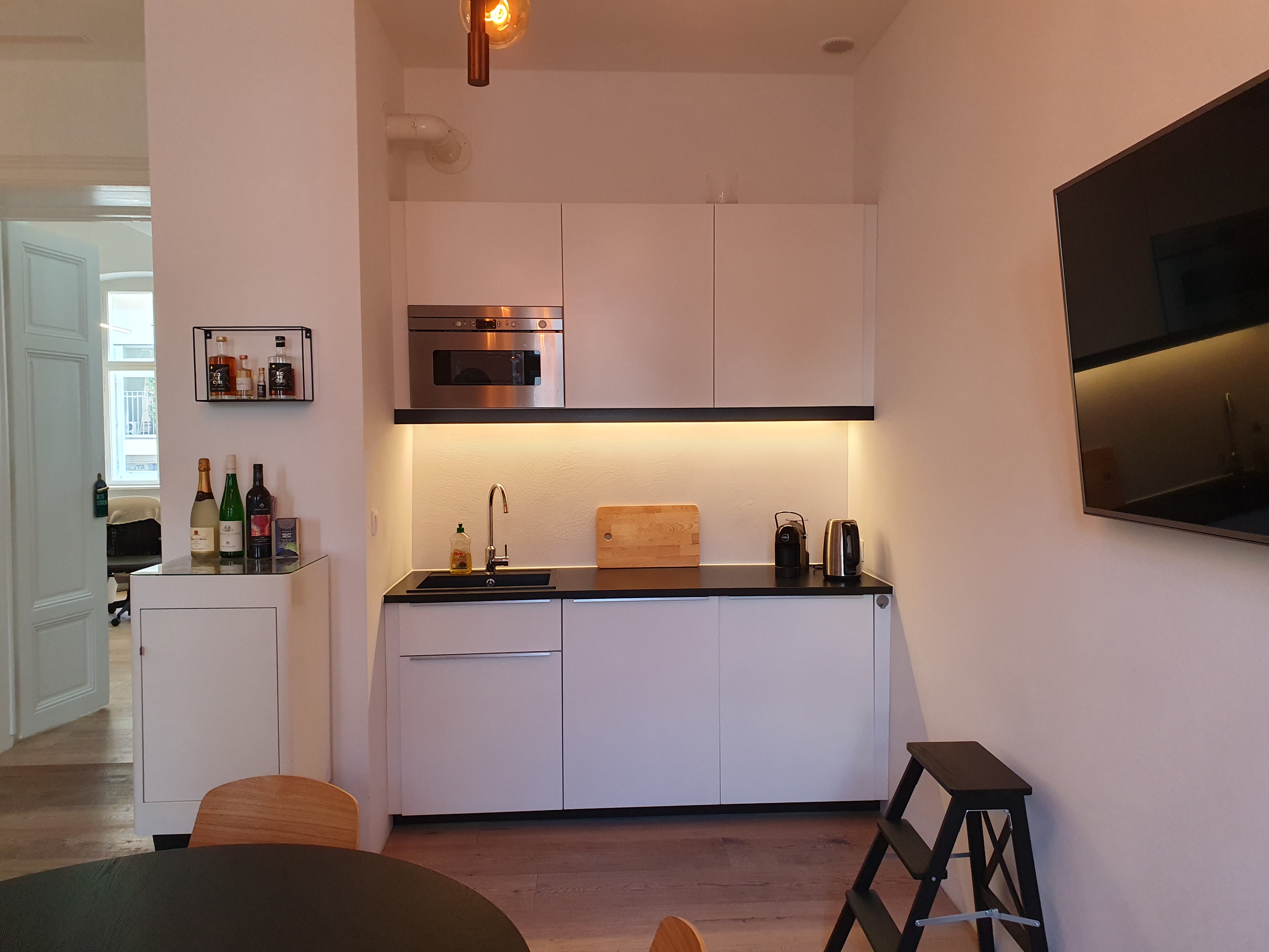 • Ein Gemeinschaftsbereich mit Küche, Esstisch, großem Bildschirm – ideal für Besprechungen oder Präsentationen