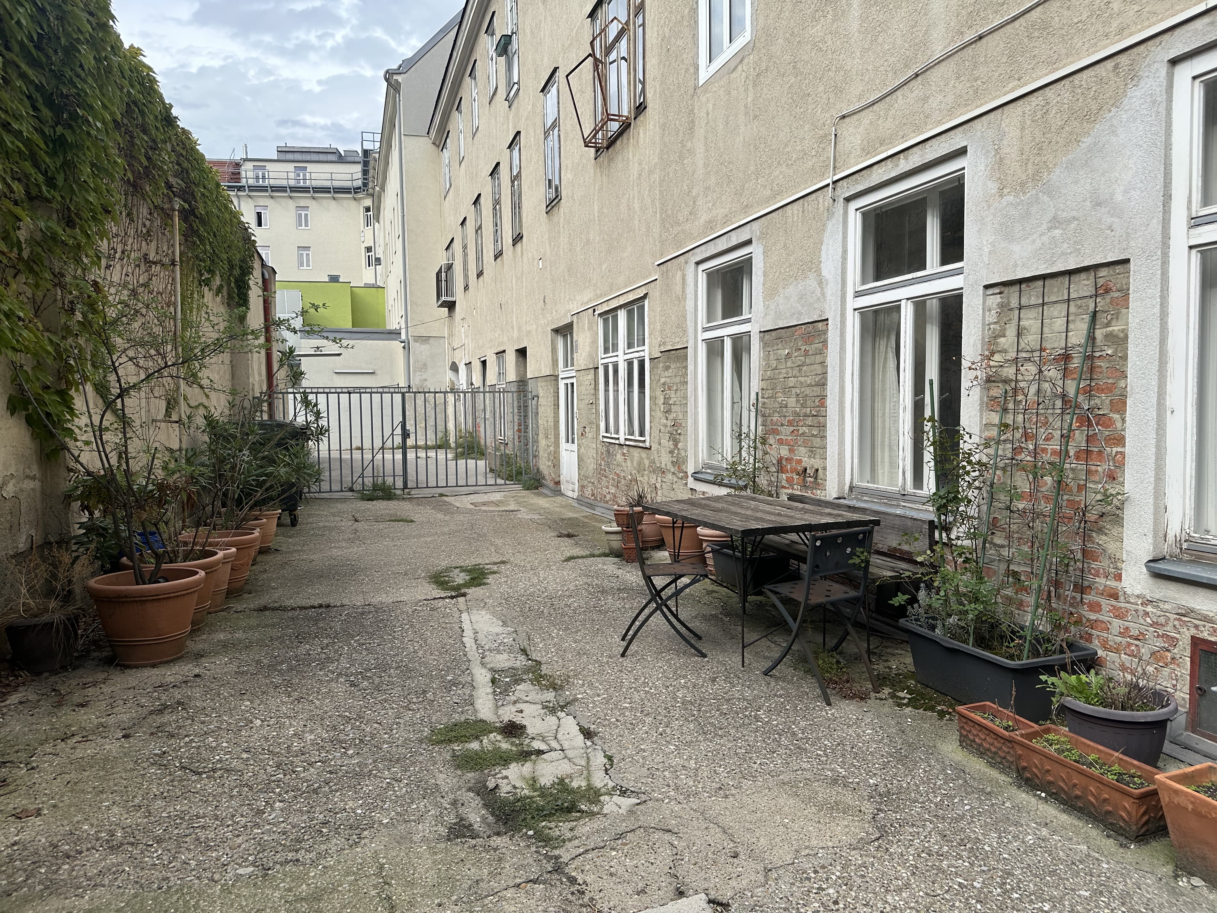 Ruhiger Innenhof mit Tisch und Bankerl für deine Pause