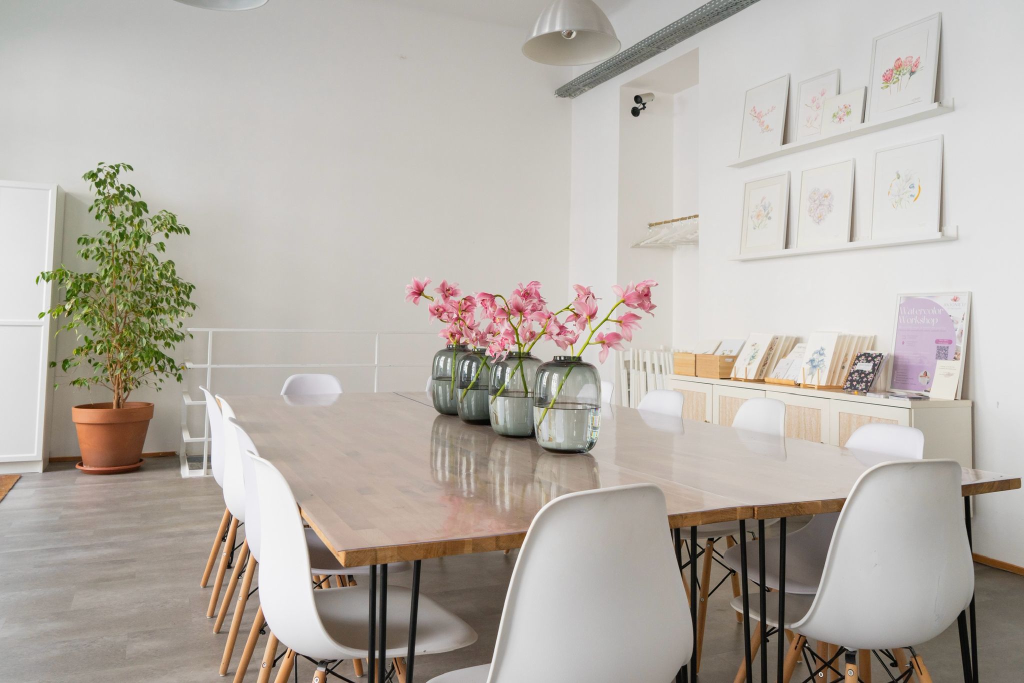 Großer Tisch (12–20 Personen), voll ausgestattete Küche, Relax-Bereich mit Sofa sowie ein elegantes, künstlerisches Ambiente, das Konzentration, Kreativität und Verbindung inspiriert.