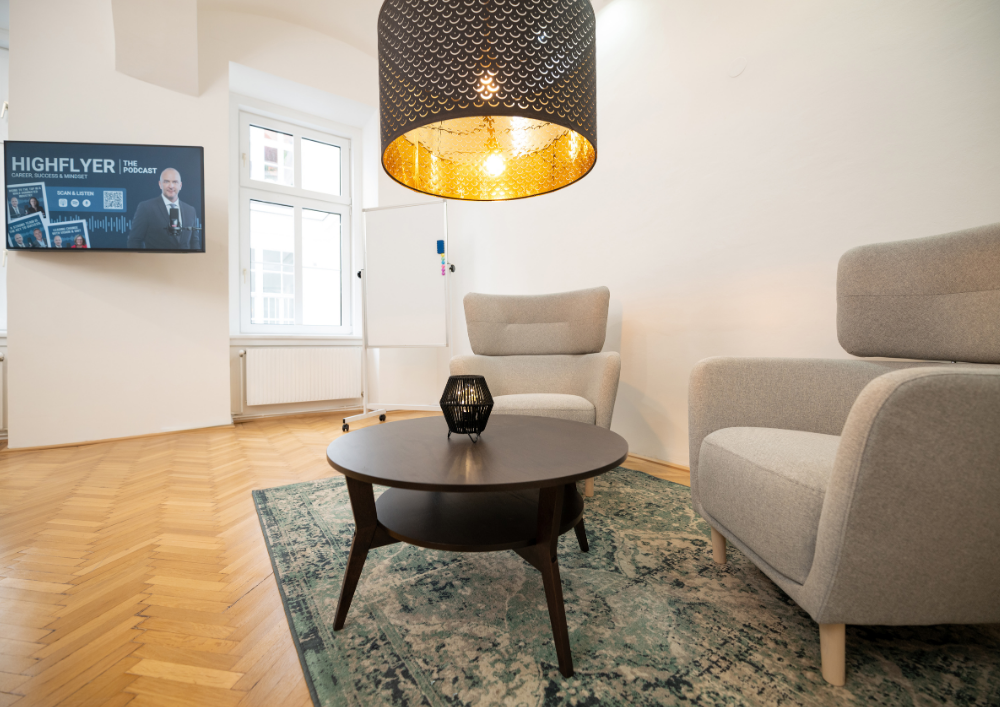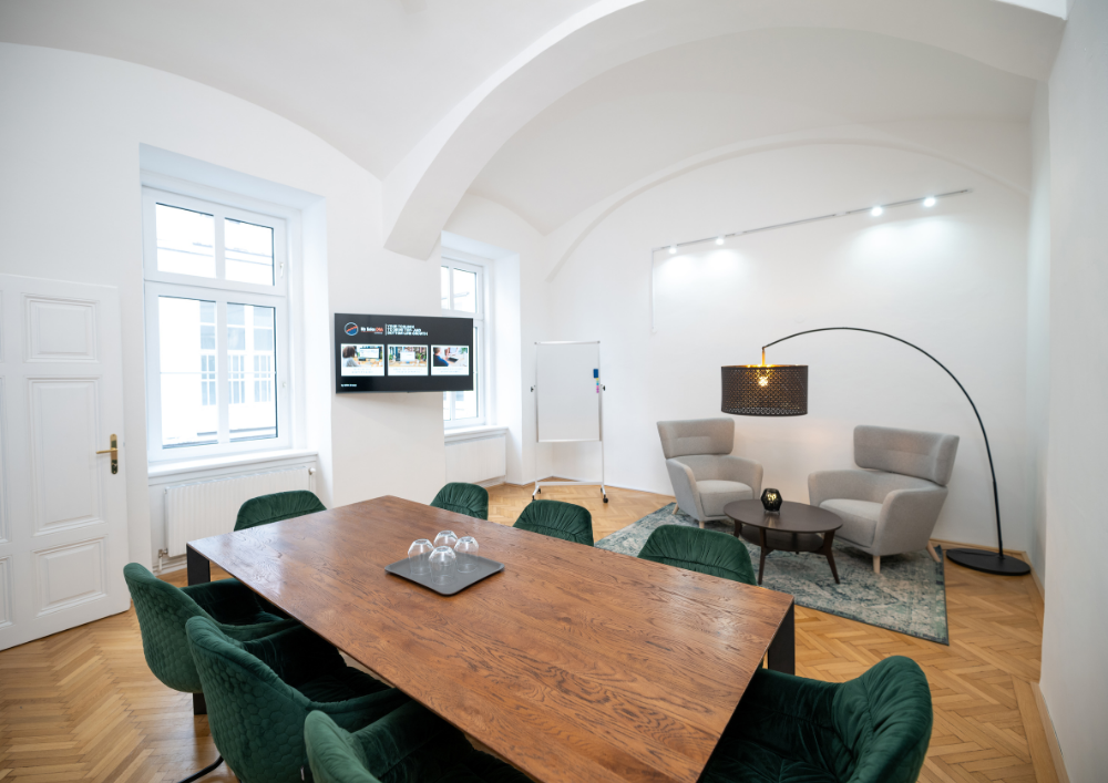 Der Raum ist mit TV-Screen, Whiteboard und Flipchart ausgestattet und eignet sich damit sowohl für klassische Besprechungen als auch interaktive Formate oder hybride Meetings. Zusätzliche Lounge-Sessel ermöglichen kurze Pausen oder Breakout-Momente abseits des Tisches. High-Speed WLAN ist ebenfalls inkludiert.