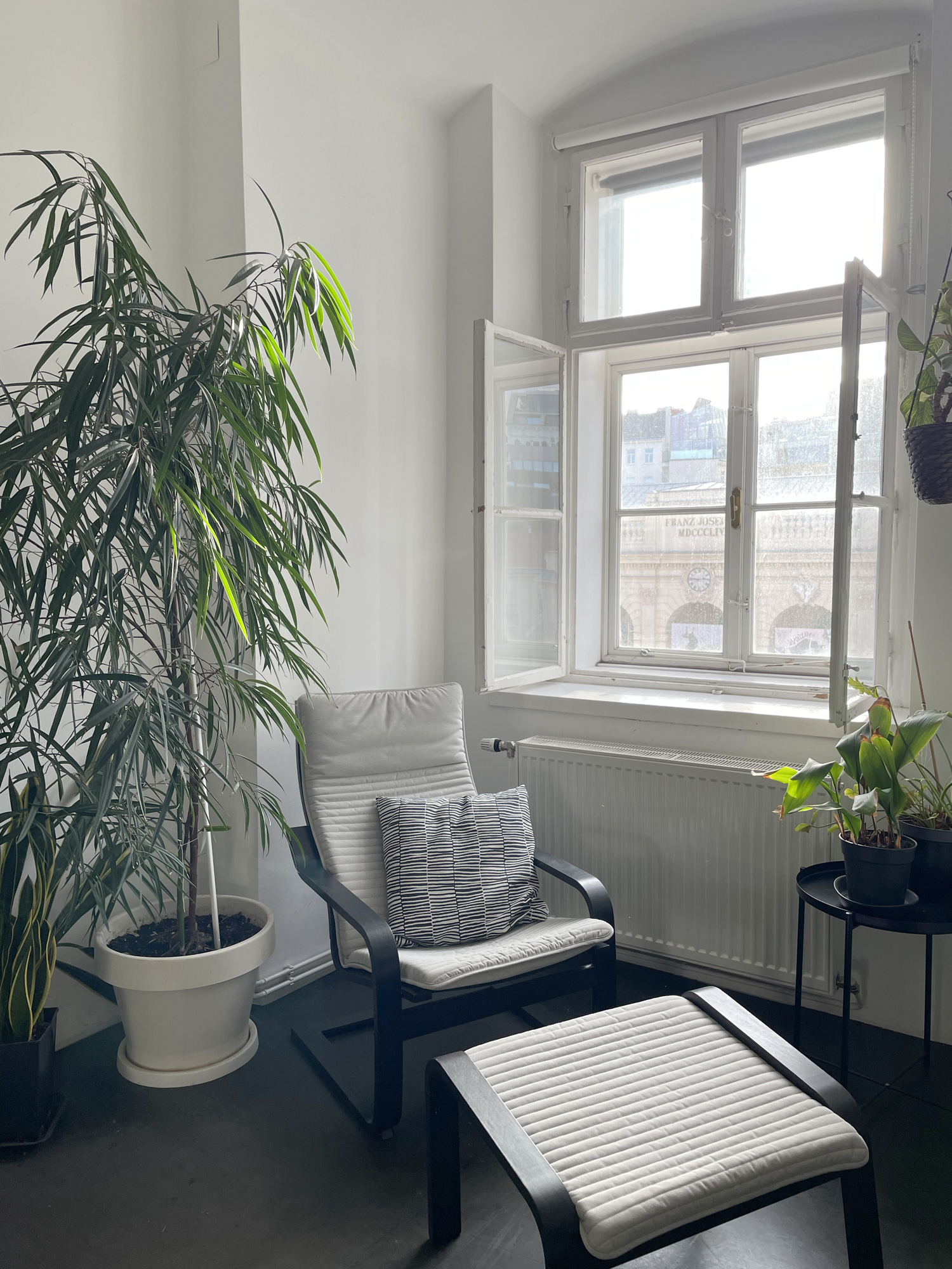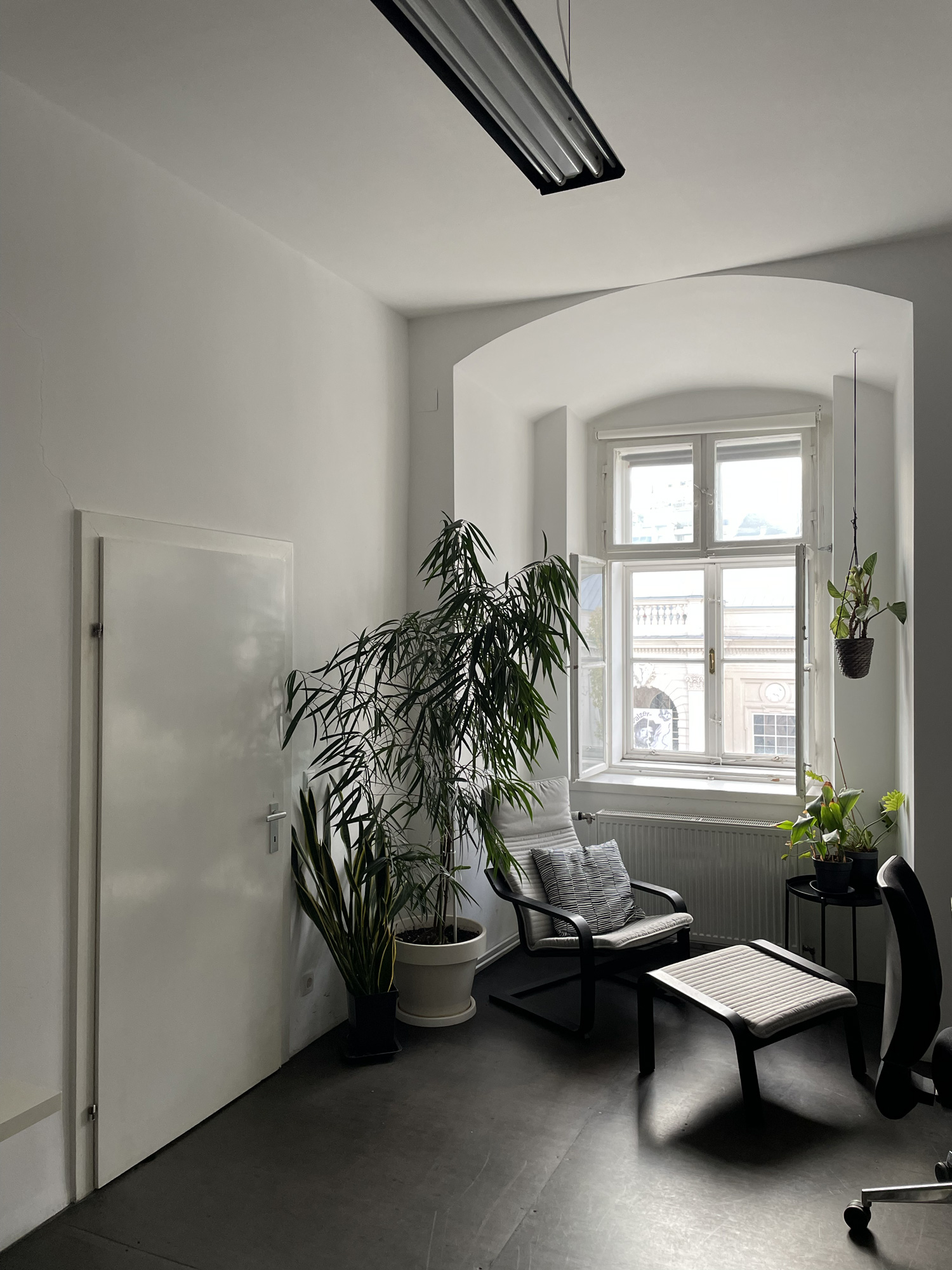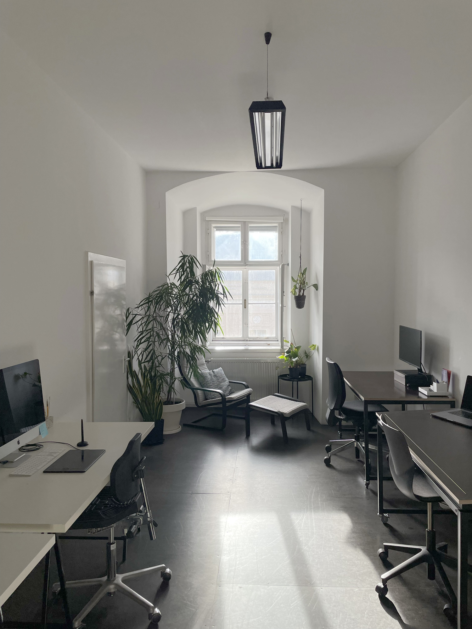 Unser schöner, minimalistischer Raum ist mit 5 fixen und 1 flexiblen Arbeitsplatz sowie einem von Pflanzen umrahmten Ruheplatz ausgestattet.