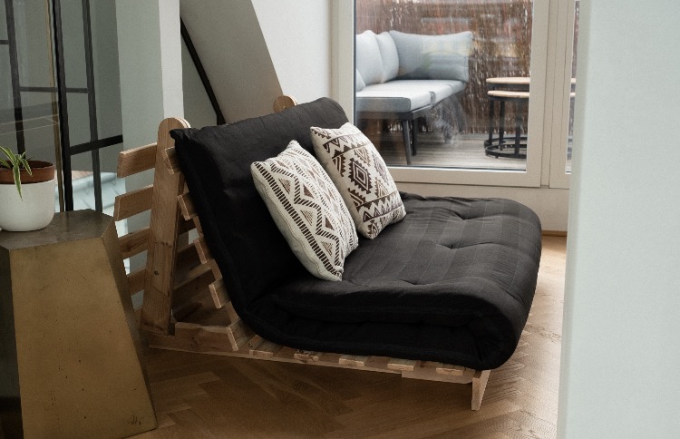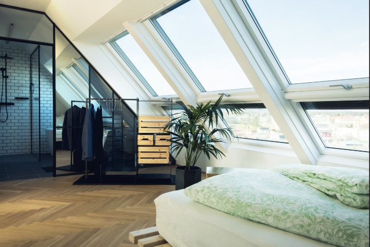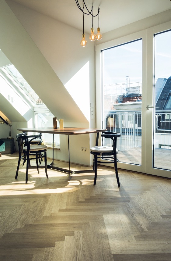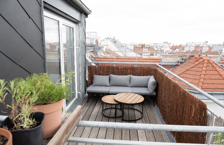 * Im Obergeschoss: Ausblick über ganz Wien, Doppelbett (denn das Loft wird auch über Airbnb vermietet ☺️), Badezimmer, Futon-Sofa und kleinen Schreibtisch sowie Fernsehbildschirm mit HDMI-Anschluss, Balkon mit Outdoor-Couch und Zugang zum geteilten Dach