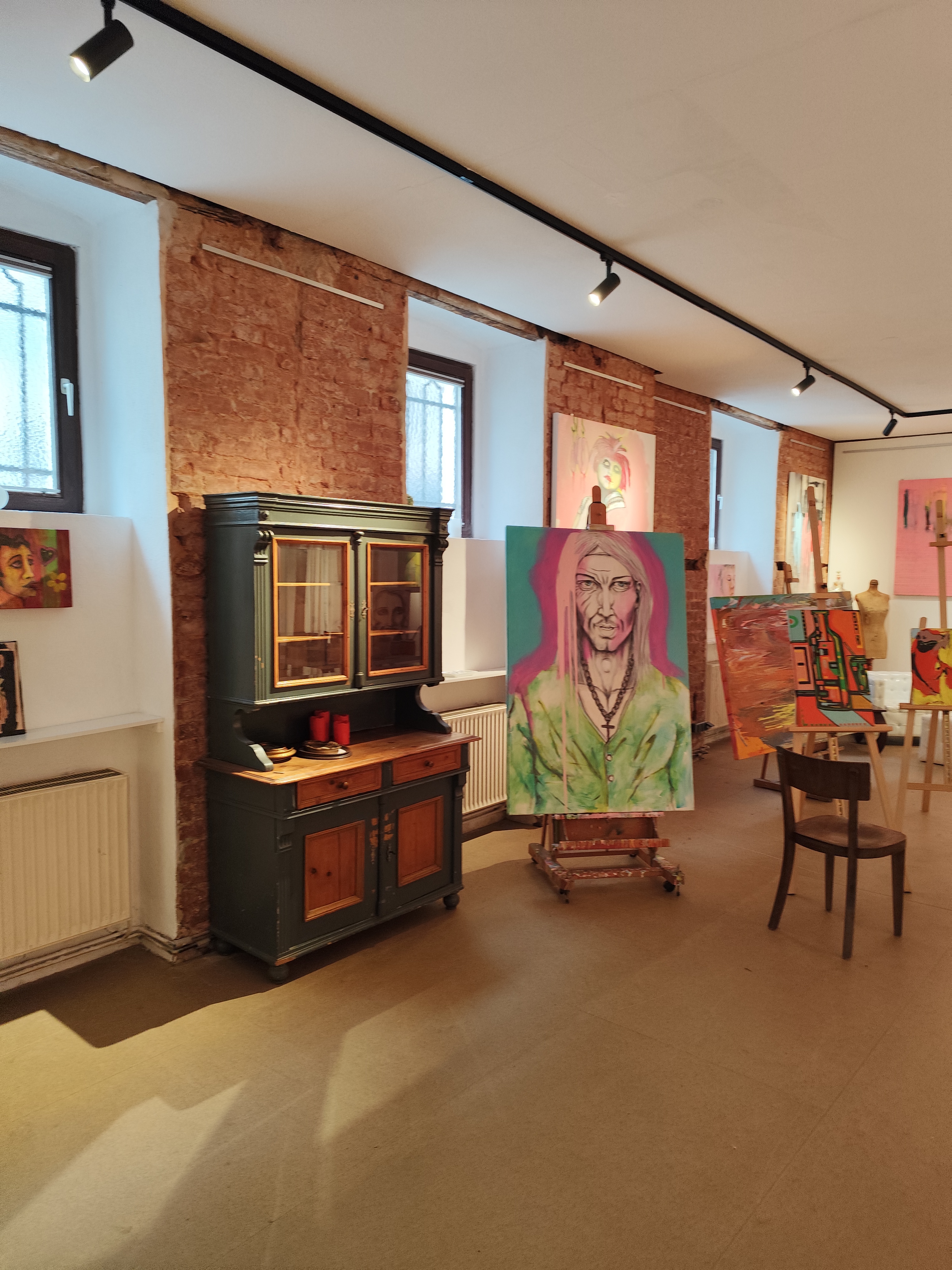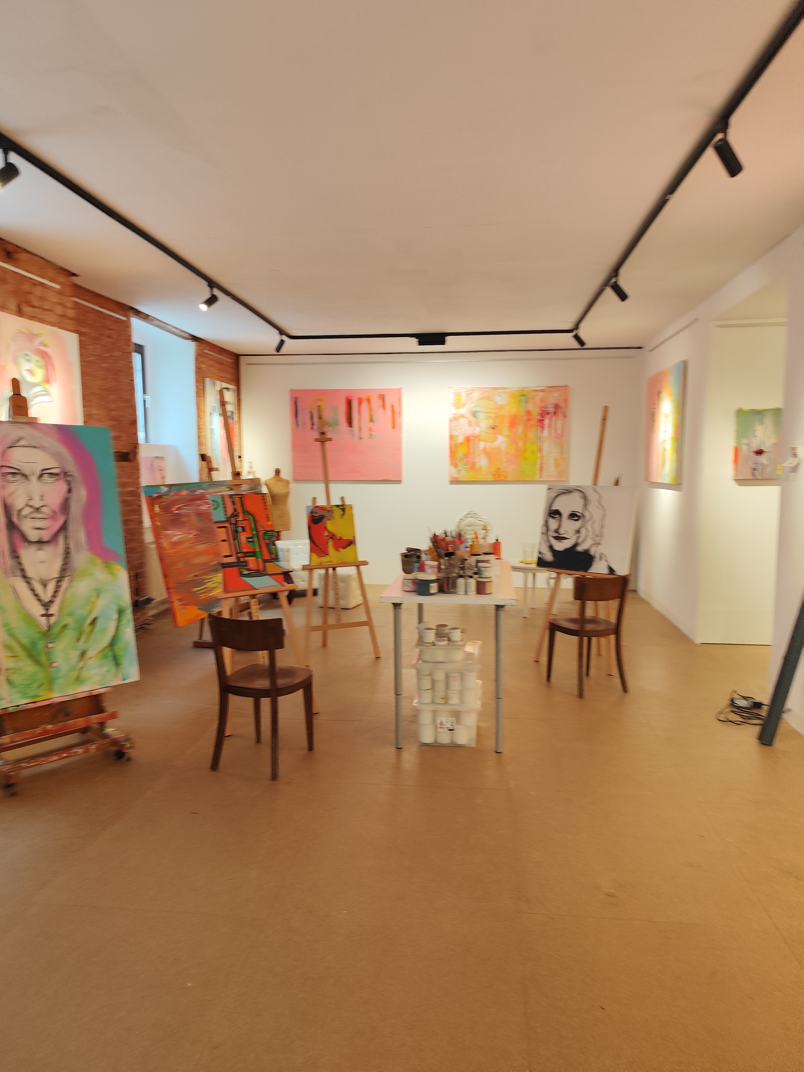 Eine kleine Küche samt Kühlschrank und Spüle, eine Toilette, Heizung, Möbel und eine Musikanlage sind ebenso vorhanden wie Galerieschienen, ein Beleuchtungssystem, Staffeleien und Basis-Malutensilien.