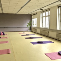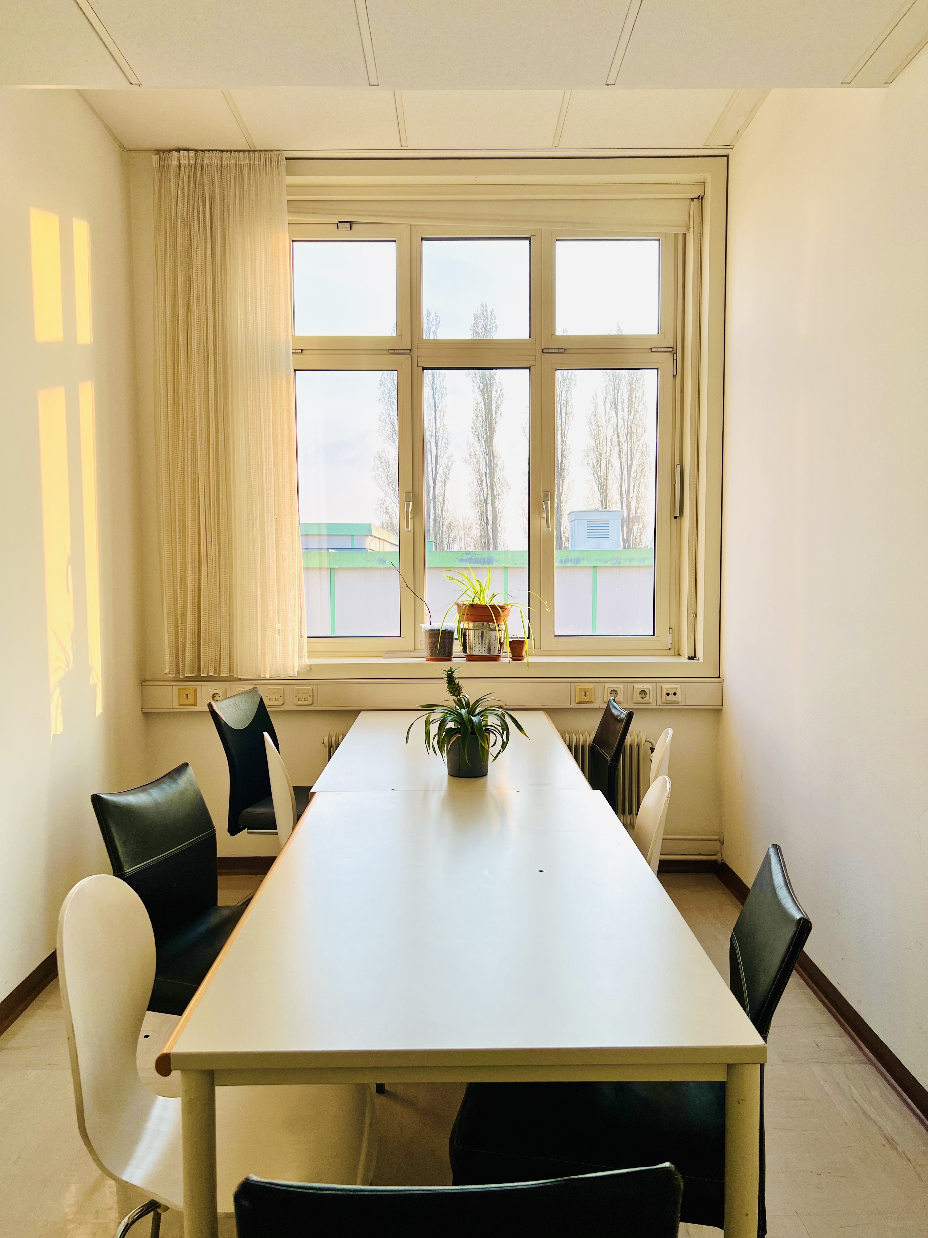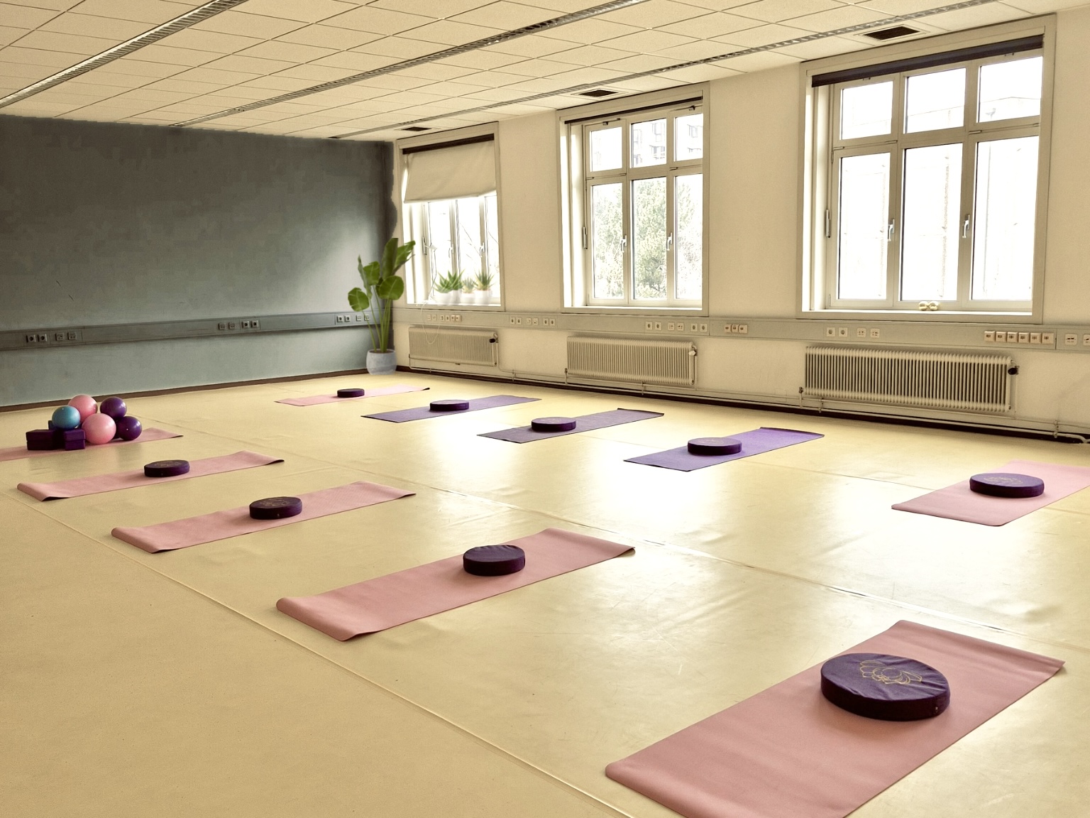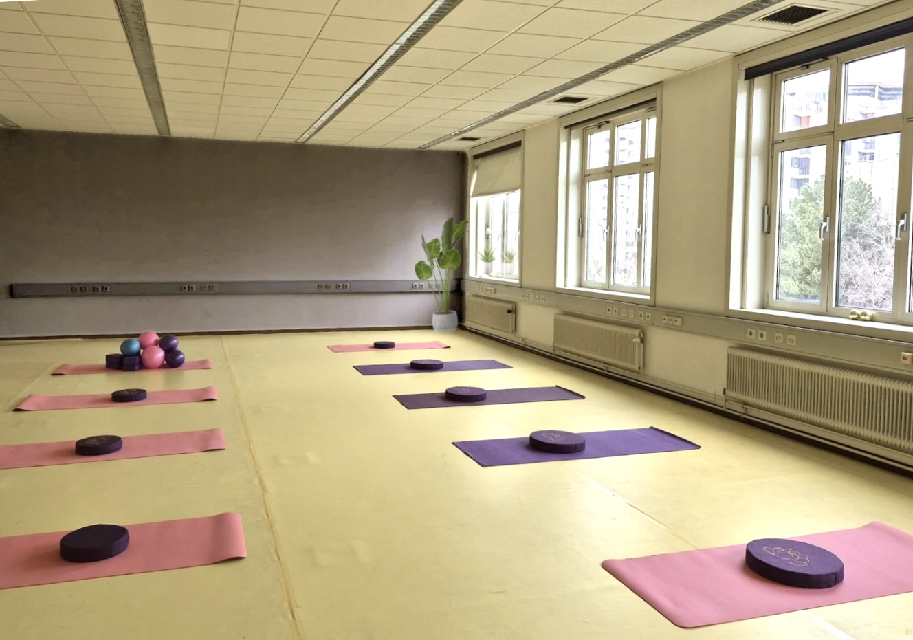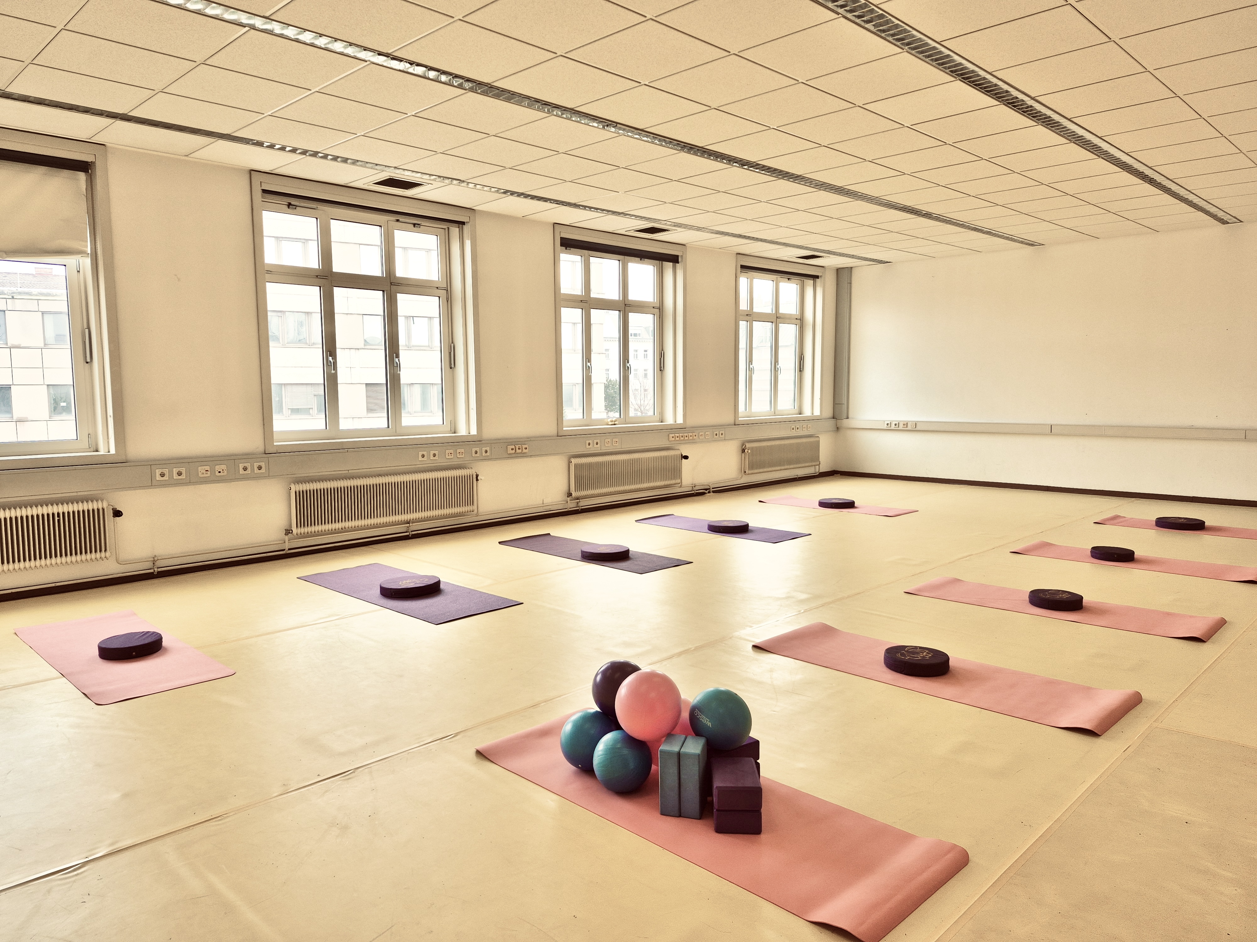 Der Saal befindet sich im 2. Stock in ruhiger und grüner Lage, ist warm und natürlich belichtet - ideal für konzentriertes Arbeiten, kreative Prozesse und körperliche Aktivitäten.