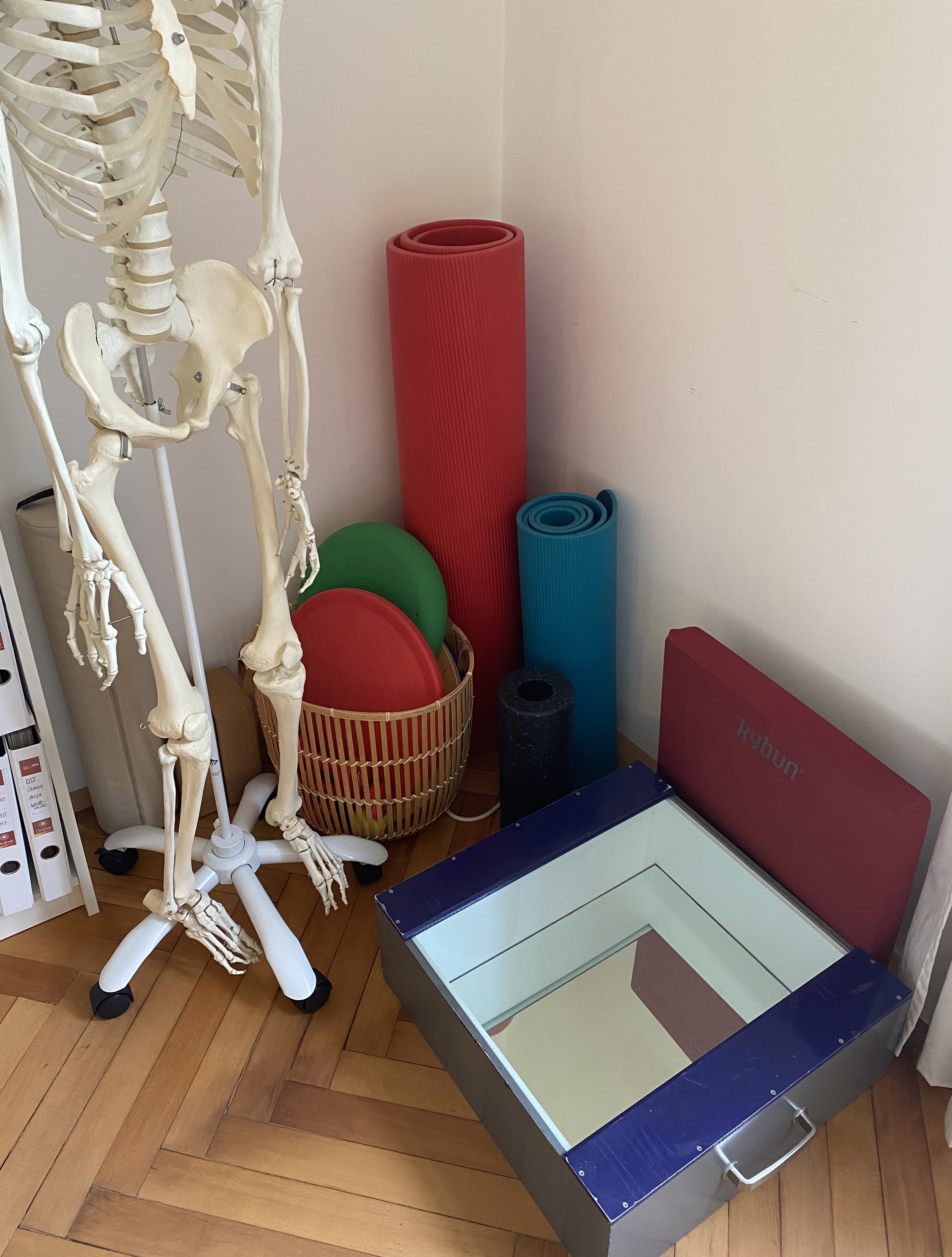 Physiotherapiebedarf wie Matten, Hanteln, Wackelbrett, Trampolin, Skelett etc...