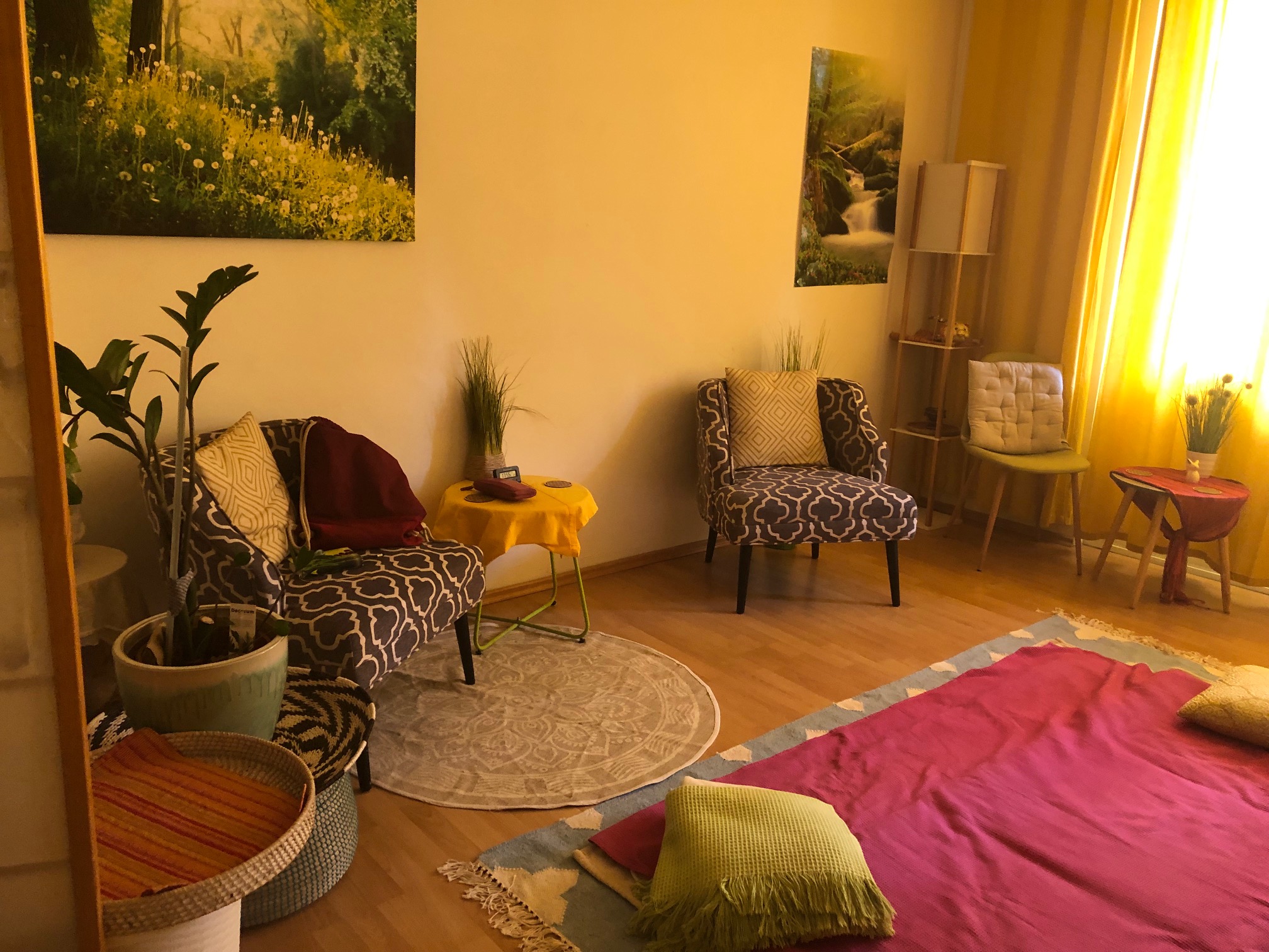Der Raum hat ca. 28 m2, ist sehr hell, freundlich, ruhig, nach Feng Shui eingerichtet und eignet sich für Gruppen sowie auch für Einzel-Settings.