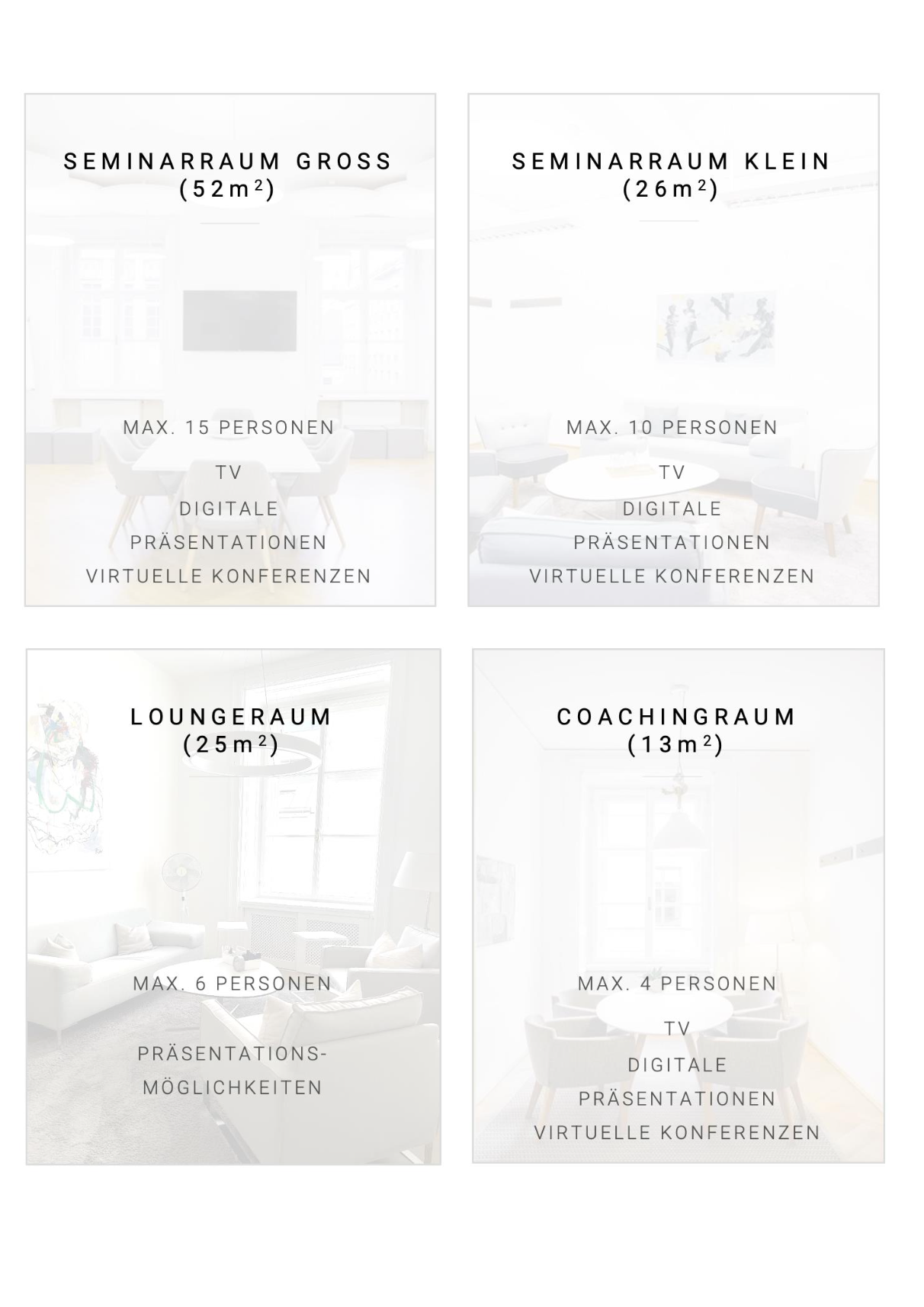 Wir bieten vier gleichwertige Räume zu einem Einheitspreis pro Raum an. Diese können genau auf Ihre Bedürfnisse angepasst werden (z.B. angenehme Loungestimmung oder klar strukturierte Umgebung). Die Größe unserer Räume variiert von 12-51 m2