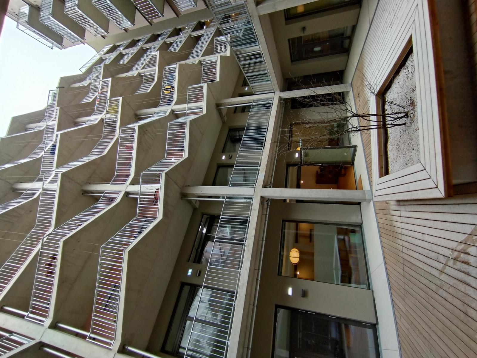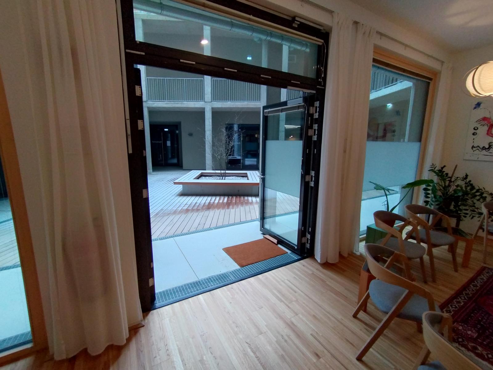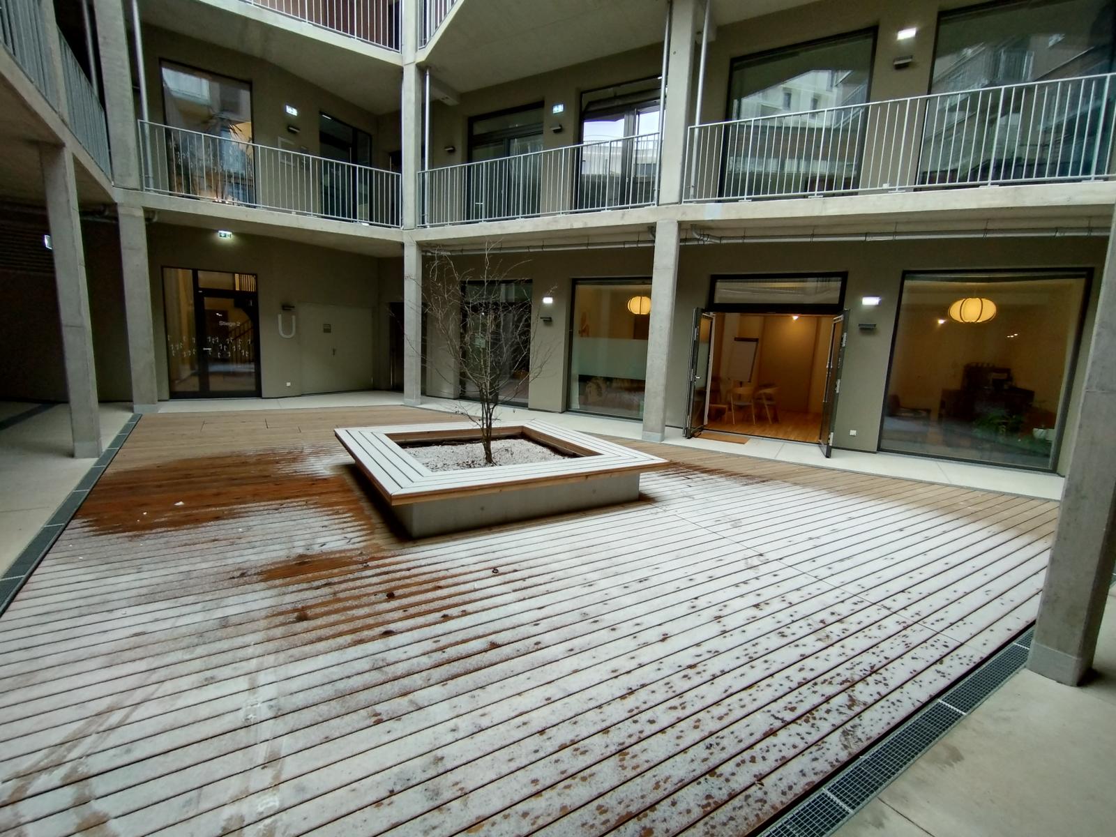 Der Raum ist sehr hell aufgrund einer großen Fensterfront in Richtung versunkenen Innenhof. Rund um den Raum sind nur Gewerbeflächen. Das heißt auch größere Lautstärke (Proberaum, Theater, ...) ist möglich.