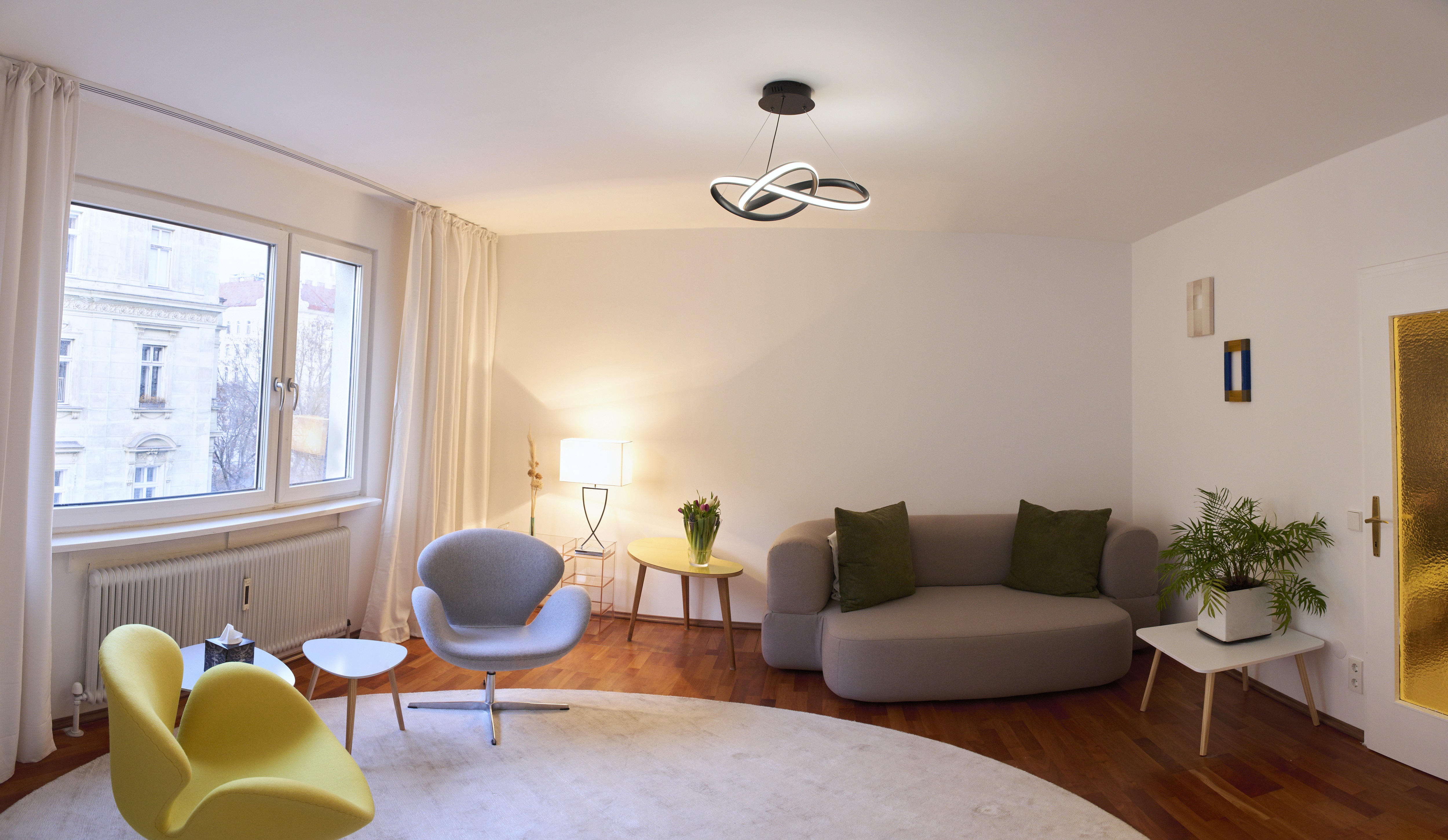 Der 20m² große Praxisraum ist direkt vom Vorraum aus zugänglich. Er ist zur Liniengasse ausgerichtet und eröffnet den Blick teilweise auf die grünen Baumwipfel des Loquaiparks, teils auf attraktive Gründerzeitgebäude. Die Ausrichtung nach Nord-Westen garantiert freundliche Nachmittagssonne bei dennoch moderaten Raumtemperaturen in der warmen Jahreszeit. Ab Sommer 2026 wird es eine Klimaanlage geben, um allen Bedürfnissen gerecht zu werden.
