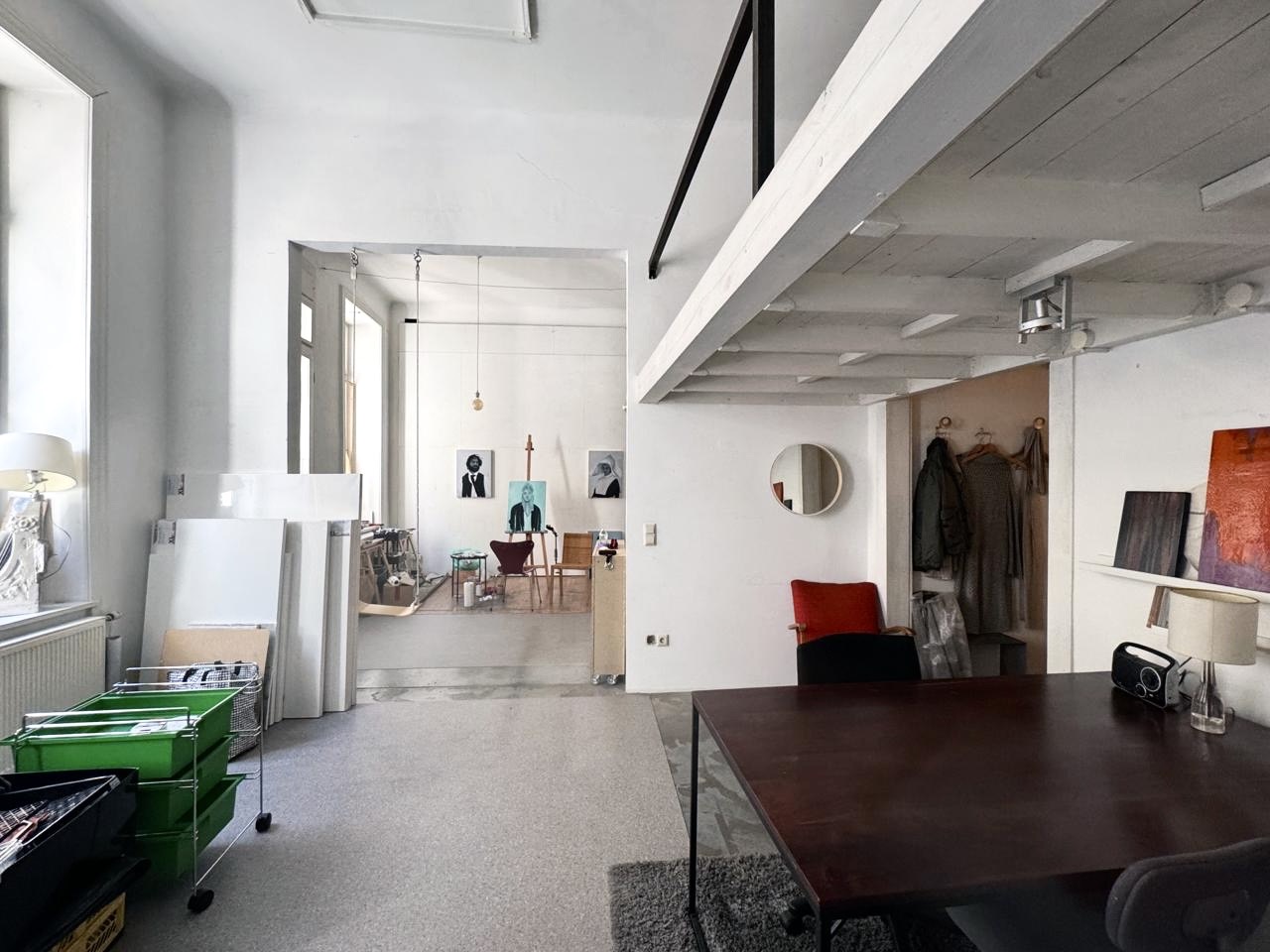 Hier findest du Platz für dein kunst - und kunsthandwerkliches Schaffen. Mit offener Raumlösung im großzügiger Raumstimmung läßt es sich ideal arbeiten. Durchschnittlich sind es 3-4 Schaffende mit unterschiedlichen Anwesenheitszeiten. Momentan ist ein Arbeitsplatz frei. Melde dich gerne. Vielleicht haben wir genau den richtigen Arbeitsort für dich!