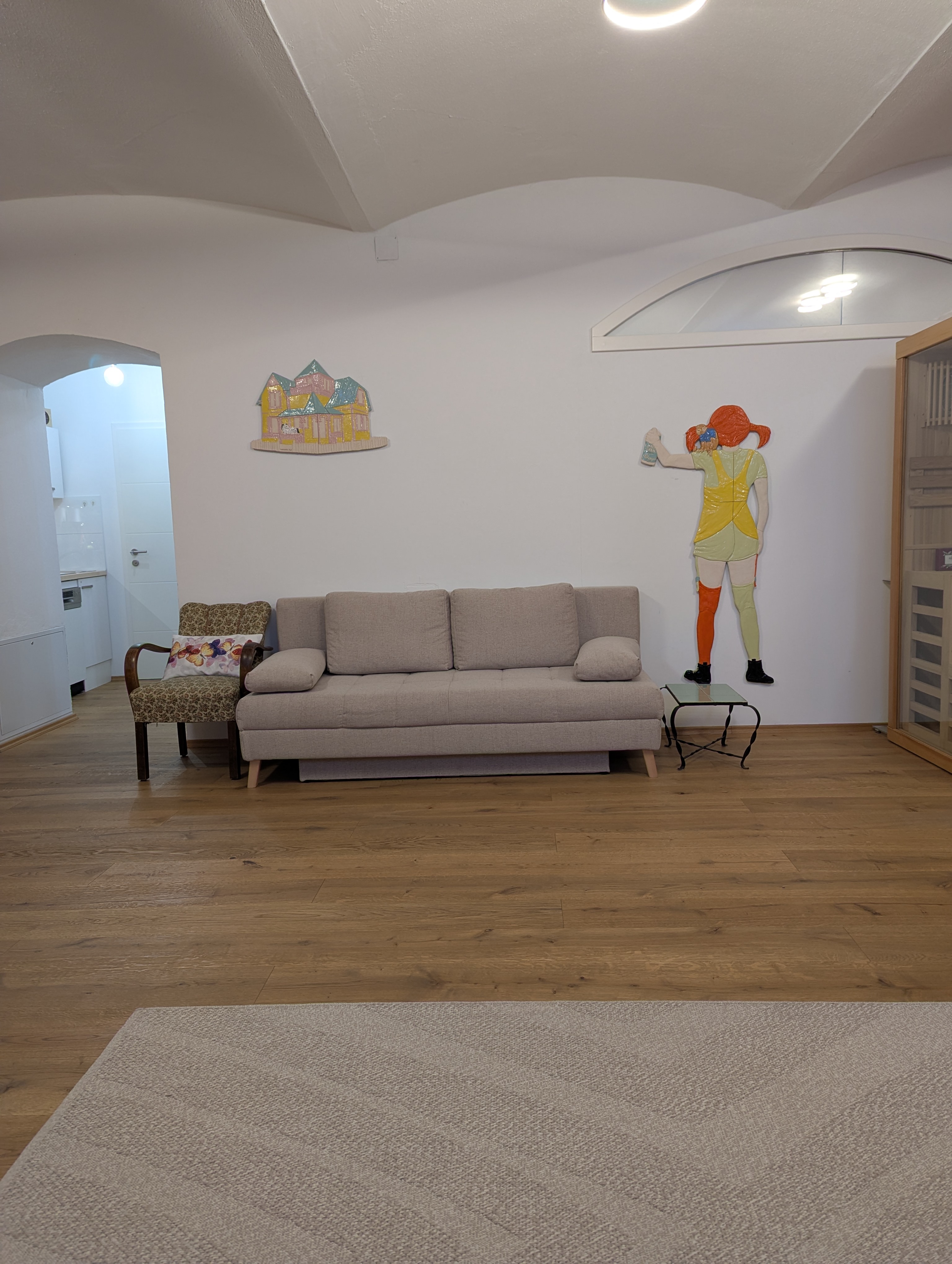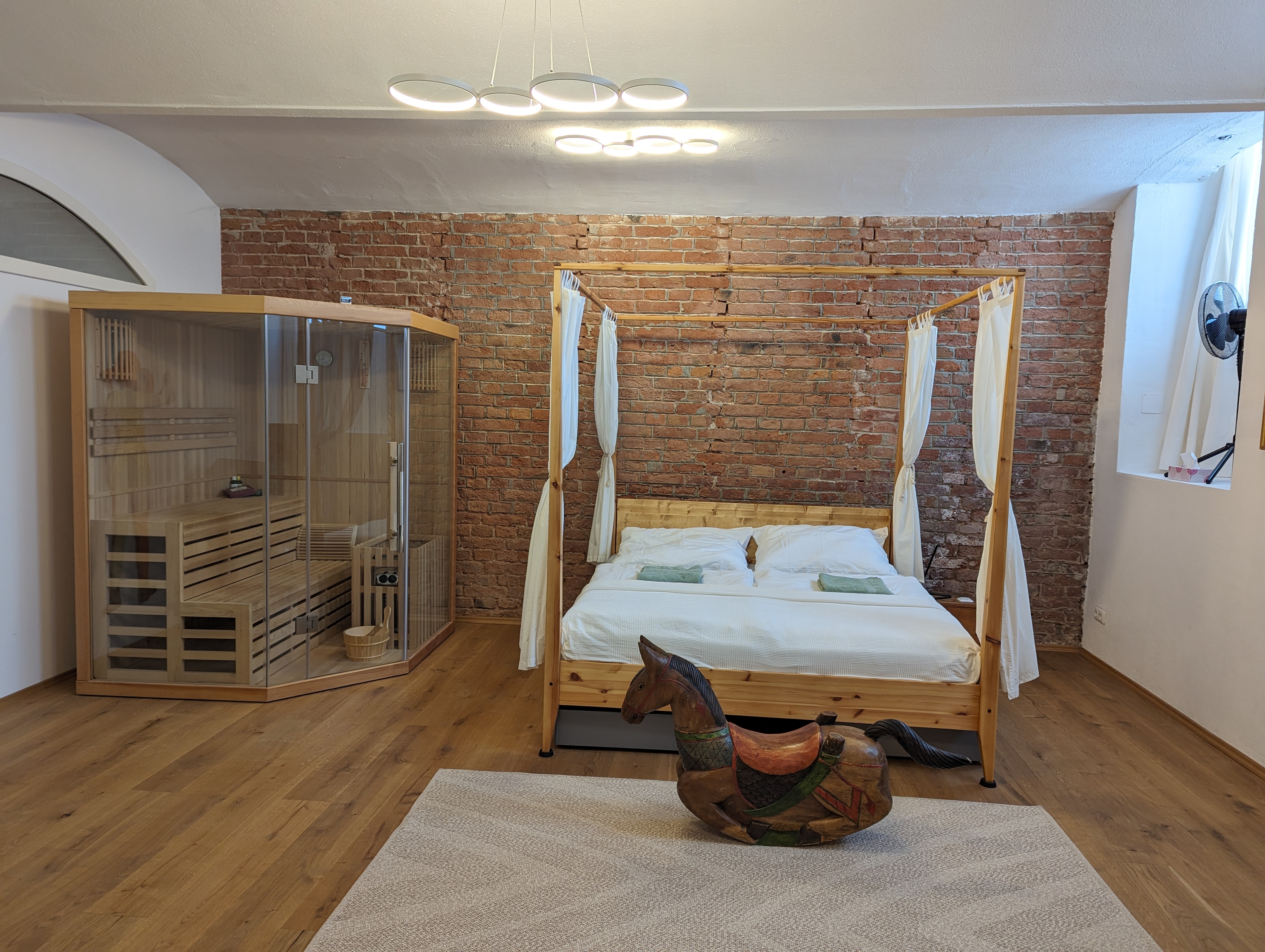 Das 48 m² große Loft kann vormittags von 9:30 bis 15:00 Uhr angemietet werden und besticht durch seine ruhige und gemütliche Atmosphäre. Es verfügt über Internet, TV, Netflix, Disney+, eine kleine eigene Küche mit Induktionsherdplatte, Kühl-Gefrierschrank und Mikrowelle, ein Badezimmer mit Walk-in-Dusche sowie eine eigene Sauna für bis zu 4 Personen.
