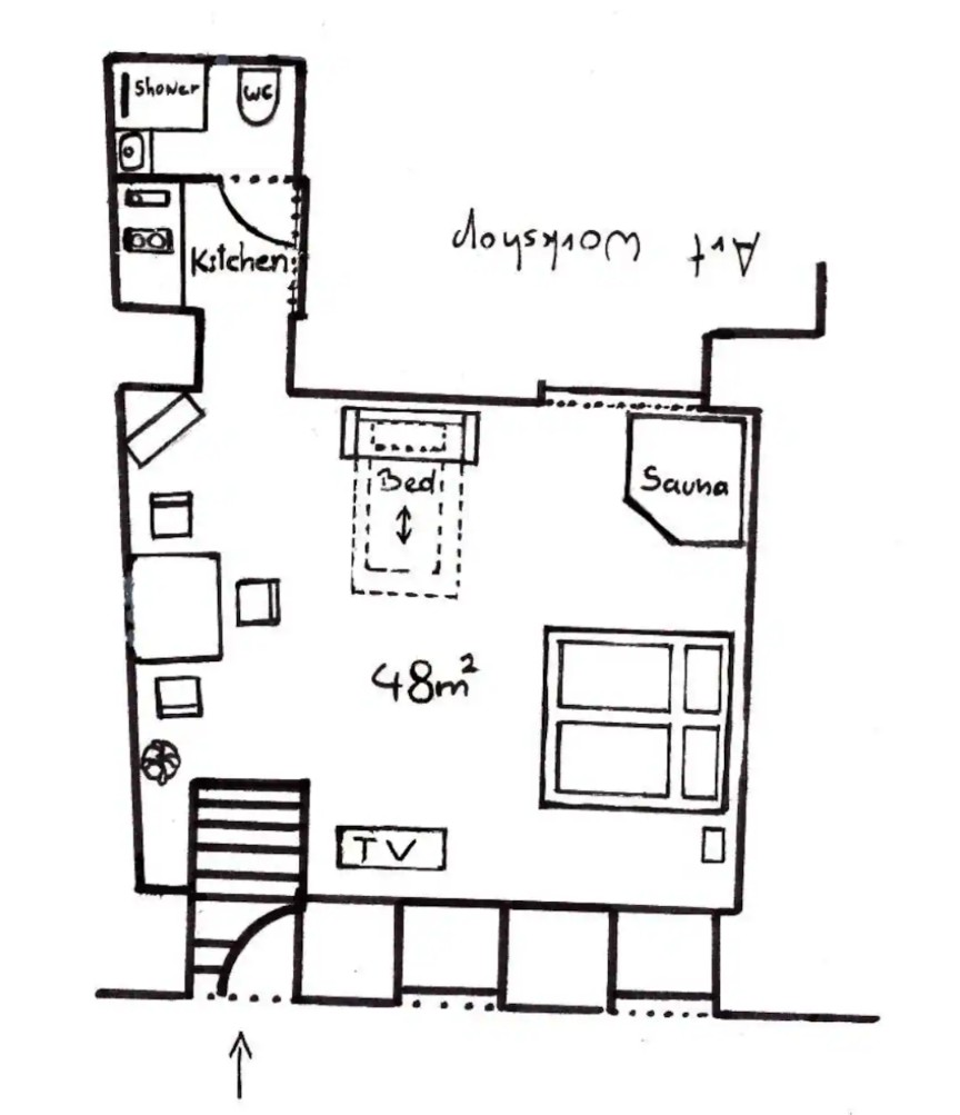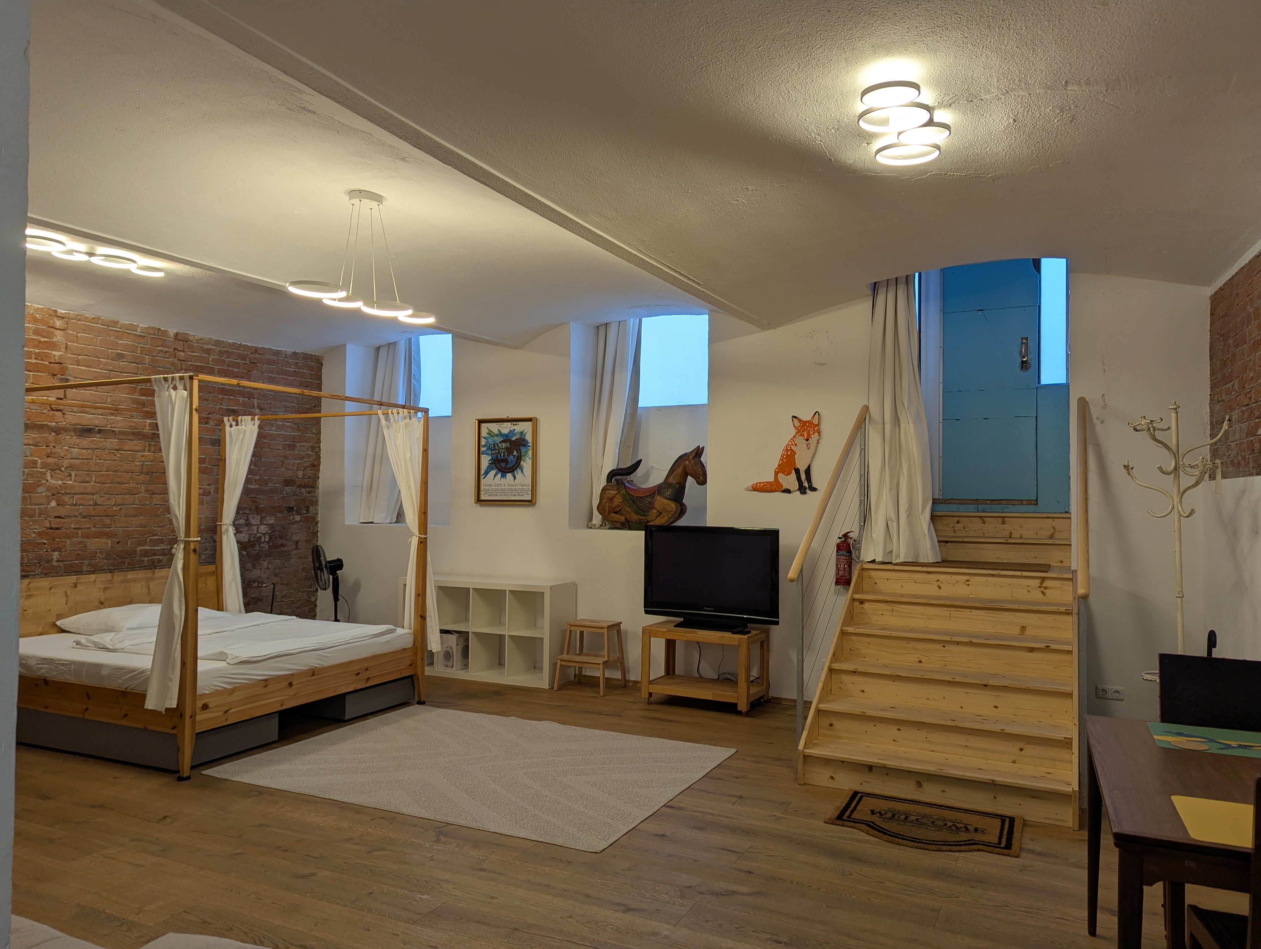 Das Loft ist ein separat begehbarer Teil eines größeren Künstlerinnenateliers. Es verfügt über einen eigenen privaten Zugang von der Straße, der direkt über eine Treppe ins Loft führt.