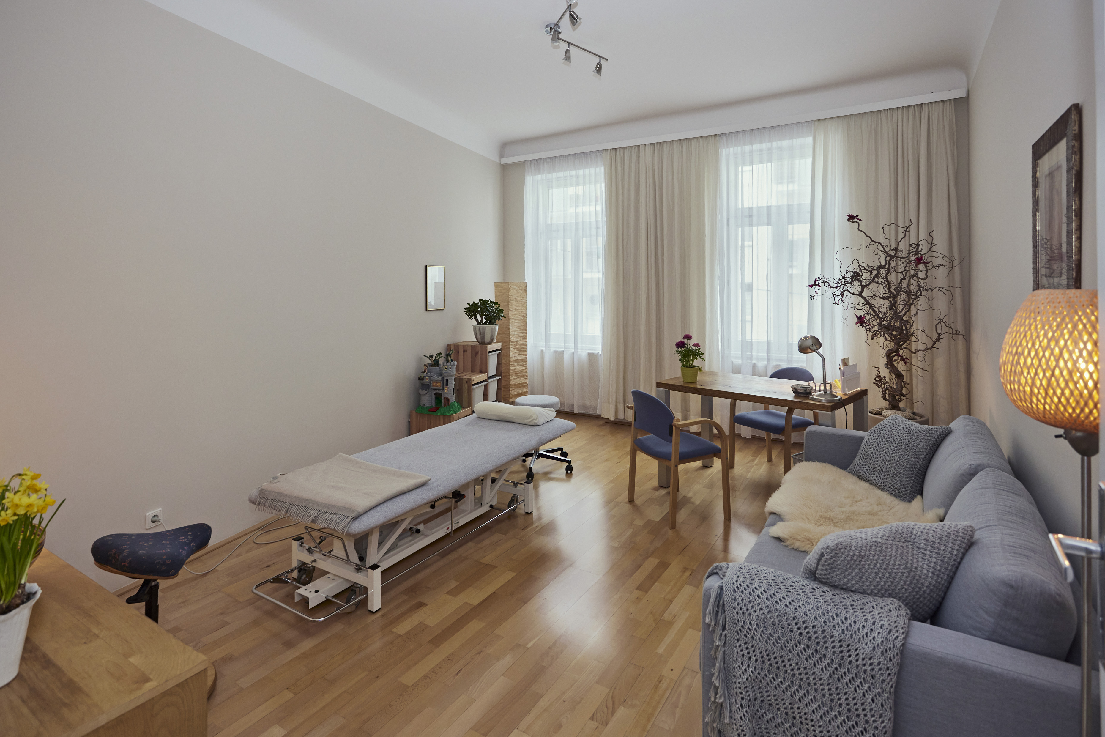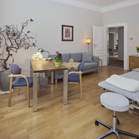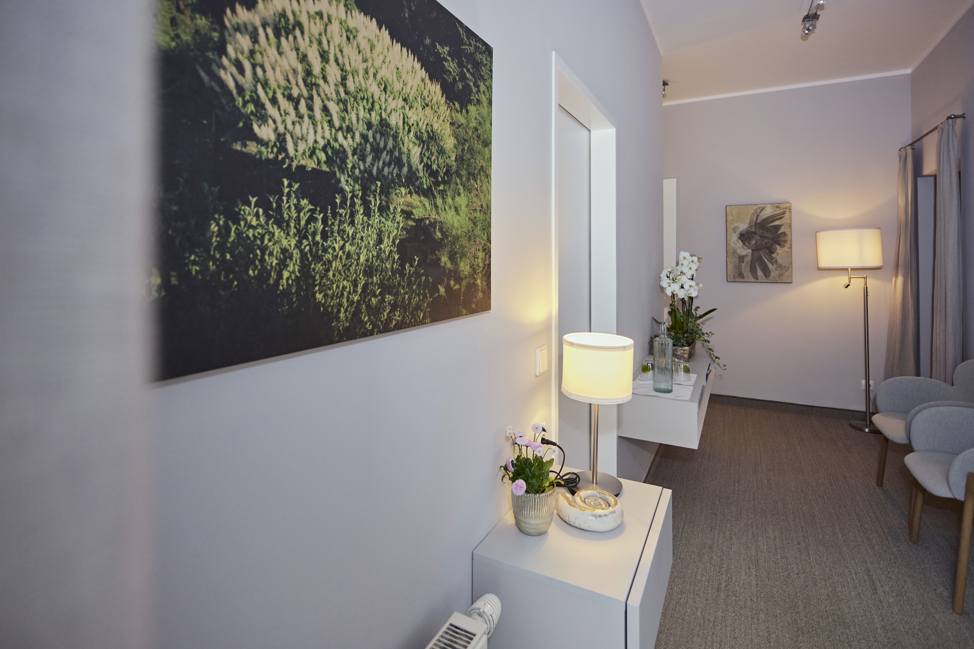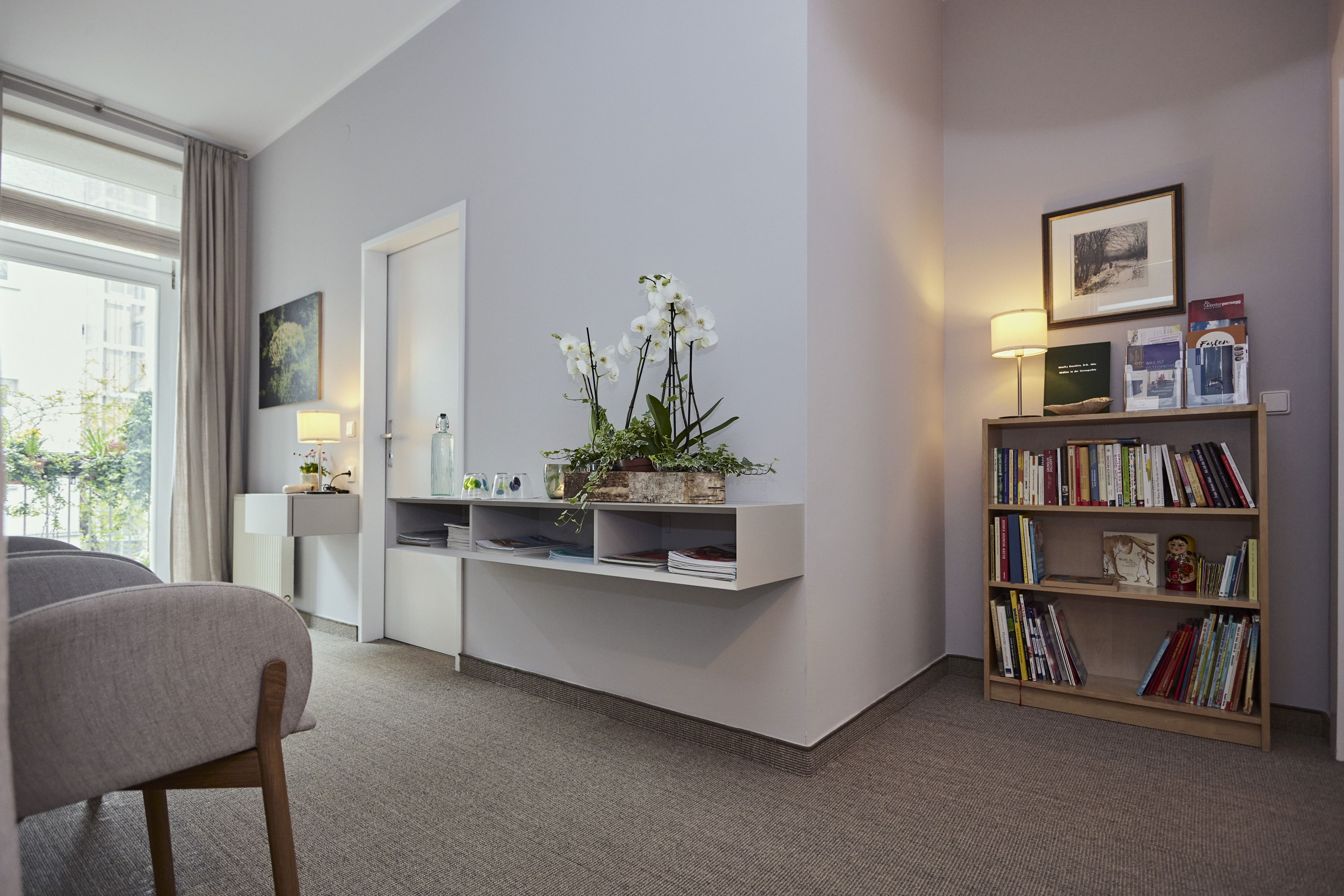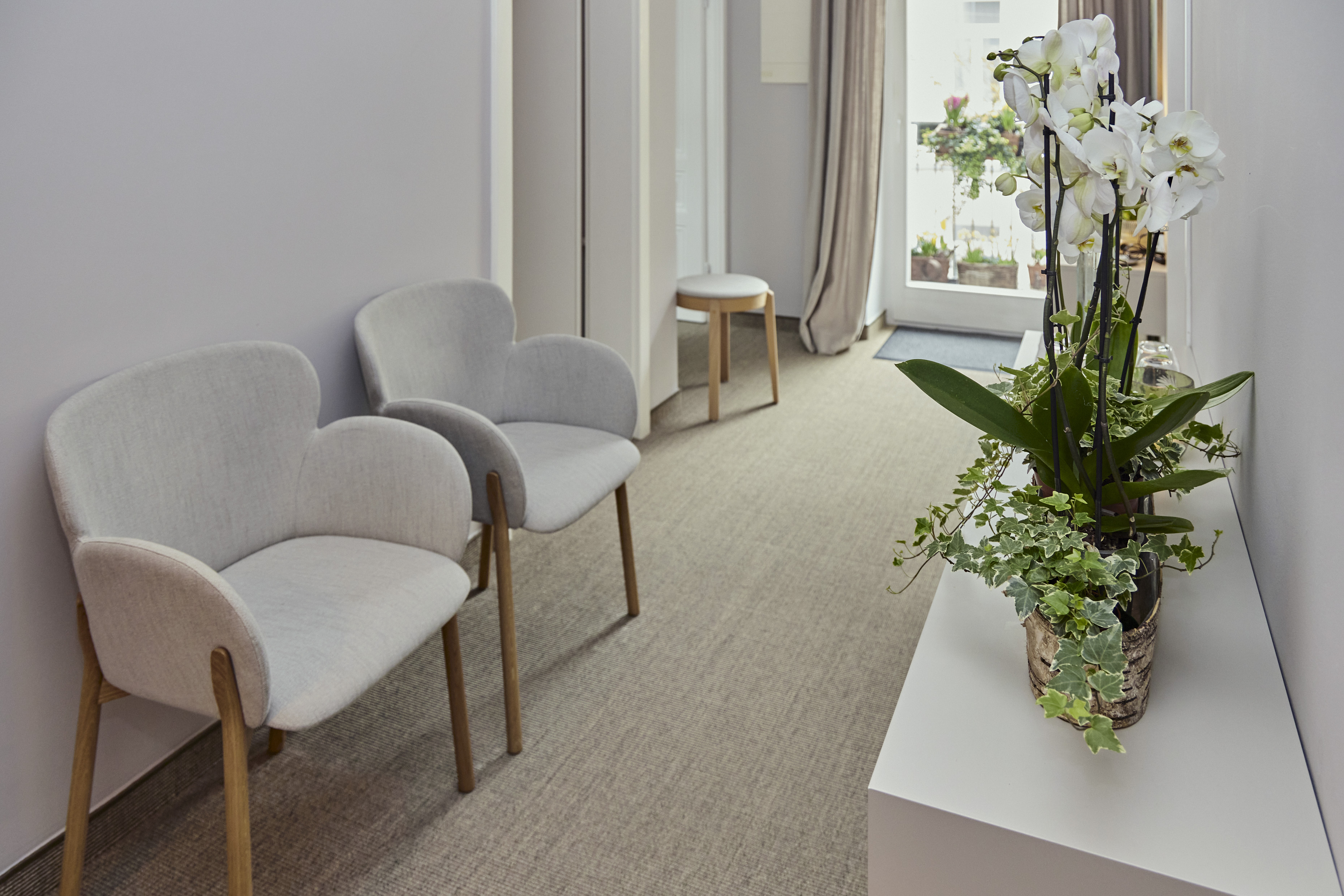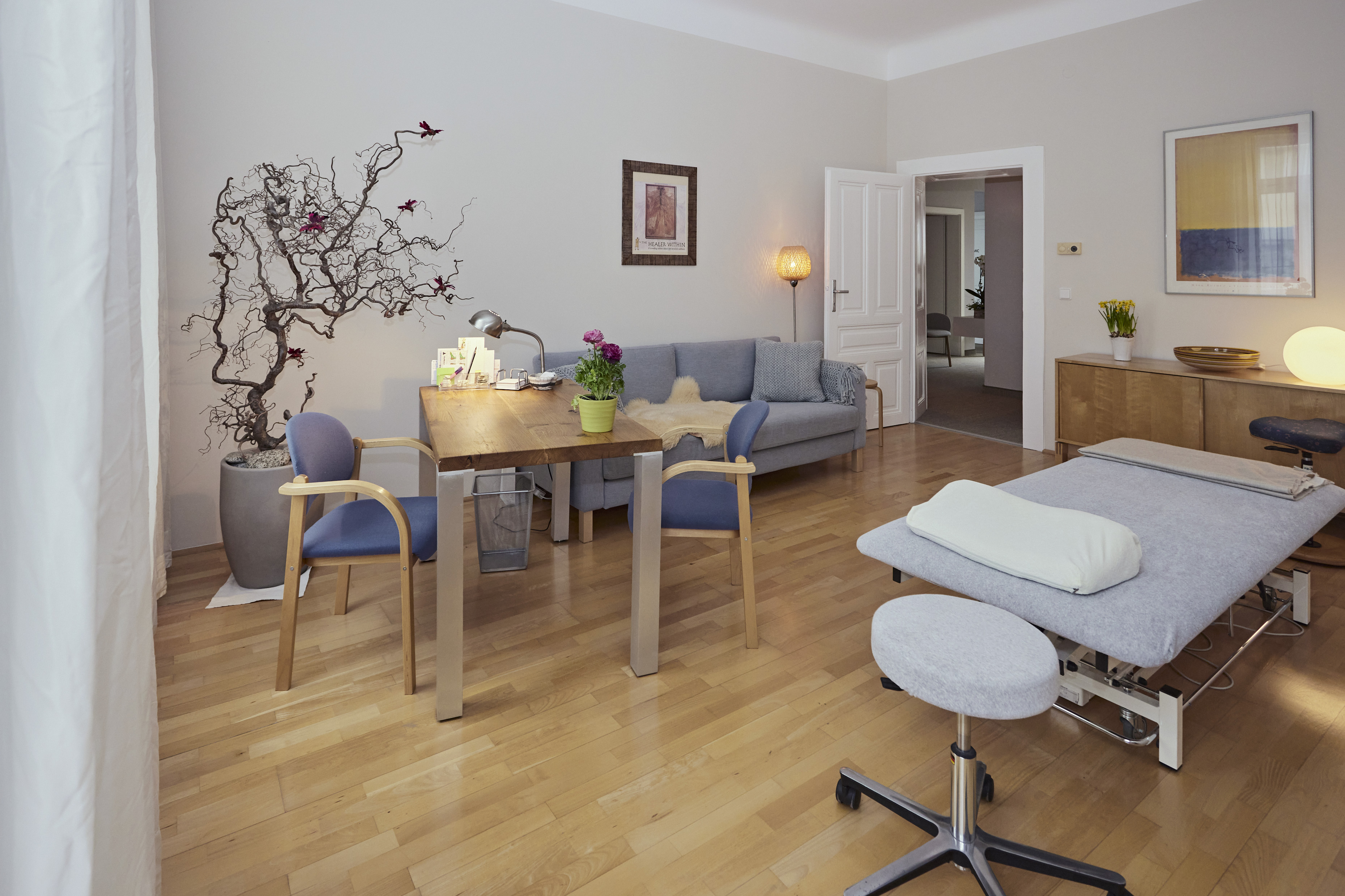 Die Praxis, die vor kurzem komplett renoviert wurde, befindet sich im ersten Stock eines Altbaus (6 Stufen, danach Lift) und ist mit einem Parkettboden ausgestattet.