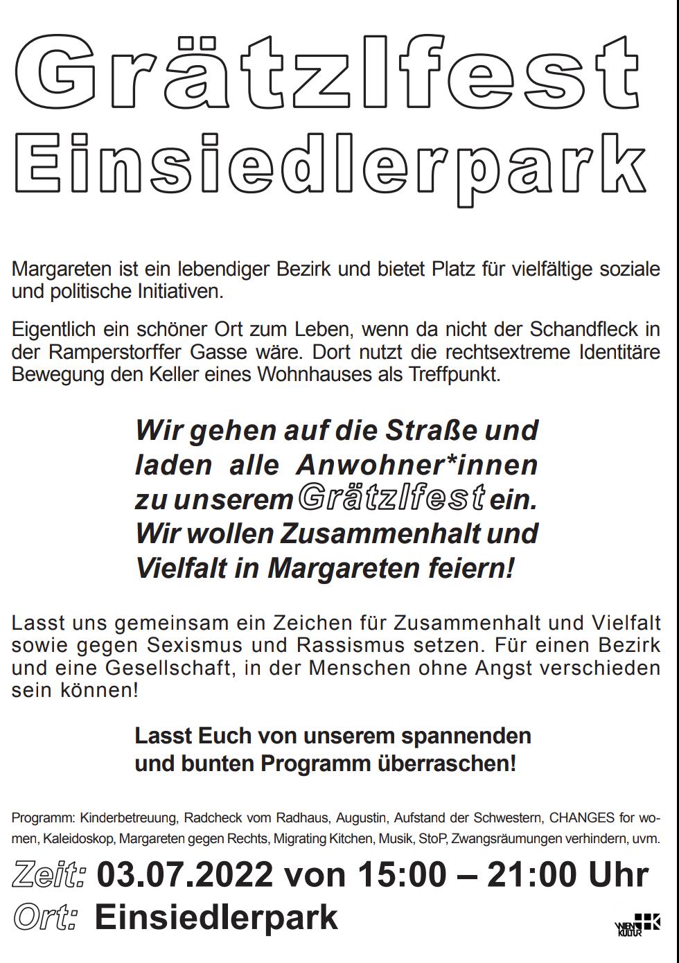 Margareten ist ein lebendiger Bezirk und bietet Platz für vielfältige soziale und politische Initiativen. Wir gehen auf die Straße und laden alle Anwohner*innen zu unserem Grätzlfest ein. Wir wollen Zusammenhalt und Vielfalt in Margareten feiern! Lasst uns gemeinsam ein Zeichen gegen Sexismus und Rassismus setzen. Für einen Bezirk und eine Gesellschaft, in der Menschen ohne Angst verschieden sein können.